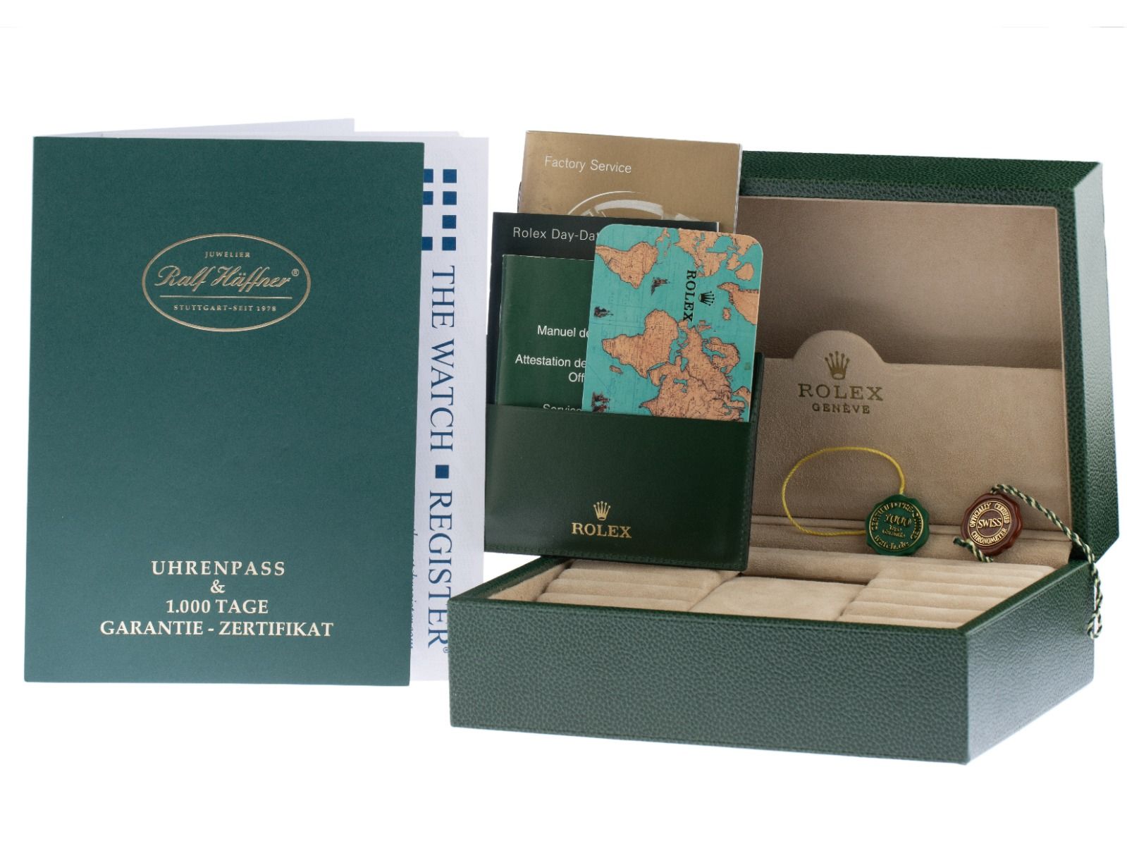 Inklusive certified pre owned Siegel / Uhrenpass mit einem Farbbild, der genauen Beschreibung sowie dem Wiederbeschaffungswert der Uhr über 36500,-€ und 1000 Tage Garantie ab Kaufdatum.
