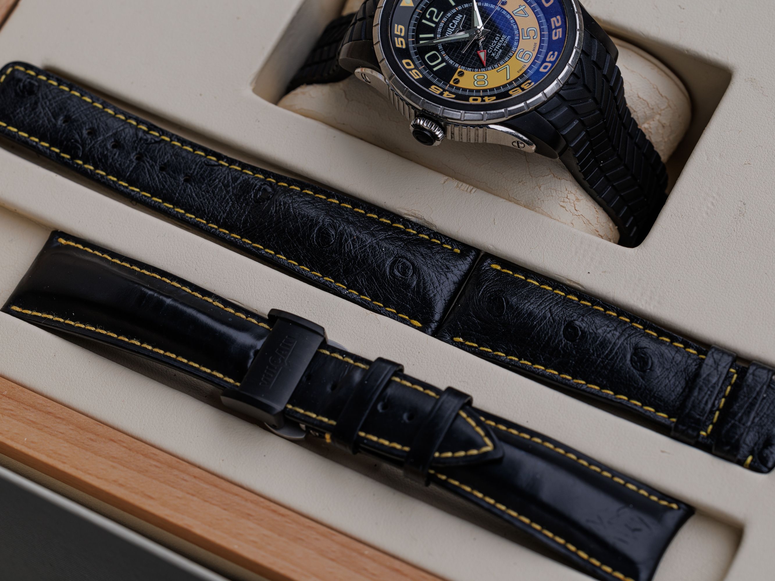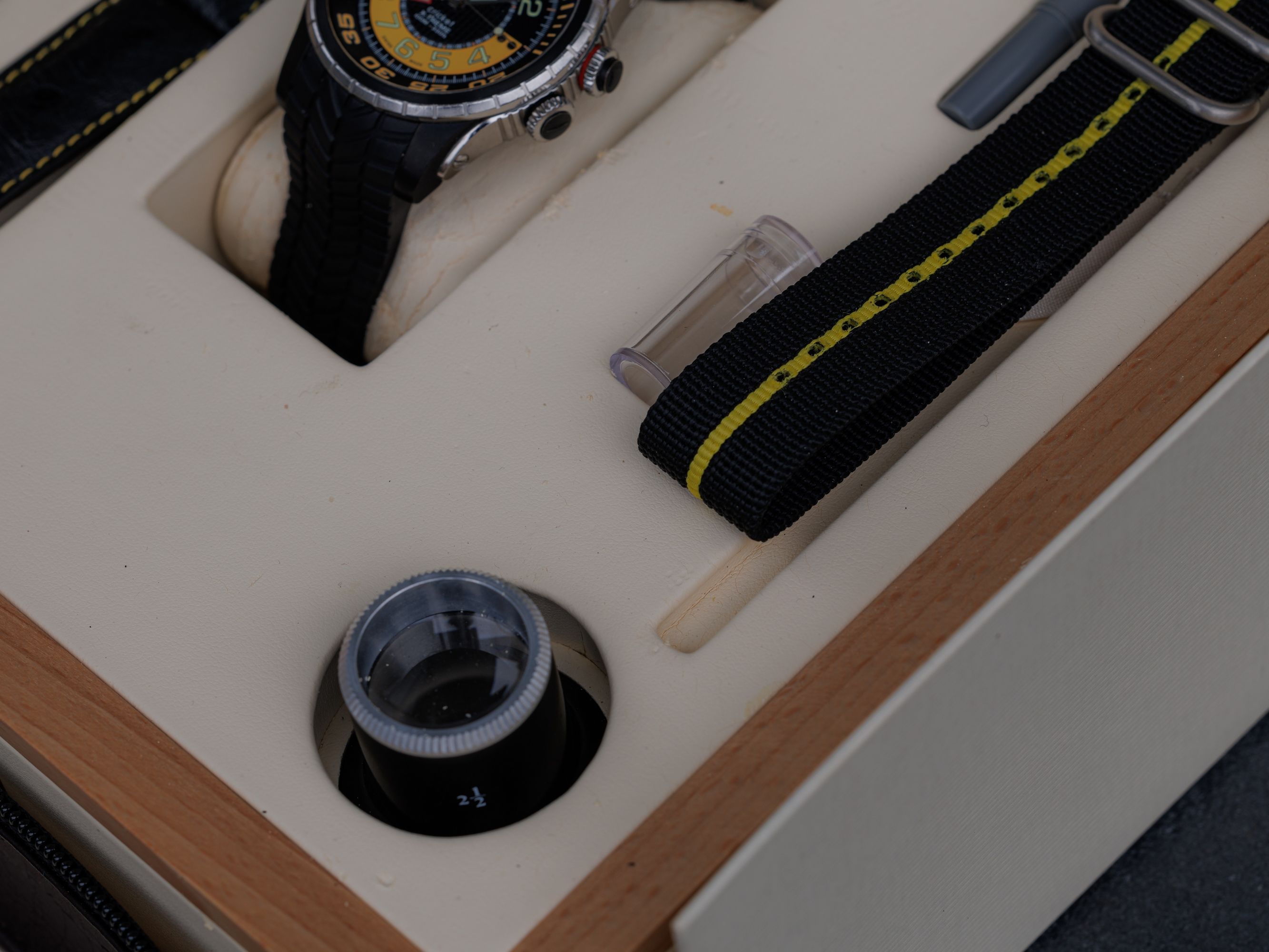 The offered model has all the boxes and documents. There are additional straps, a magnifying glass, a decorative box (the inner layer is peeling off a bit) and an additional NATO strap (the tool for changing straps is missing). Very good condition, only minor signs of wear.