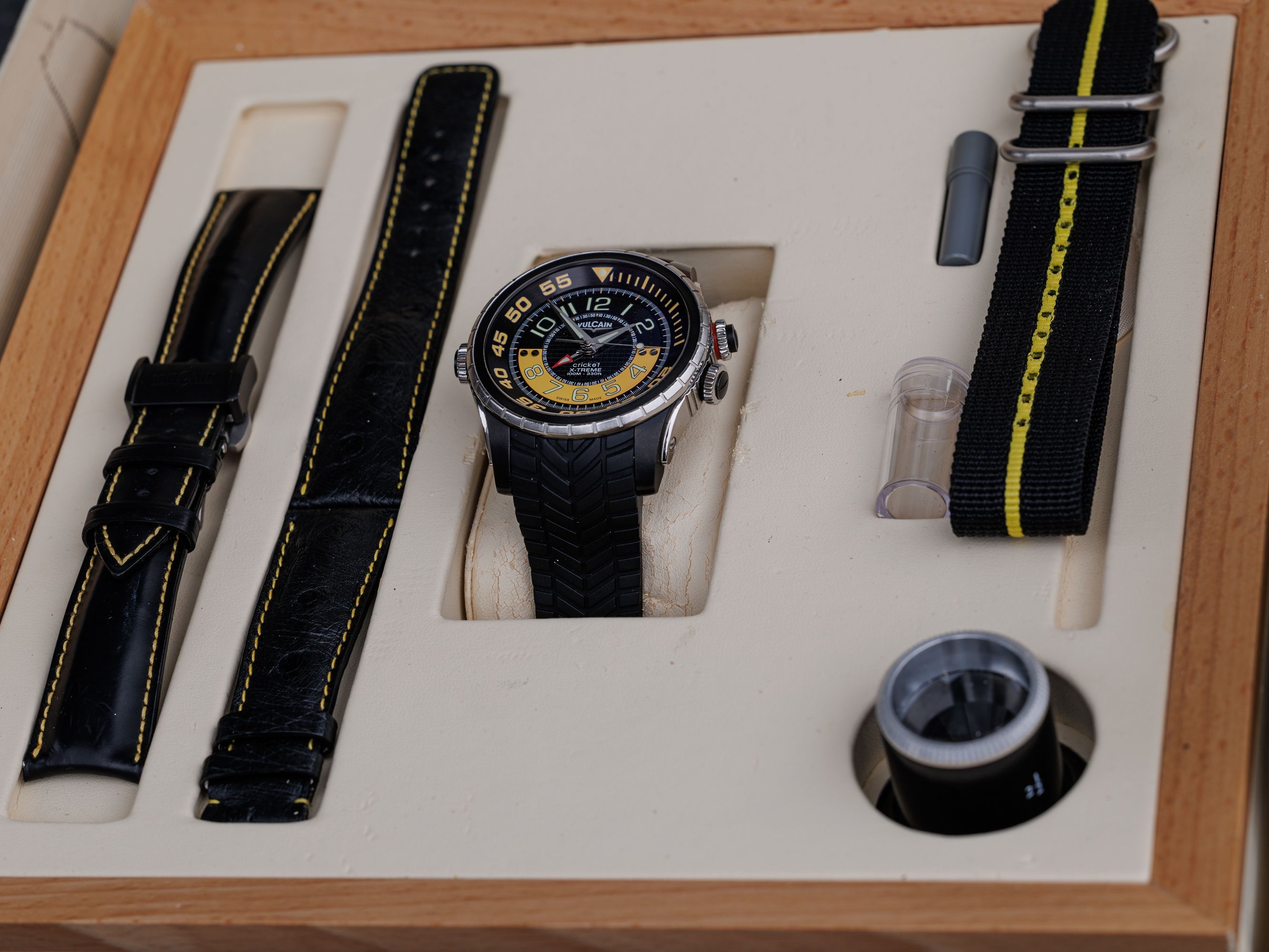 Il modello offerto ha tutte le scatole e i documenti. Ci sono cinturini aggiuntivi, una lente d'ingrandimento, una scatola decorativa (lo strato interno si sta un po' sfaldando) e un cinturino NATO aggiuntivo (manca l'attrezzo per cambiare i cinturini). Ottime condizioni, solo lievi segni di usura.