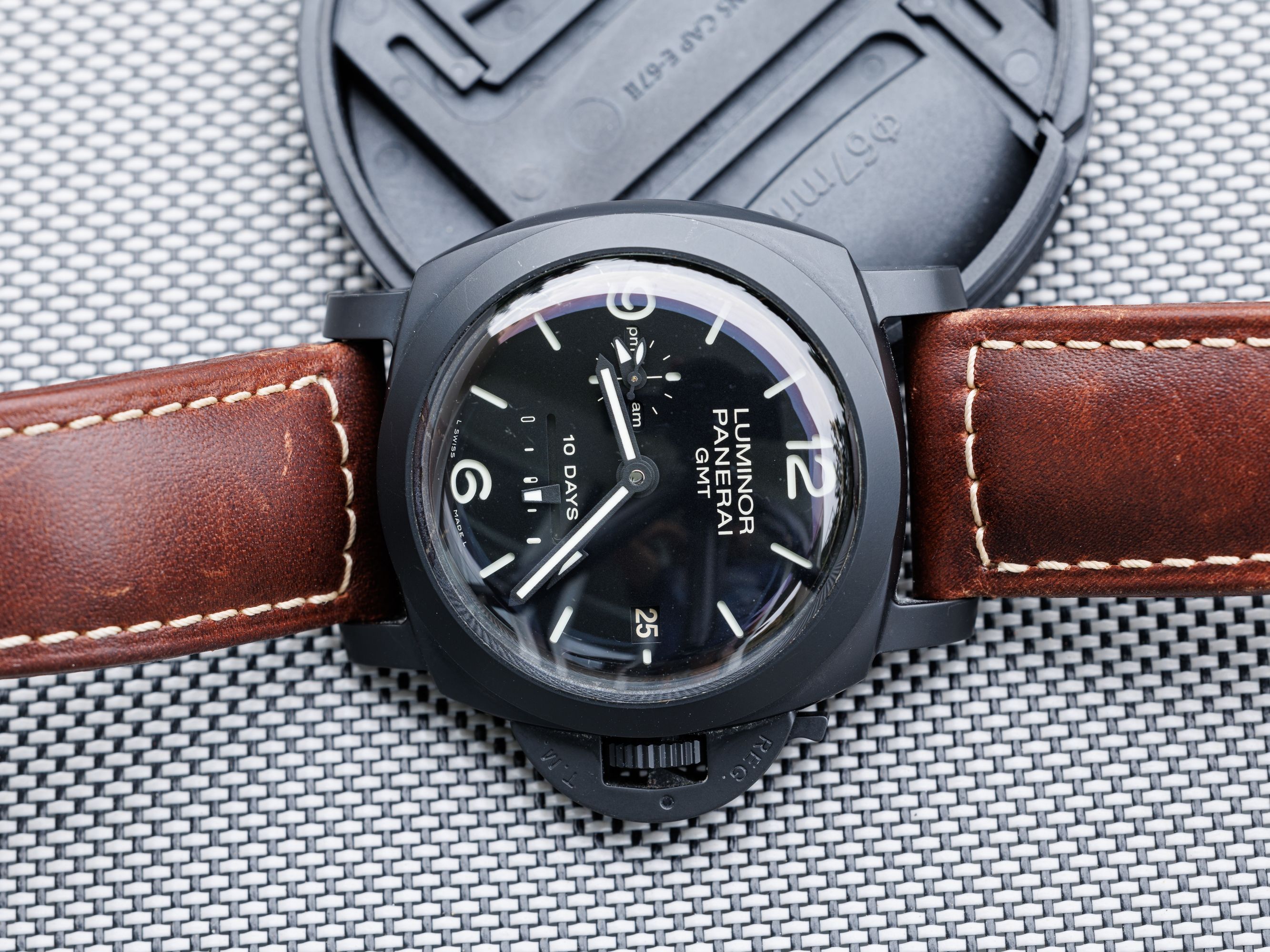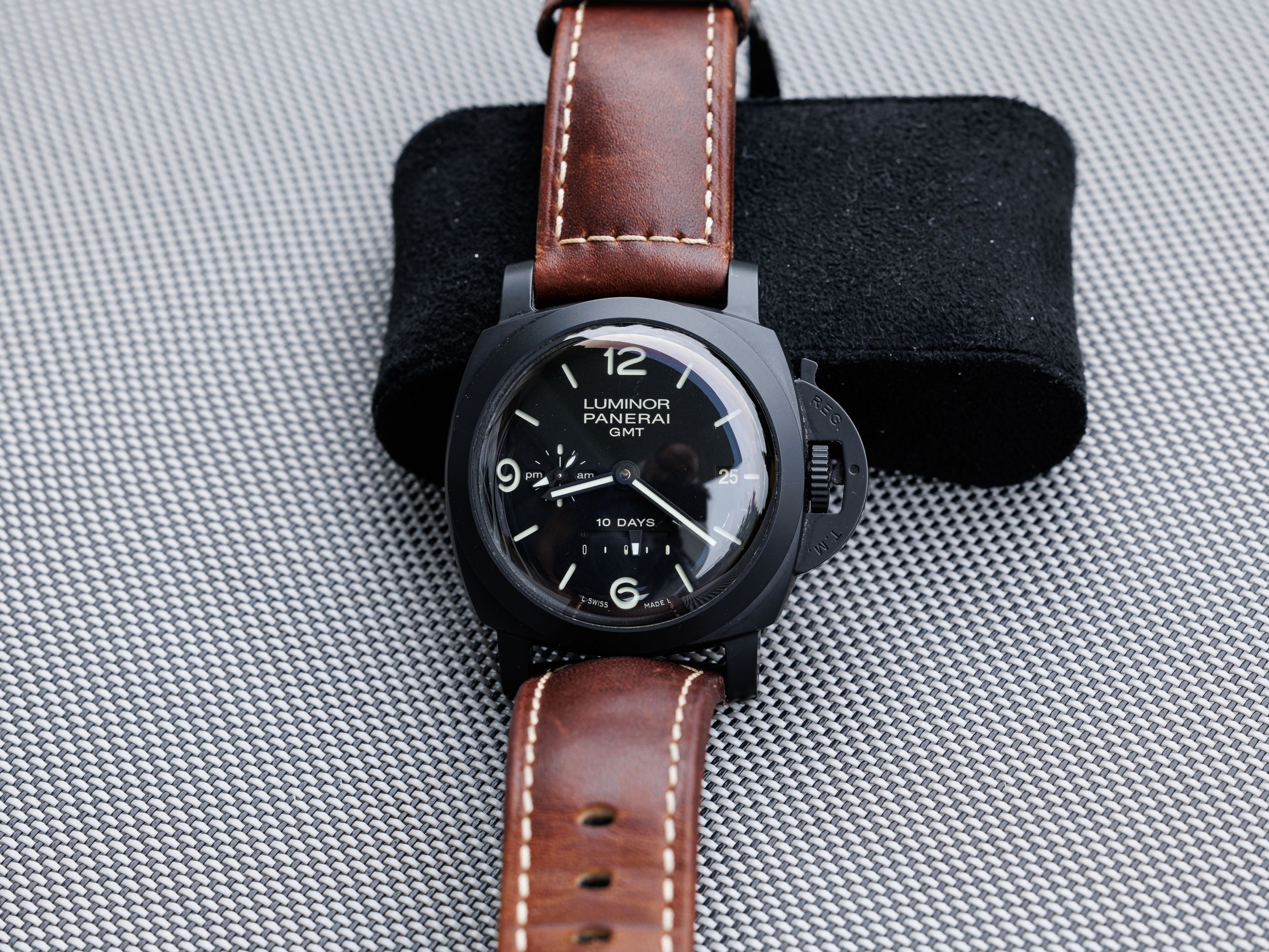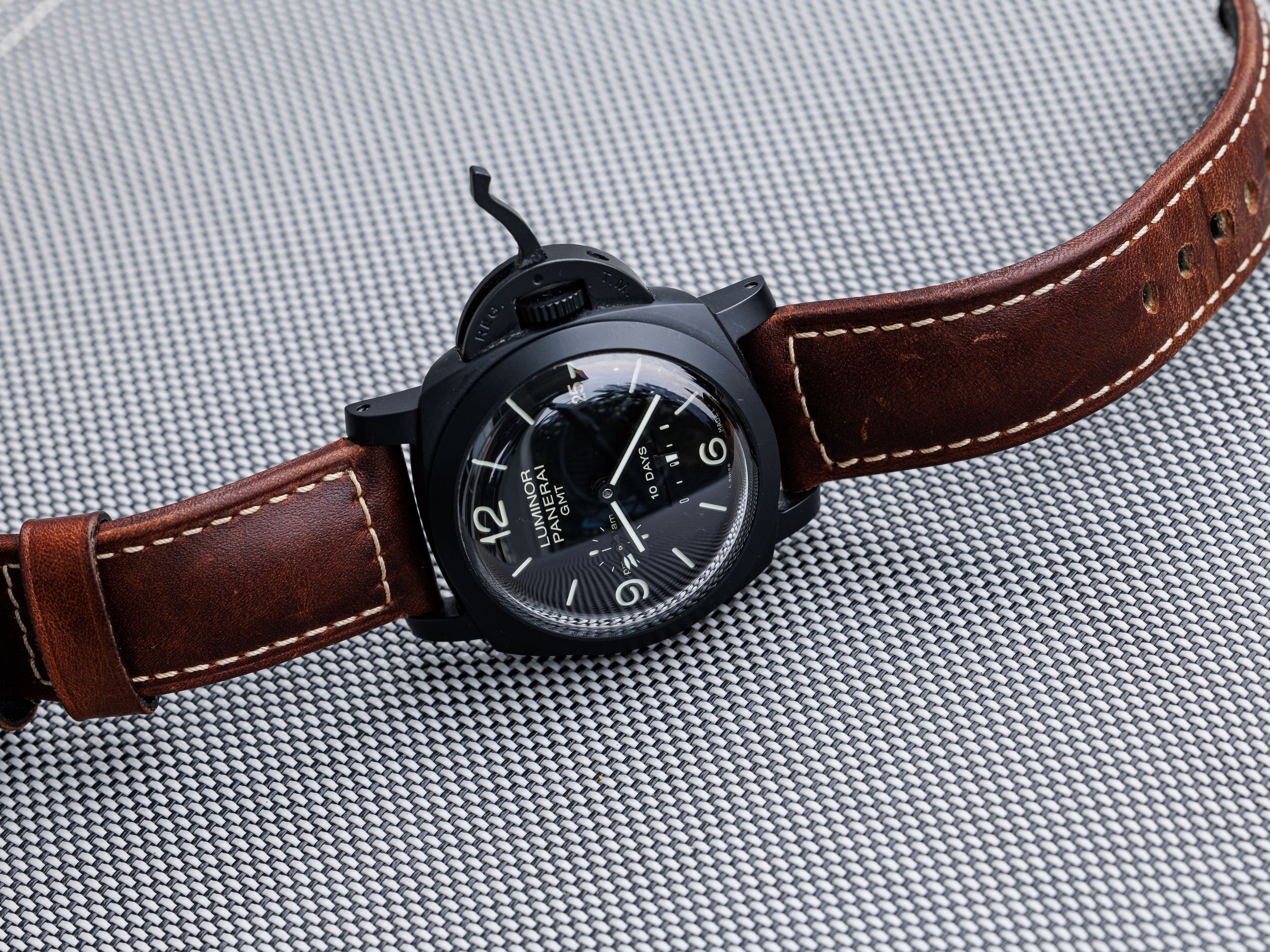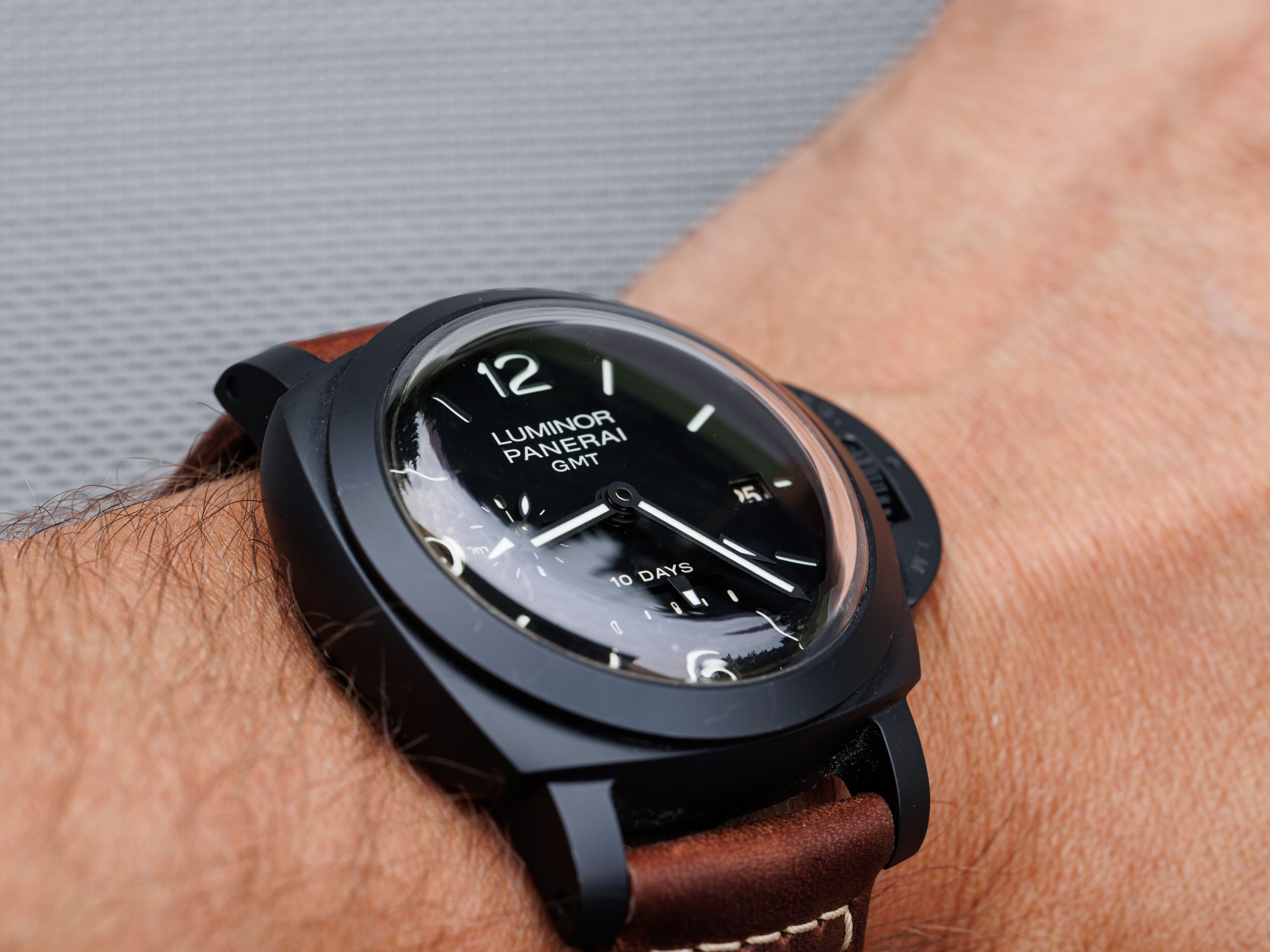 Ceramic Panerai Luminor, with a ten-day power reserve, with a second time zone display.Charming, convex glass does the job.
