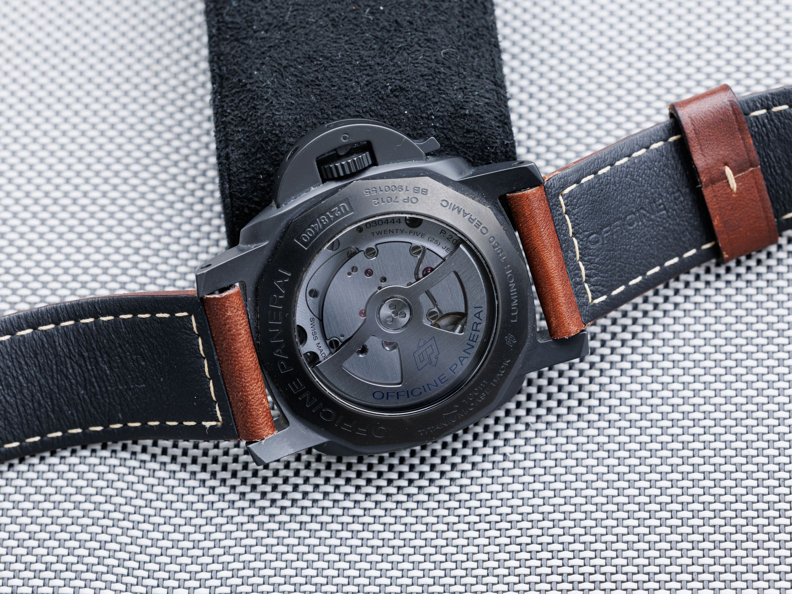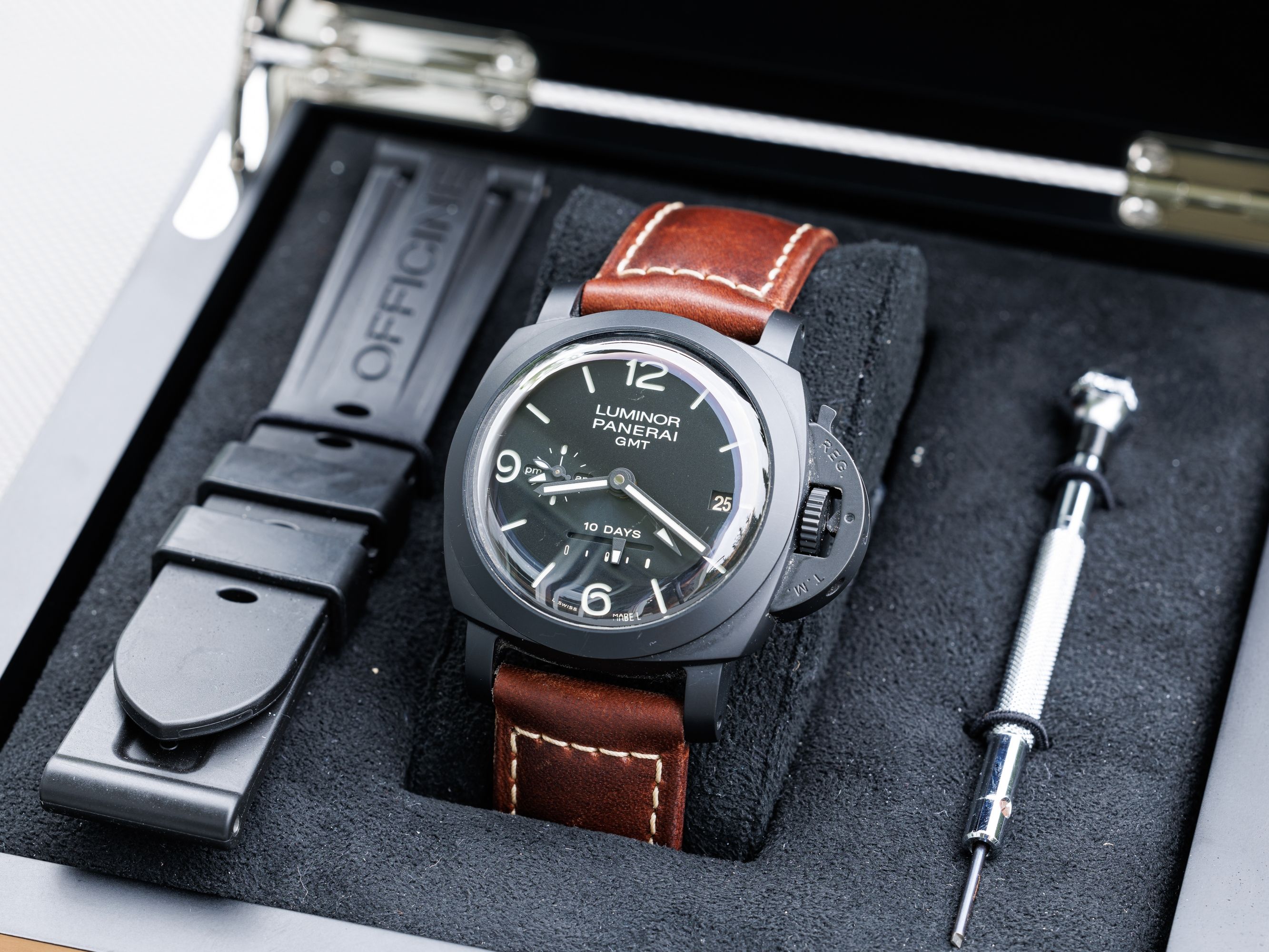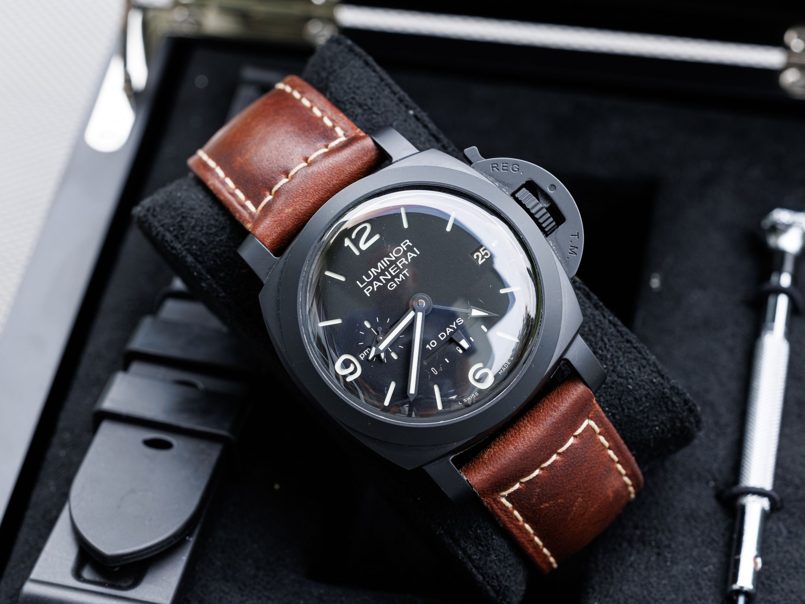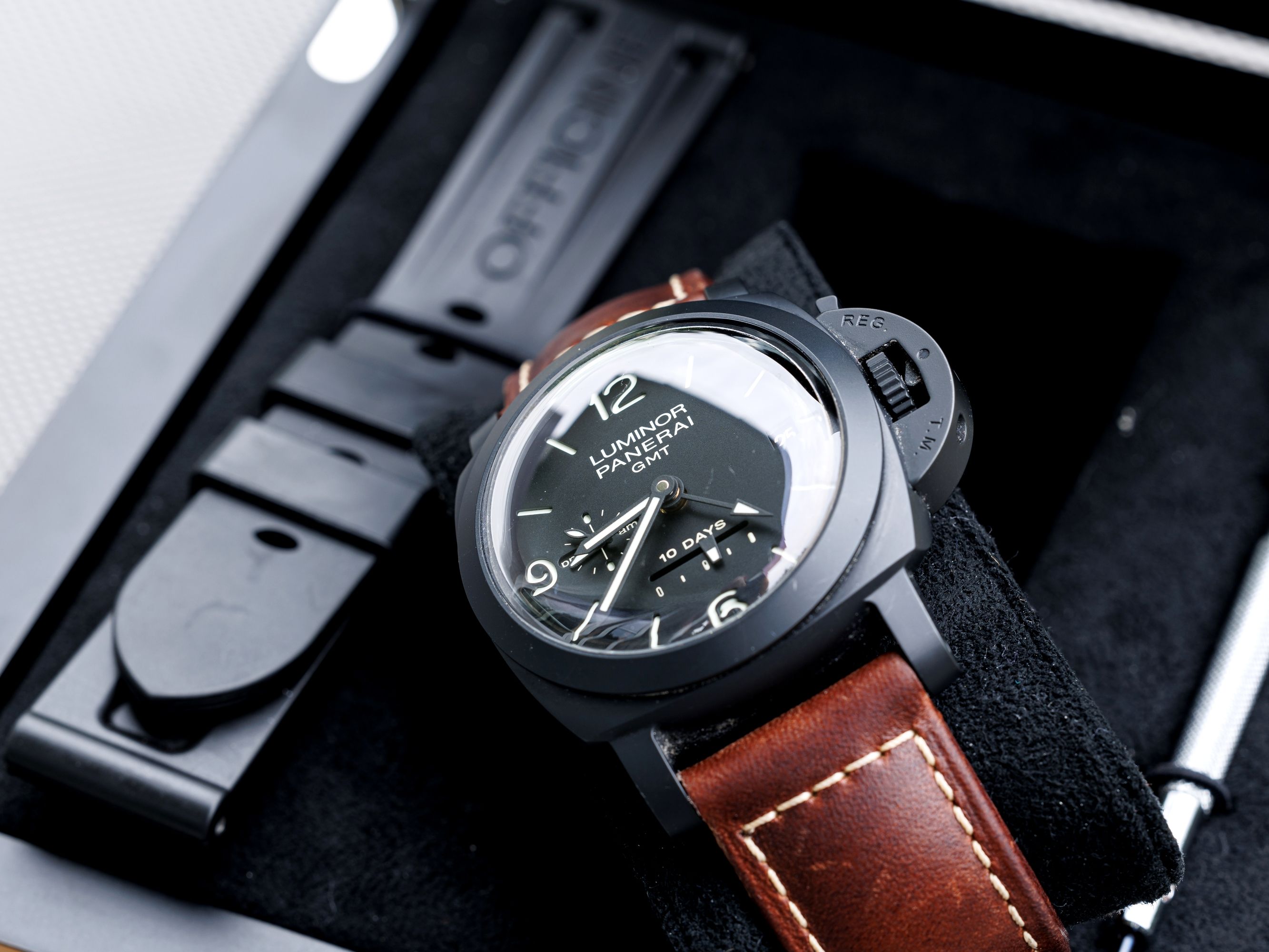 Ceramic Panerai Luminor, with a ten-day power reserve, with a second time zone display.Charming, convex glass does the job.