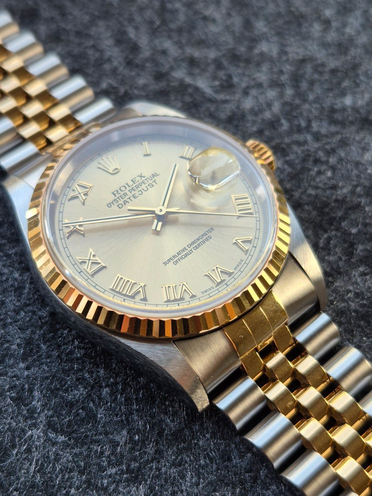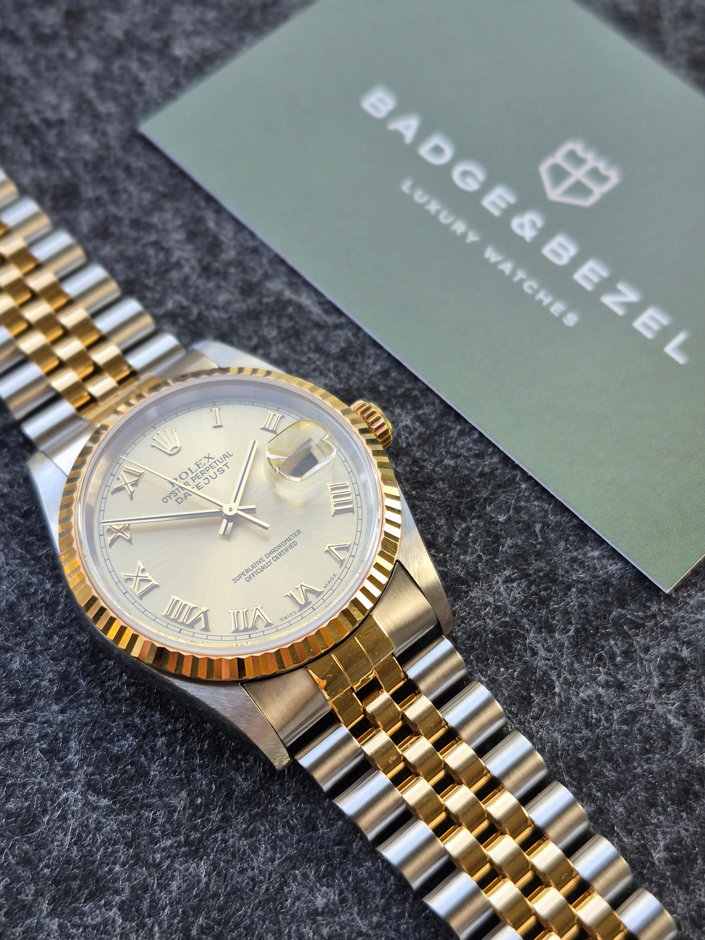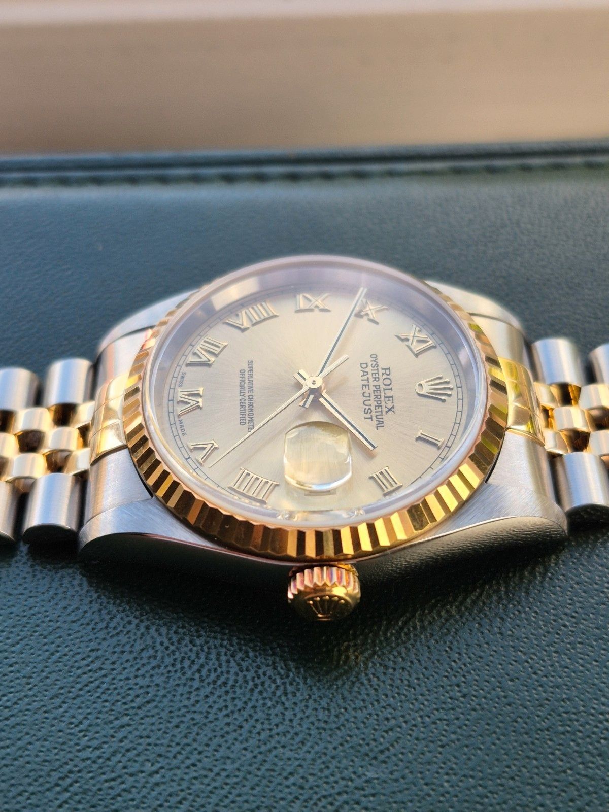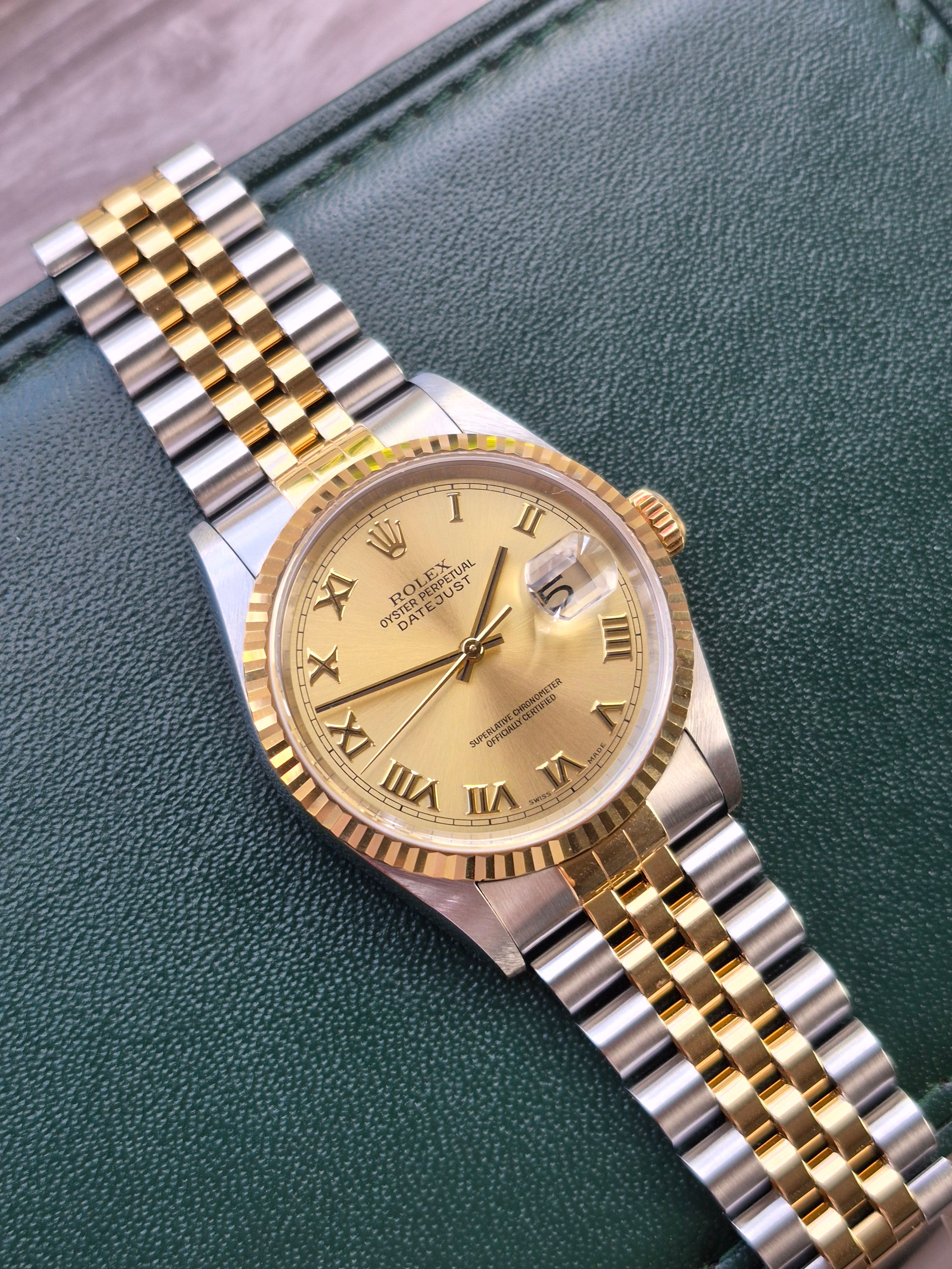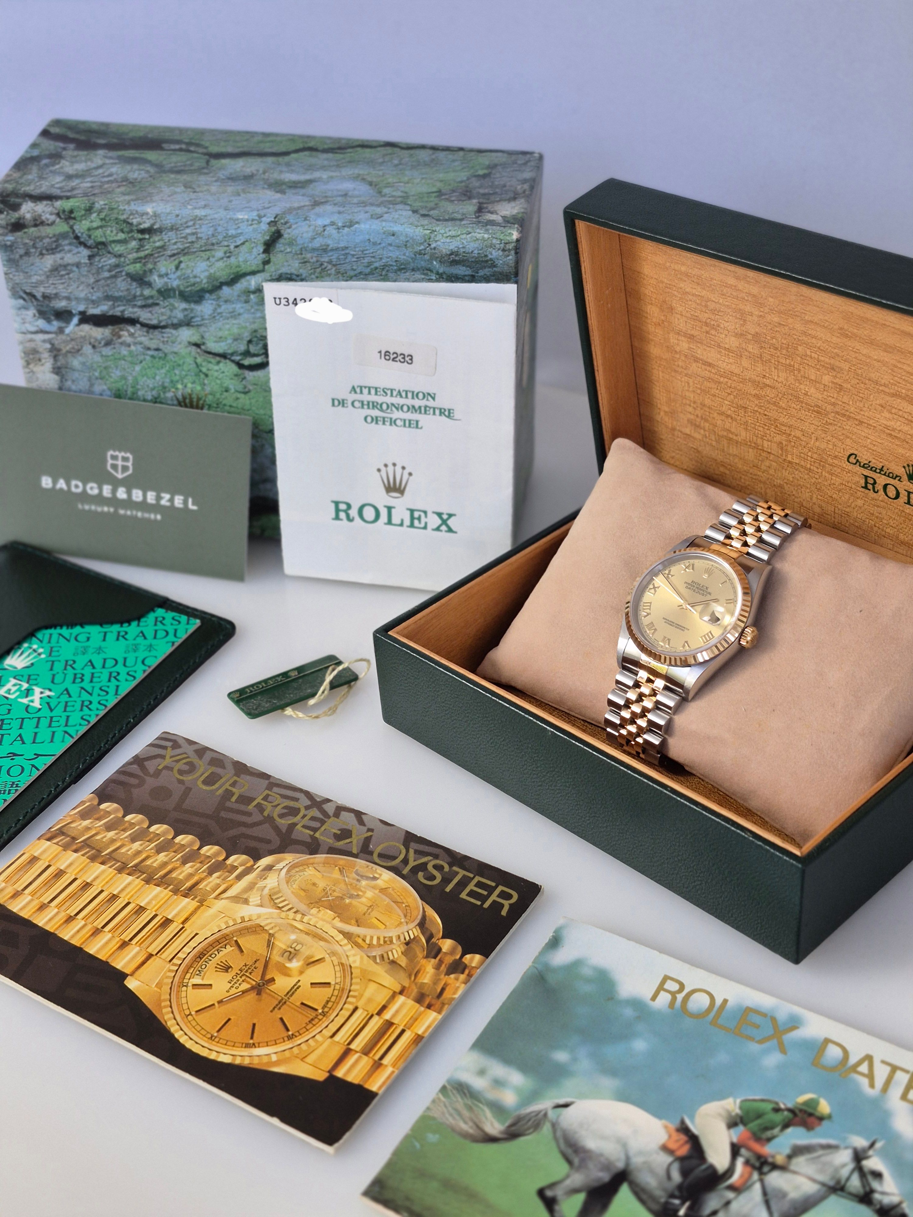 A Rolex Datejust 16233 with the refined Roman Champagne Dial, full set from 1998 in perfect condition!This classic comes in the perfect 36mm case size, combining elegance with everyday wearability.