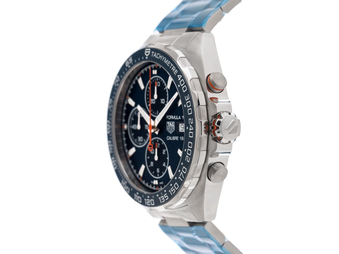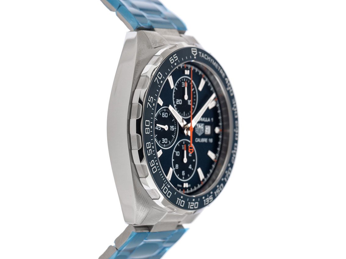 Tag Heuer Formula 1 Stahl Keramik Automatik Chronograph Armband StahlGehäuse Edelstahl poliert und satiniert, Gehäusedurchmesser ohne Krone 44mm, Gehäusehöhe 15,1mm. Lünette Edelstahl mit blauem Keramik Inlay und gravierter Tachymeter-Skala. Armband Edelstahl poliert und satiniert, Sicherheitsfaltschließe Edelstahl mit Hersteller-Logo. Zifferblatt blau mit aufgesetzten Edelstahl Leuchtindexen und polierten Edelstahl Leuchtzeigern. Uhrwerk Automatik, Chronograph, Tag Heuer Calibre 16, Gangreserve ca. 42 Stunden. Anzeige von Stunde und Minute über Zeiger aus der Mitte, kleine Sekunde mit Sekundenstopp zur sekundengenauen Einstellung der Uhrzeit bei 9 Uhr, Datumsanzeige mit Schnellverstellung bei 3 Uhr. Saphirglas kratzfest. Krone verschraubbar mit Hersteller-Logo. Boden Edelstahl verschraubt und graviert mit Tag Heuer Relief. Gewicht der Uhr inklusive Armband 215g, Länge des Armbandes inklusive Gehäuse 200mm. Wasserdicht bis 20 ATM. Referenznummer: CAZ201G.BA0876, ID: ST580653301025H-4250, Artikelnummer: 10000082458. Original Tag Heuer Box mit Umkarton und Garantie Papiere von 2025 sowie Beschreibung, Full Set. Ungetragen. Lieferzeit sofort.