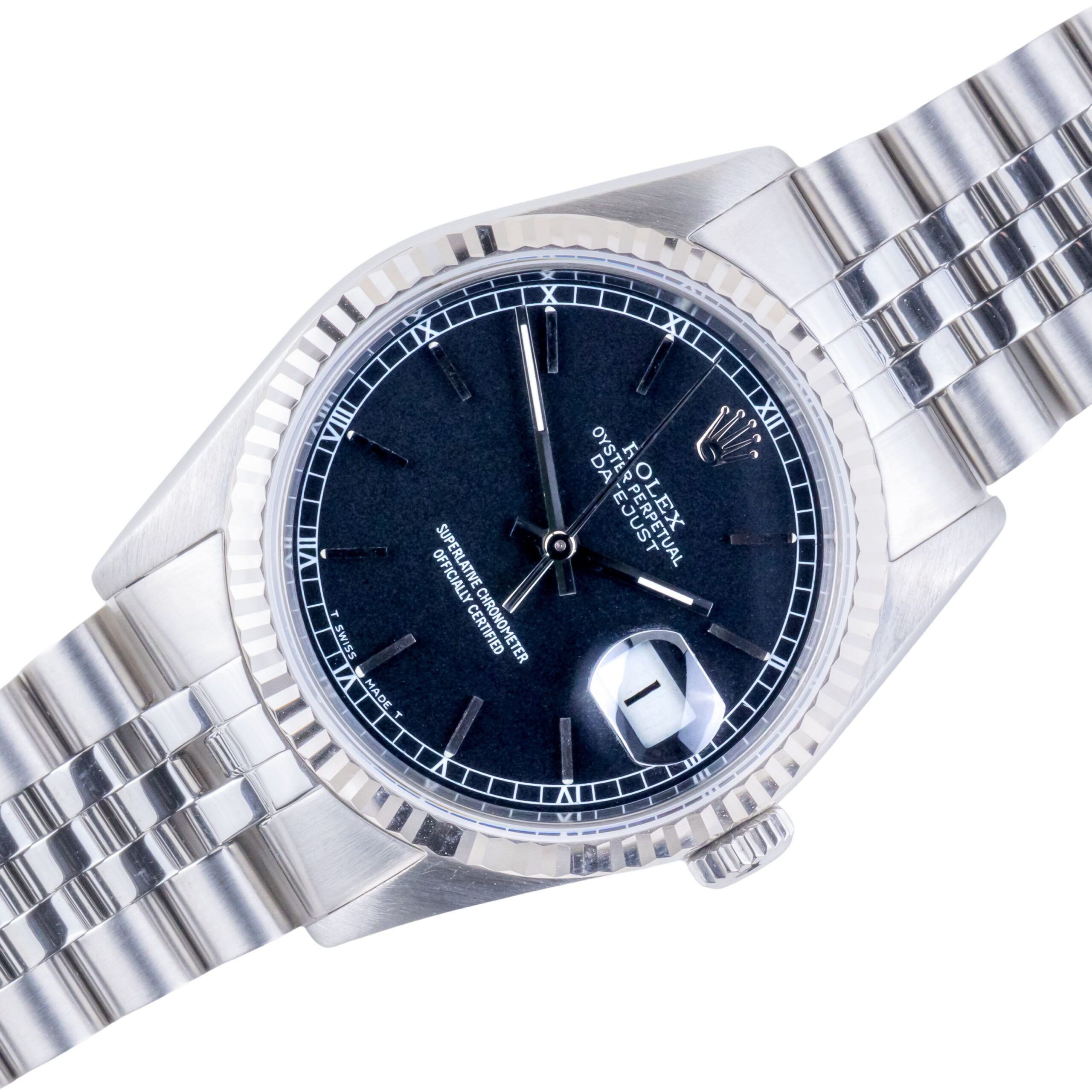 Rolex Oyster Perpetual Datejust riferimento 16234 del 1991, completo di set originale. Il Datejust 16234 misura una cassa in acciaio inossidabile da 36 mm, un bracciale Jubilee in acciaio inossidabile e una lunetta scanalata in oro bianco 18k. Questo Datejust 16234 presenta un movimento automatico calibro 3135 con funzione di data rapida, un vetro zaffiro resistente ai graffi e un quadrante nero con lancette in trizio.