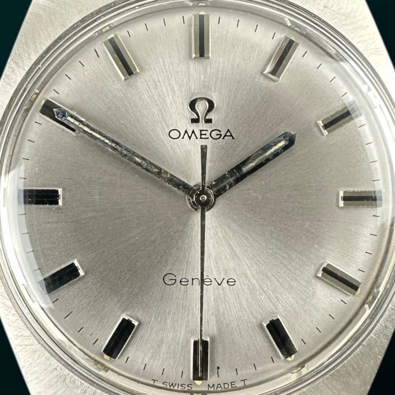 This vintage 1968 Omega Genève features a 34.5 mm stainless steel case having its original polish still visible. The silver sunburst dial is accented with black and steel details. Inside is a freshly serviced Caliber 601 manual-wind movement, fully serviced in October 2025 and running perfectly. Paired with a dark brown lizard leather strap, this piece makes an excellent daily wearer.Year of production: 1968