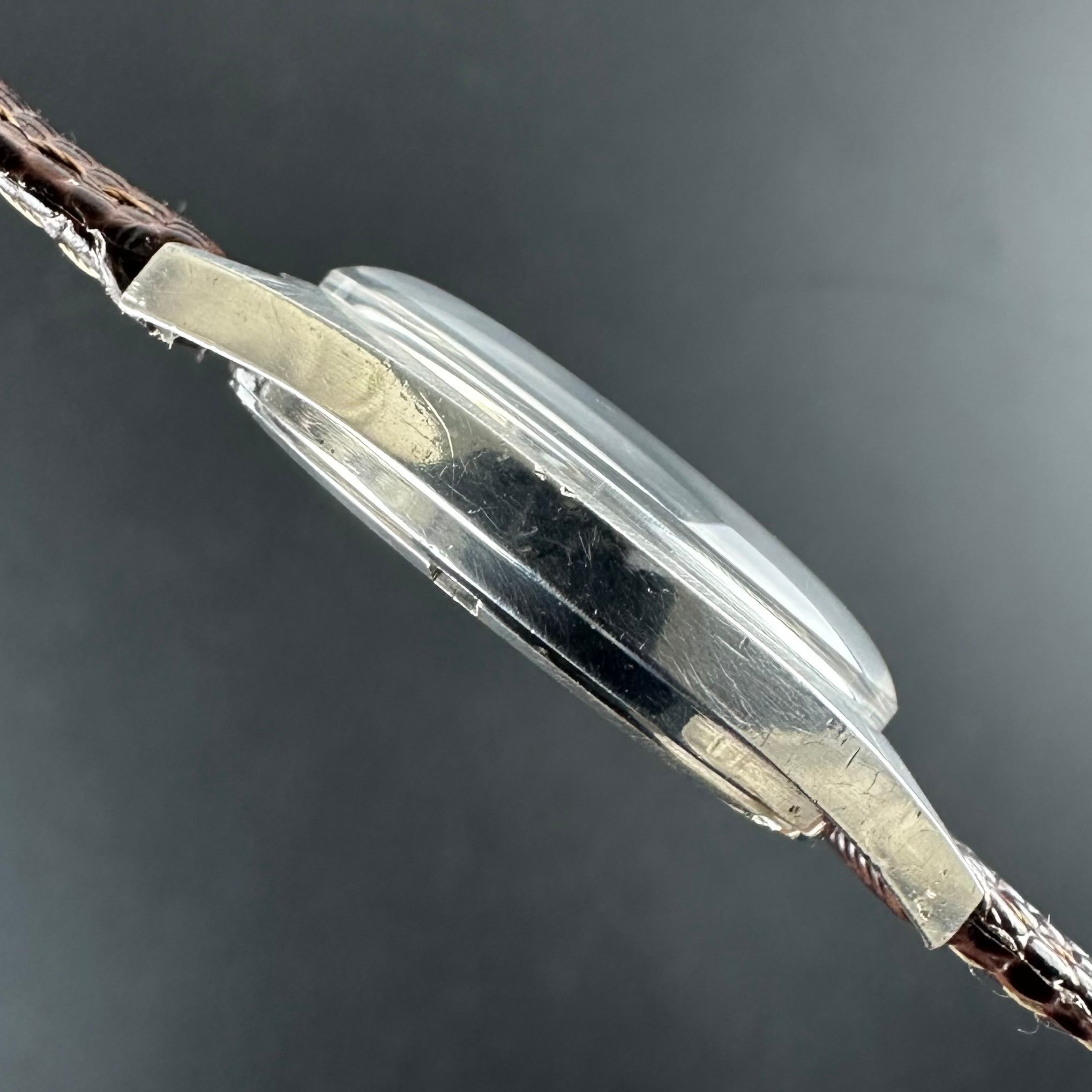 Questo vintage Omega Genève del 1968 presenta una cassa in acciaio inossidabile di 34,5 mm con la sua lucidatura originale ancora visibile. La lunetta argentata con effetto sole è accentuata da dettagli neri e in acciaio. All'interno si trova un movimento a carica manuale Calibro 601, appena revisionato nell'ottobre 2025 e che funziona perfettamente. Abbinato a un cinturino in pelle di lucertola marrone scuro, questo pezzo è ideale per l'uso quotidiano.