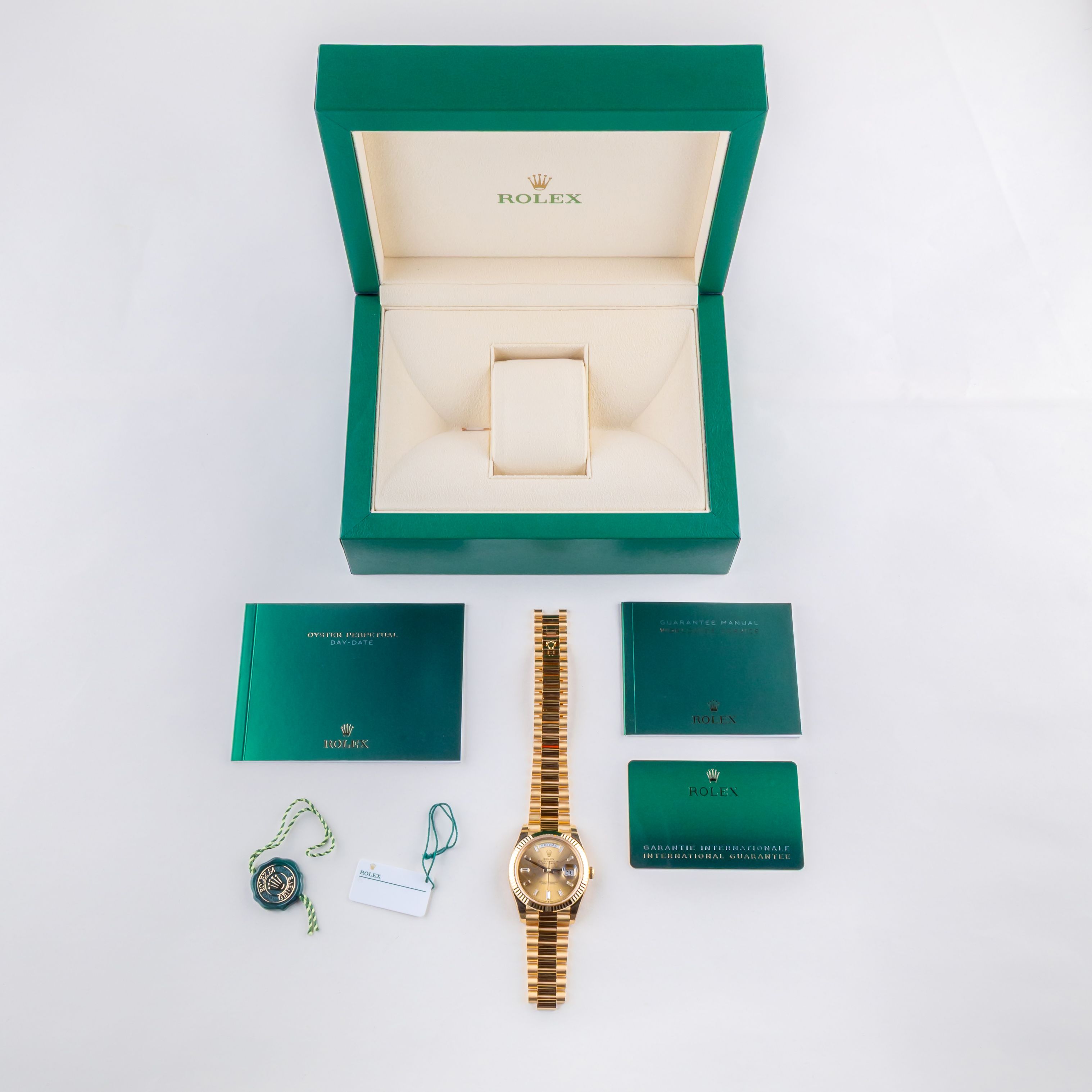 Rolex Oyster Perpetual Day-Date Referenza 228238 del 2022, completo di set. Il Day-Date 228238 ha una cassa in oro 18k da 40 mm, un bracciale president in oro 18k con chiusura Crownclasp e un lunetta scanalata in oro 18k. Il Day-Date 228238 presenta un movimento automatico calibro 3255 con funzione di data e giorno a doppio rapido, un cristallo zaffiro resistente ai graffi e un quadrante baguette color champagne.