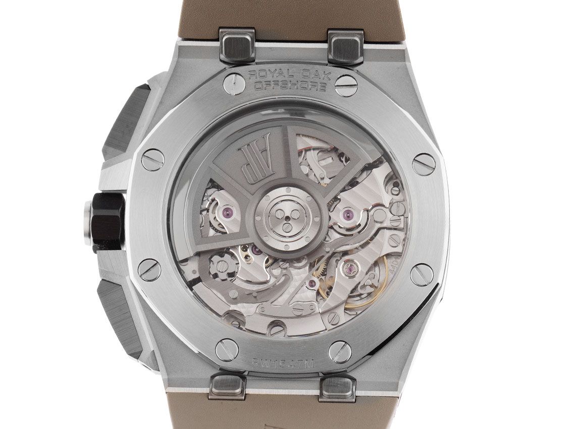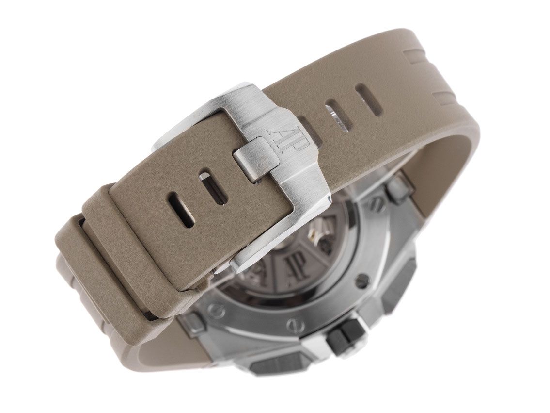 Cassa in acciaio lucido e satinato, diametro della cassa senza corona 43mm, altezza della cassa 14,5mm. Lunetta in ceramica nera satinata e lucida, ottagonale e fissata con 8 viti. Cinturino Audemars Piguet in caucciù khaki, larghezza dell'attacco 30mm, fibbia a perno in acciaio con logo del produttore. Quadrante khaki sfumato con motivo a nido d'ape (Méga Tapisserie), indici in acciaio applicati e lancette in acciaio lucido, oltre a quadranti ausiliari grigi. Movimento automatico, cronografo, calibro Audemars Piguet calibro 4401 con 40 pietre preziose. Indicazione di ore e minuti tramite lancette centrali, piccolo secondo con fermo secondo per la regolazione precisa dell'ora a ore 6, indicazione della data con regolazione rapida tra le 3 e le 4. Vetro zaffiro antigraffio. Corona nera, a vite con protezione laterale e logo del produttore. Fondello in acciaio fissato con 8 viti e finestra in vetro zaffiro. Peso dell'orologio incluso il cinturino 168g. Numero di riferimento: 26420SO.OO.A600CA.01, anno di produzione: 2021, ID: KK1617680001025AH-45500, numero articolo: 10000082710. Scatola originale Audemars Piguet con imballaggio e documenti di garanzia, oltre a descrizione e estratto dal Watch Register di ottobre 2025, certificato The Watch Register / senza registrazione (database internazionale per orologi smarriti o rubati), Full Set. Possibilità di restauro su richiesta! Investimento con potenziale di apprezzamento. Come nuovo. Tempi di consegna immediati.