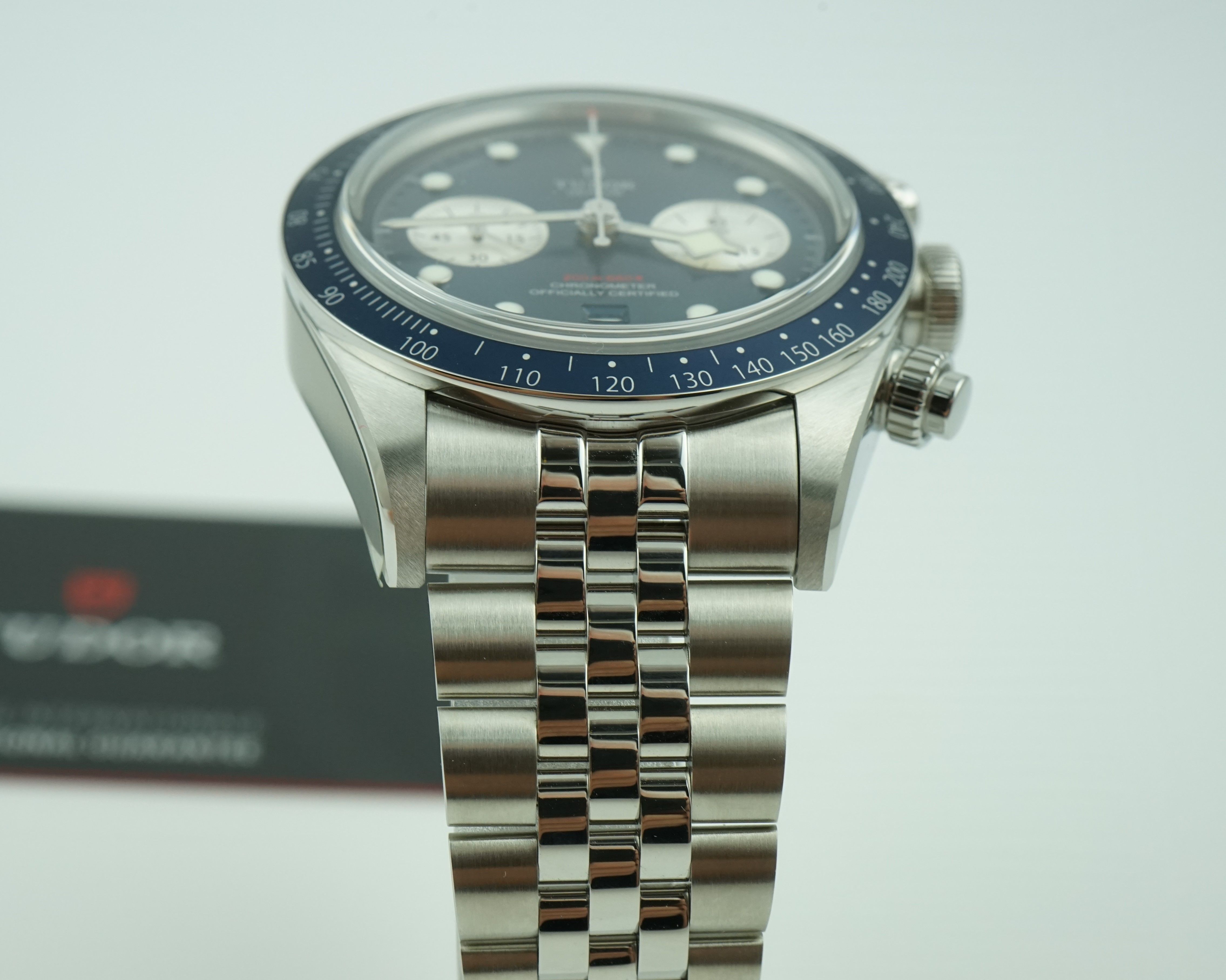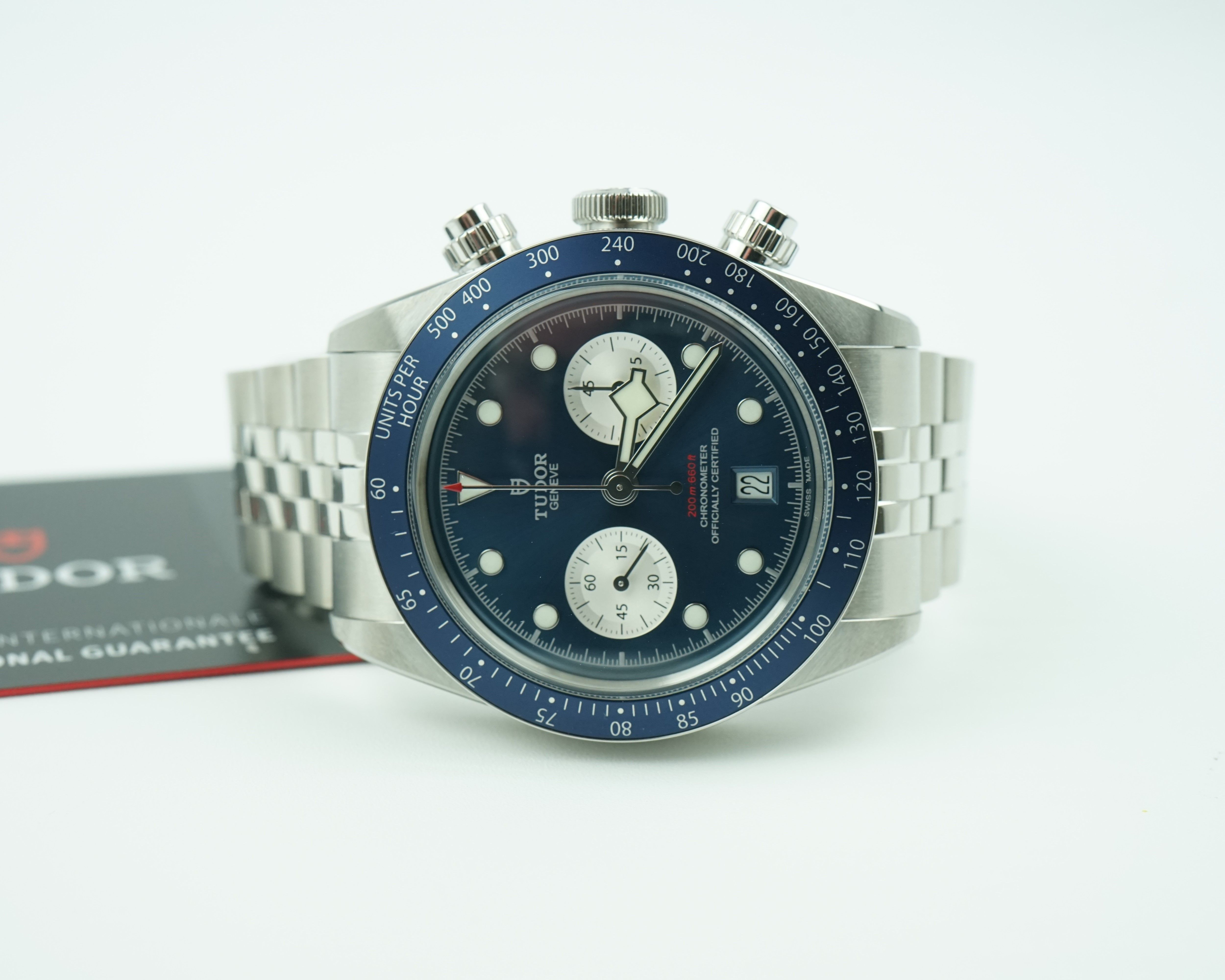 Siamo felici di presentarvi un meraviglioso Tudor Black Bay Chrono Boutique Edition. Questa edizione esclusiva colpisce per il suo design sportivo ed elegante, con un quadrante blu e una lunetta abbinata che si armonizzano perfettamente. Un particolare punto forte di questa Boutique Edition è il bracciale originale Tudor Jubilee, che conferisce all'orologio un aspetto elegante e al contempo distintivo. Il modello è nuovo e mai indossato, naturalmente completo di scatola e documenti originali.