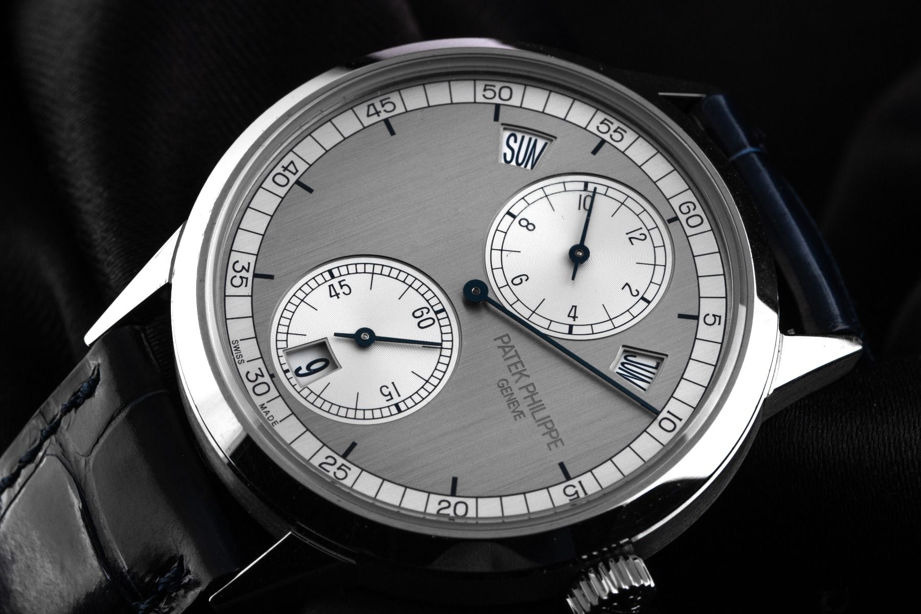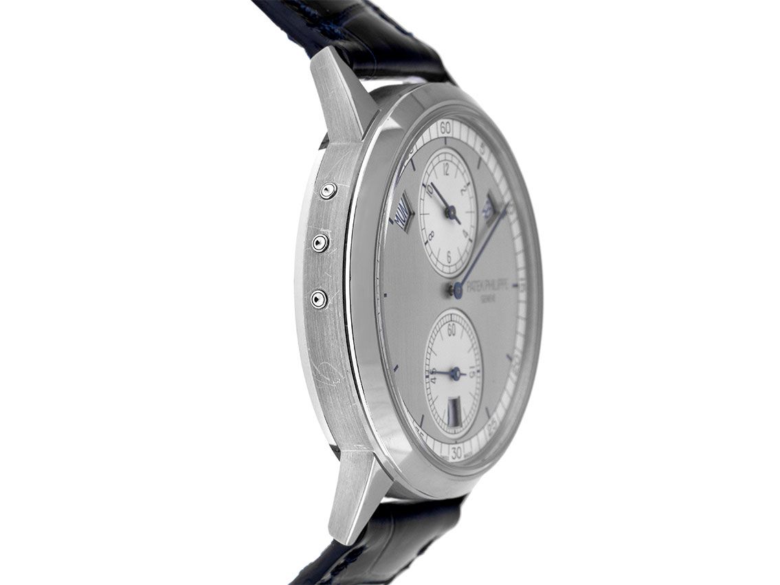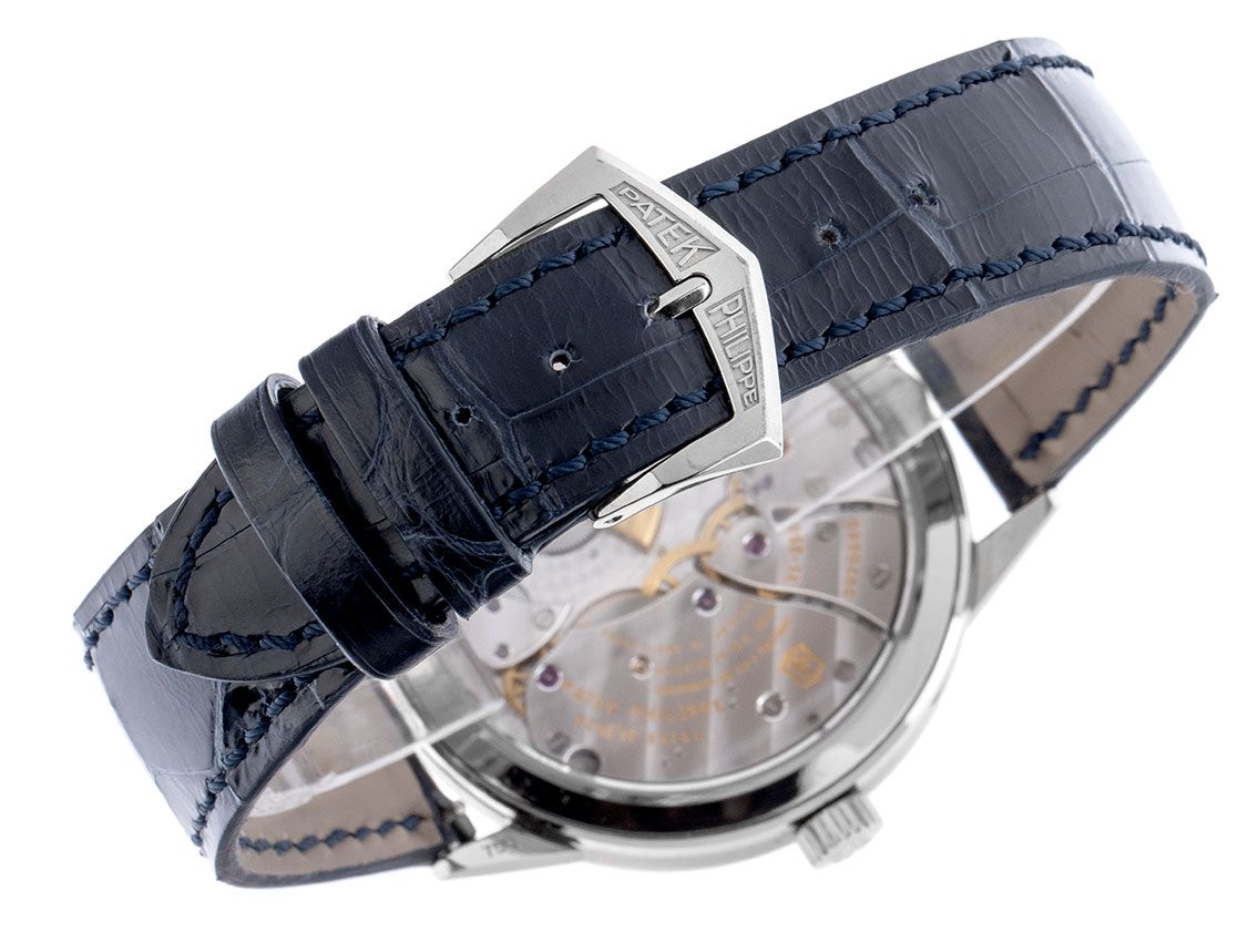 Oro bianco 18kt lucidato e satinato, diametro della cassa senza corona 40mm, altezza della cassa 10,4mm. Lunetta in oro bianco 18kt lucida e liscia. Bracciale Patek Philippe in pelle di coccodrillo blu scuro con cucitura decorativa, larghezza delle anse 20mm, fibbia ad ardiglione Patek Philippe in oro bianco 18kt con logo del produttore. Quadrante grigio argento con numeri arabi e lancette bluate. Movimento automatico, regolatore, calibro Patek Philippe Manifattura 31-260 REG QA con 31 pietre preziose. Indicazione dei minuti tramite lancetta centrale, ore decentrate a ore 12, secondi piccoli con fermo dei secondi per la regolazione precisa dell'ora a ore 6, indicazione della data a ore 6 con regolazione rapida tramite pulsante tra le ore 9 e 10, indicazione del giorno della settimana in inglese a ore 10 con regolazione rapida tramite pulsante a ore 9, indicazione del mese in inglese a ore 2 con regolazione rapida tramite pulsante a ore 10. Vetro zaffiro antigraffio. Corona zigrinata con logo del produttore. Fondello in oro bianco 18kt con finestra in vetro zaffiro. Peso dell'orologio incluso il bracciale 87g. Numero di riferimento: 5235G-001, anno di produzione: 2017, ID: KK1639560001025AH-55000, numero articolo: 10000082775. Scatola originale Patek Philippe con imballaggio e documenti di garanzia, oltre alla descrizione, Full Set. Investimento con potenziale di apprezzamento, pezzo da collezione estremamente raro, quasi mai indossato. Originale non lucidato. Tempi di consegna immediati.