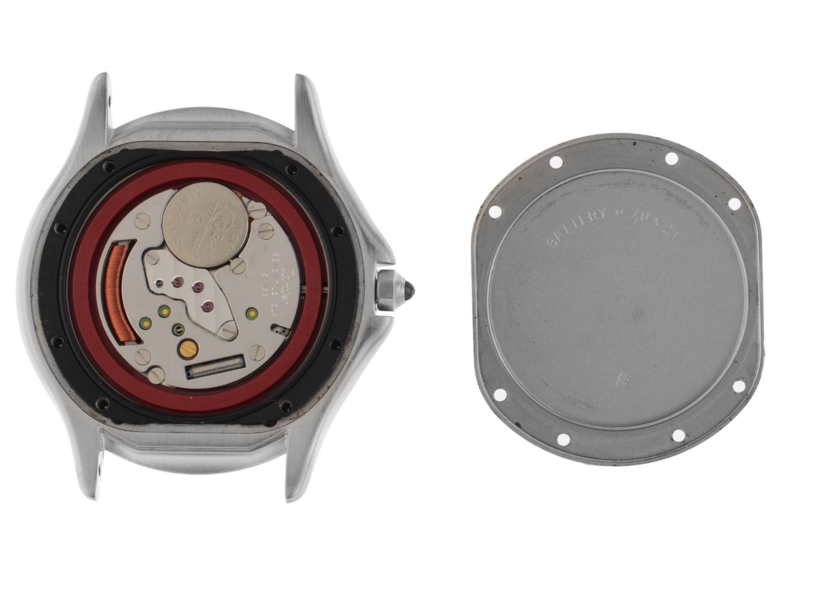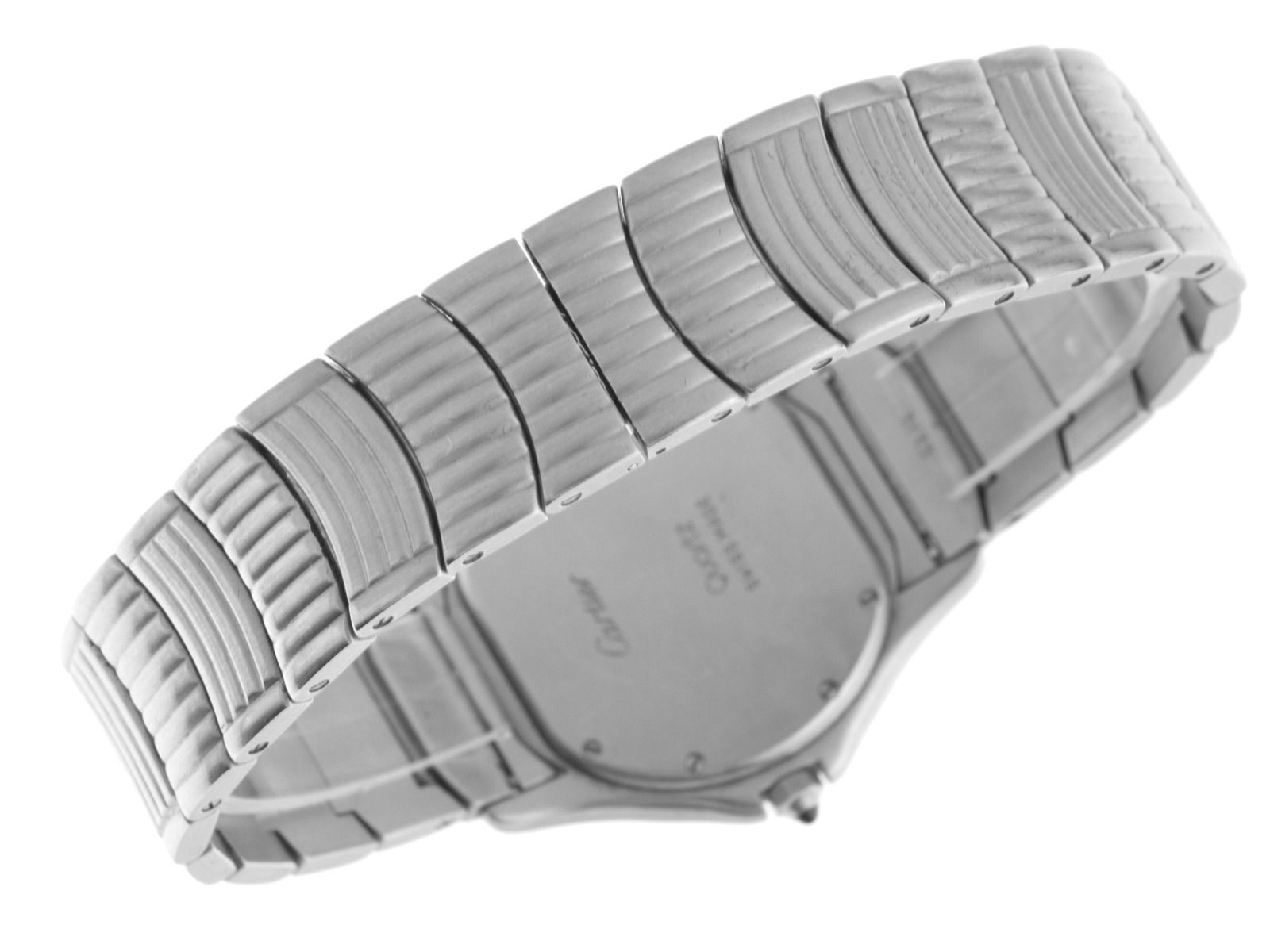 Cassa in acciaio inox satinato, diametro cassa senza corona 33mm, altezza cassa 6,5mm. Lunetta in acciaio inox avvitata 8 volte e lucidata. Bracciale in acciaio inox satinato, chiusura pieghevole doppia nascosta in acciaio inox. Quadrante bianco con numeri romani neri e lancette bluate. Movimento al quarzo, calibro 87.06 con 7 rubini. Indicazione di ore, minuti e secondi tramite lancette centrali, indicazione della data con regolazione rapida alle 3. Vetro zaffiro antigraffio e curvo. Corona con cabochon in spinello blu. Fondello in acciaio inox avvitato 8 volte e inciso. Peso dell'orologio incluso il bracciale 87g, lunghezza del bracciale incluso la cassa 195mm. Numero di riferimento: 987904C, numero di cassa: 008XXX, ID: P176440001025H-5900, numero articolo: 10000082744. Con controllo del movimento, nuova batteria e completa rifinitura esterna di ottobre 2025. Scatola originale Cartier e documenti di garanzia di dicembre 1999, oltre a estratto del Watch Register di ottobre 2025, certificato The Watch Register / senza registrazione (database internazionale per orologi smarriti o rubati), Full Set. Super affare, pezzo da collezione molto raro, quasi mai indossato. Ottime condizioni. Tempi di consegna immediati.