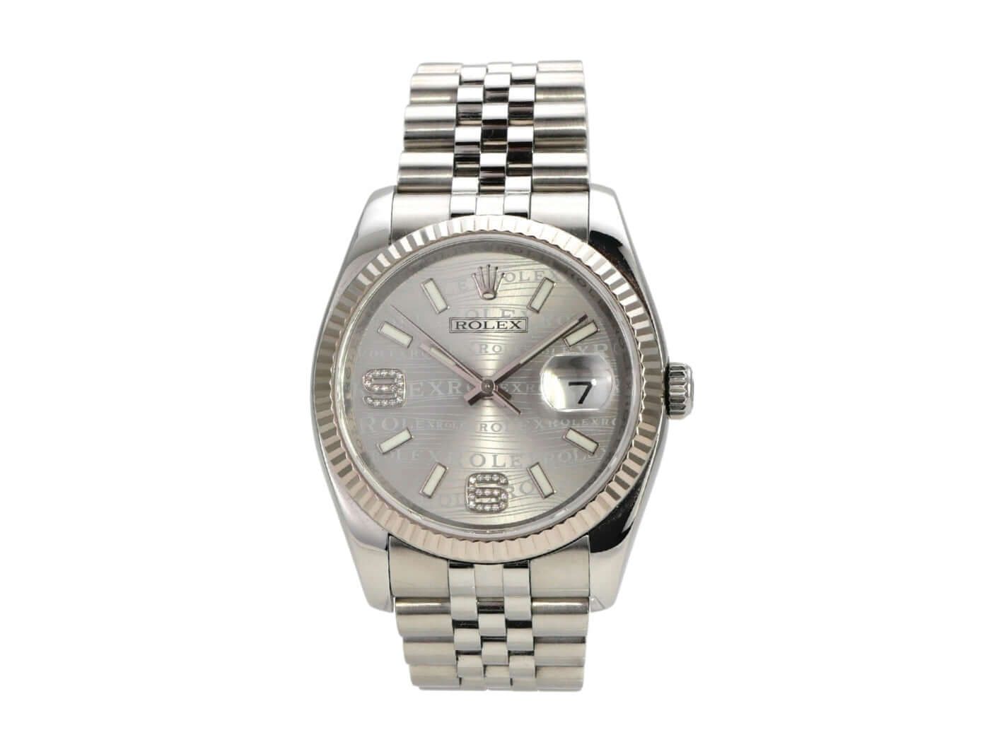 Rolex Datejust 36 Stainless Steel White Gold 116234 Silver A Dia Jubilee BandCase made of polished and satin-finished stainless steel, case diameter 36 mm, case height 11.7 mm, bezel made of 18 kt white gold fluted, Jubilee stainless steel bracelet polished and satin-finished with folding clasp, silver-colored dial with applied diamonds at numerals 6 and 9, automatic, Rolex manufacture caliber 3135 with 31 jewels, 28,800 A/h, date display, chronometer, scratch-resistant sapphire crystal, screw-down crown, screwed stainless steel back, water-resistant up to 10 bar.Used watch, very good condition, complete with box and papers, without date in GK, EU delivery from around 2008, M-series.