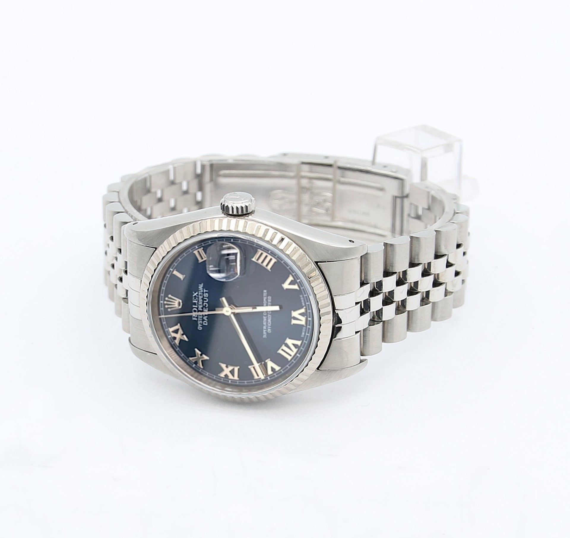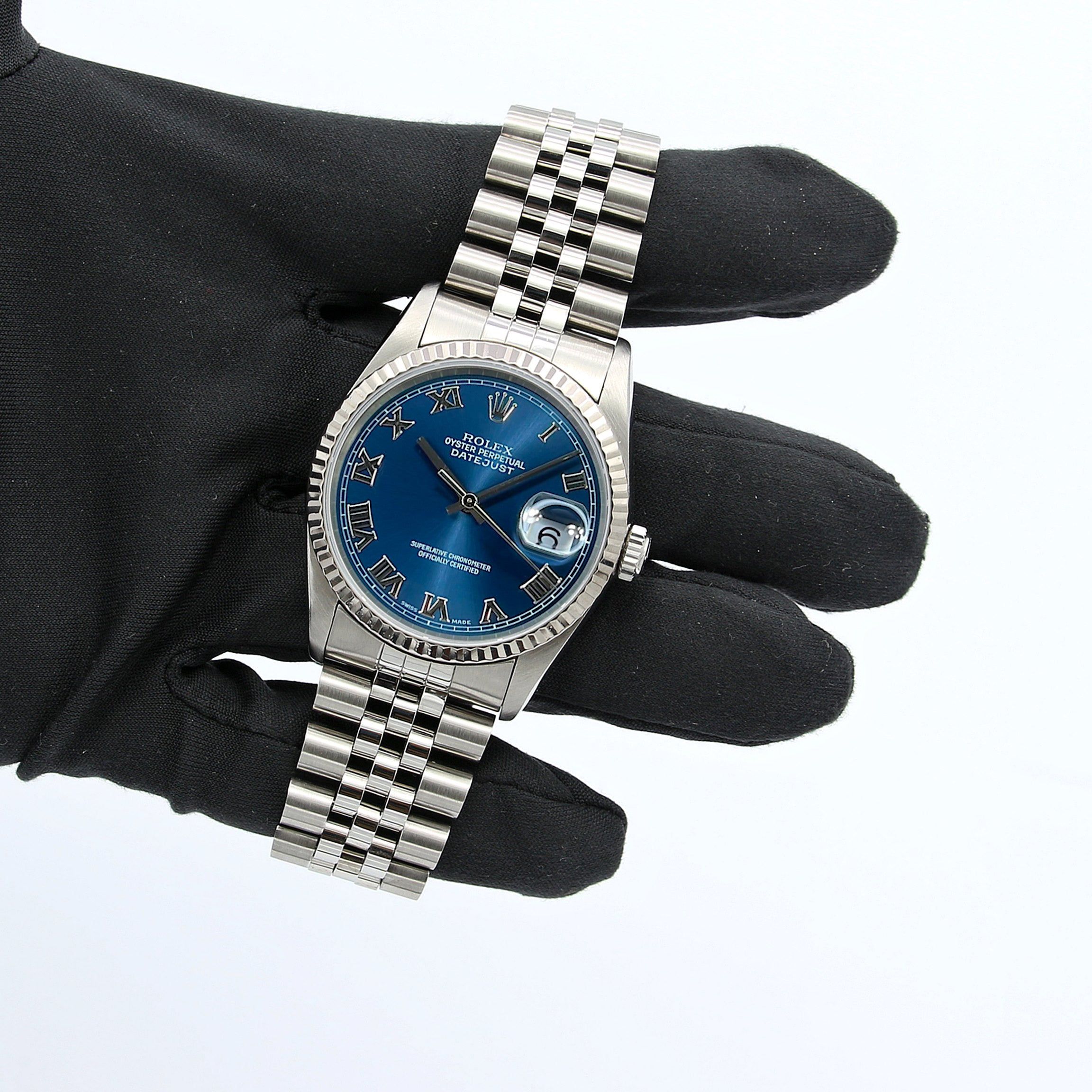 In vendita da Debonar Watches: Rolex Datejust usato ref. 16234. Questo Rolex Datejust in acciaio presenta un bellissimo quadrante blu soleil con numeri romani, una lunetta in oro bianco e un bracciale jubilee coordinato. Questo case in acciaio inossidabile di 36 mm di diametro è dotato di un fondello e di una corona a vite, una lunetta scanalata in oro bianco e un vetro zaffiro con lente cyclops. Sul quadrante troviamo a ore 12 le parole "ROLEX" - "OYSTER PERPETUAL" - "DATEJUST" e a ore 6 la scritta classica "Superlative Chronometer Officially Certified". Questo riferimento del Datejust è in produzione da molto tempo: puoi trovare Datejust 16234 prodotti dalla fine degli anni '80 fino ai primi anni 2000.