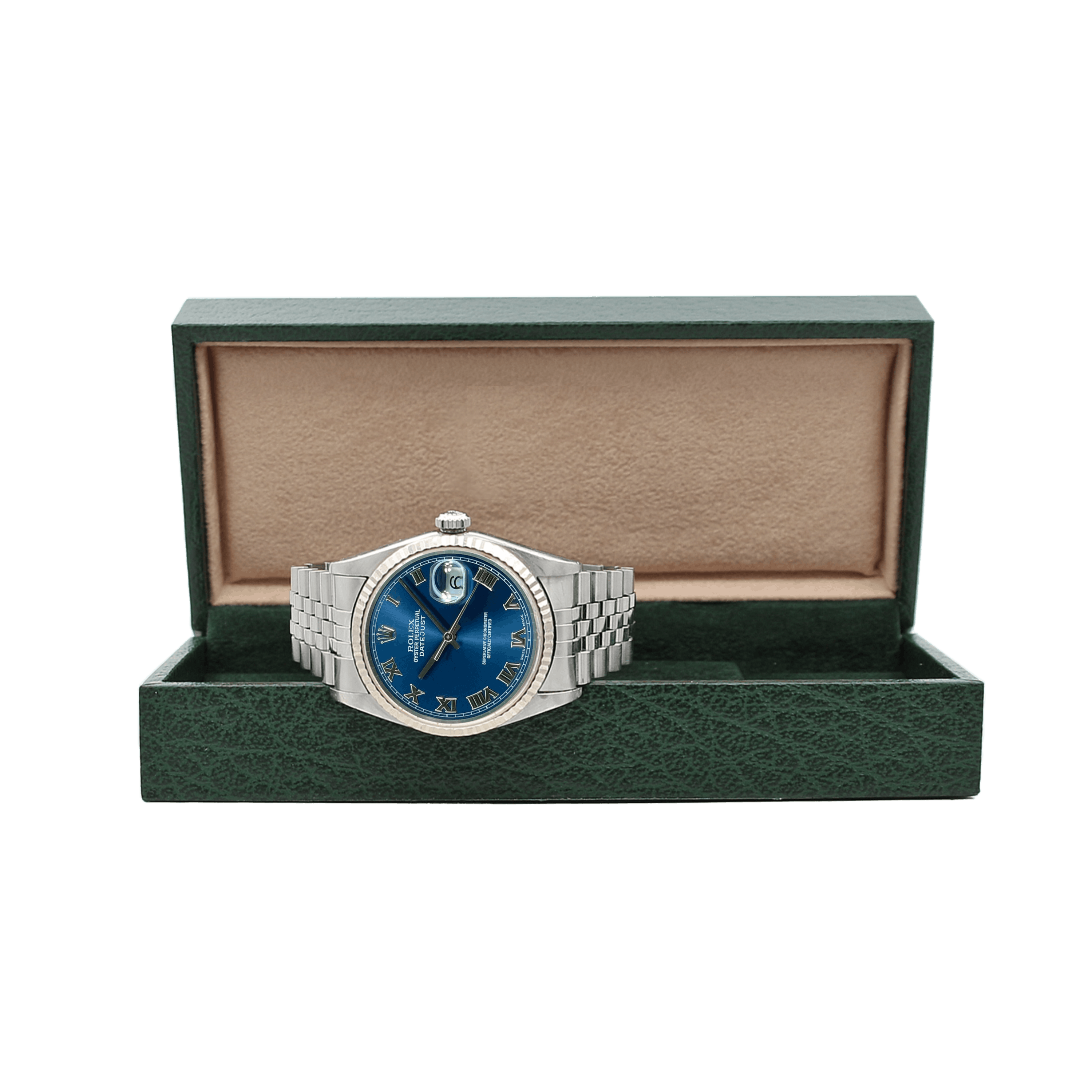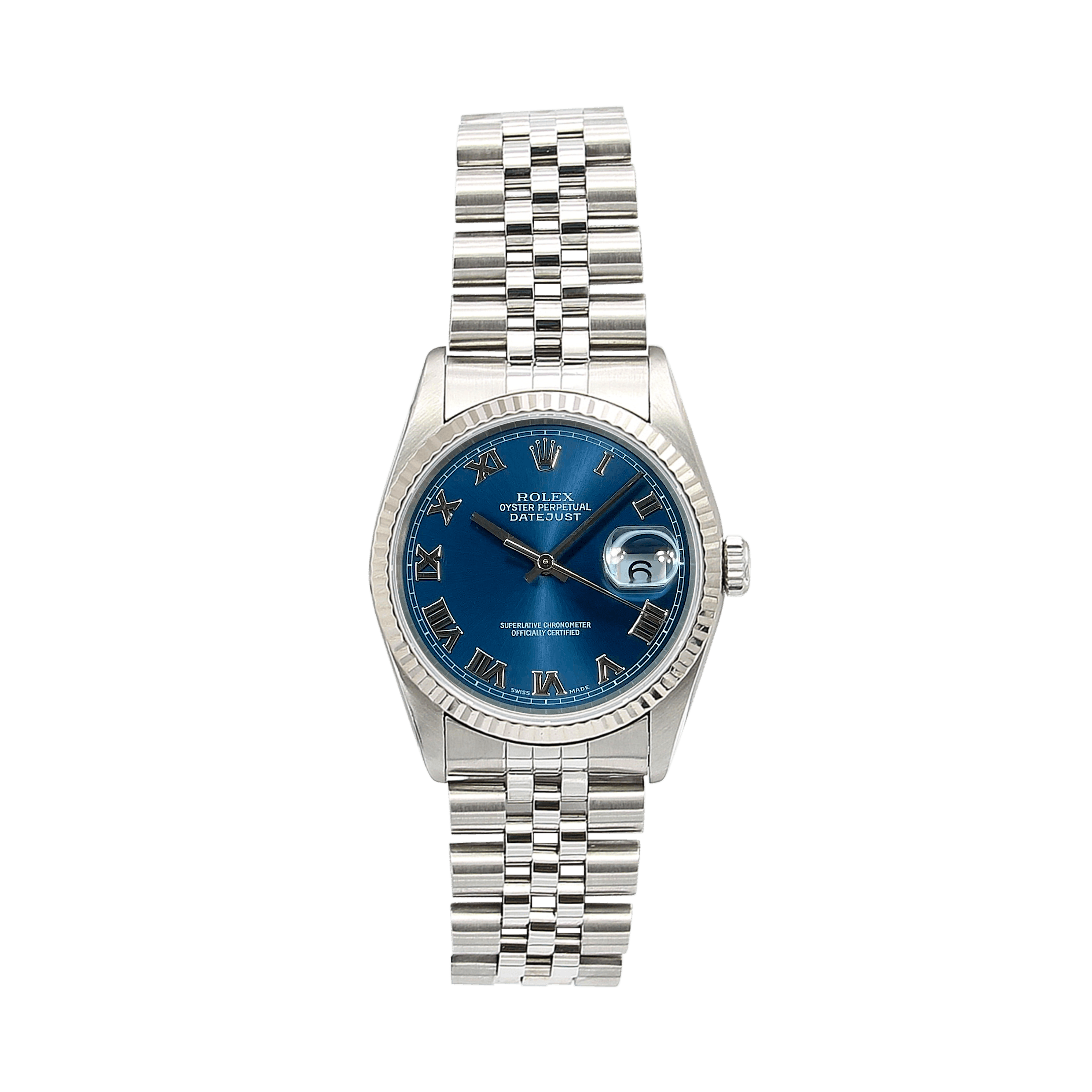 For sale at Debonar Watches: pre-owned Rolex Datejust ref. 16234.This Rolex Datejust in steel presents a beautiful blue soleil dial with roman numbers, a white gold bezel and a coordinated jubilee bracelet.This 36 mm. diameter stainless steel case is set with screw-down case back and crown, a fluted white gold bezel, a sapphire crystal with cyclops lens.On the dial we find at 12 o'clock the words "ROLEX" - "OYSTER PERPETUAL" - "DATEJUST" and at 6 o'clock the classic writing "Superlative Chronometer Officially Certified". This Datejust's reference has been in production for a long time: you can find Datejust 16234 produced from the late 80s to mid-2000s. BRAND ROLEX MODEL DATEJUST REFERENCE 16234 CASE MATERIAL STEEL/WHITE GOLD MOVEMENT AUTOMATIC DIMENSION 36 MM DIAL BLUE SOLEIL ROMAN CRYSTAL SAPPHIRE BRACELET TYPE JUBILEE BRACELET MATERIAL STEEL ORIGINAL BOX NO ORIGINAL PAPERS NO YEAR APPROX. THE '90s CONDITION VERY GOOD