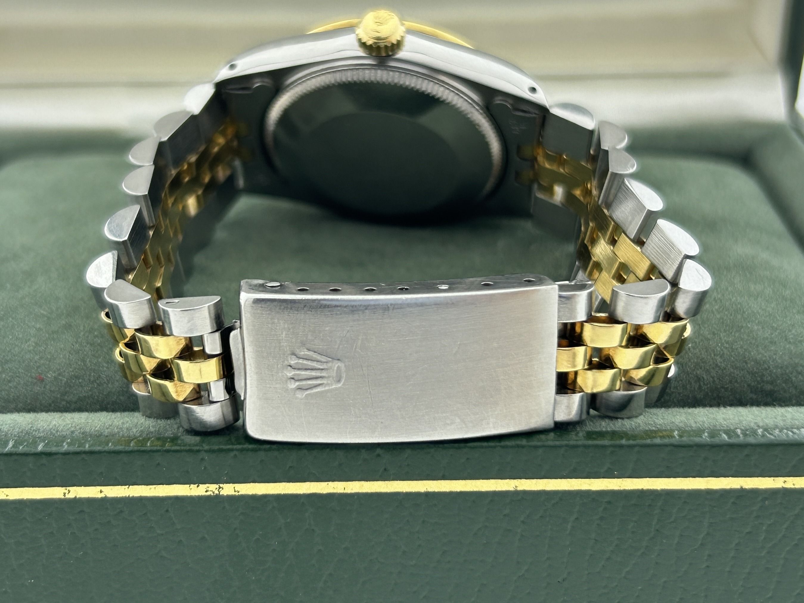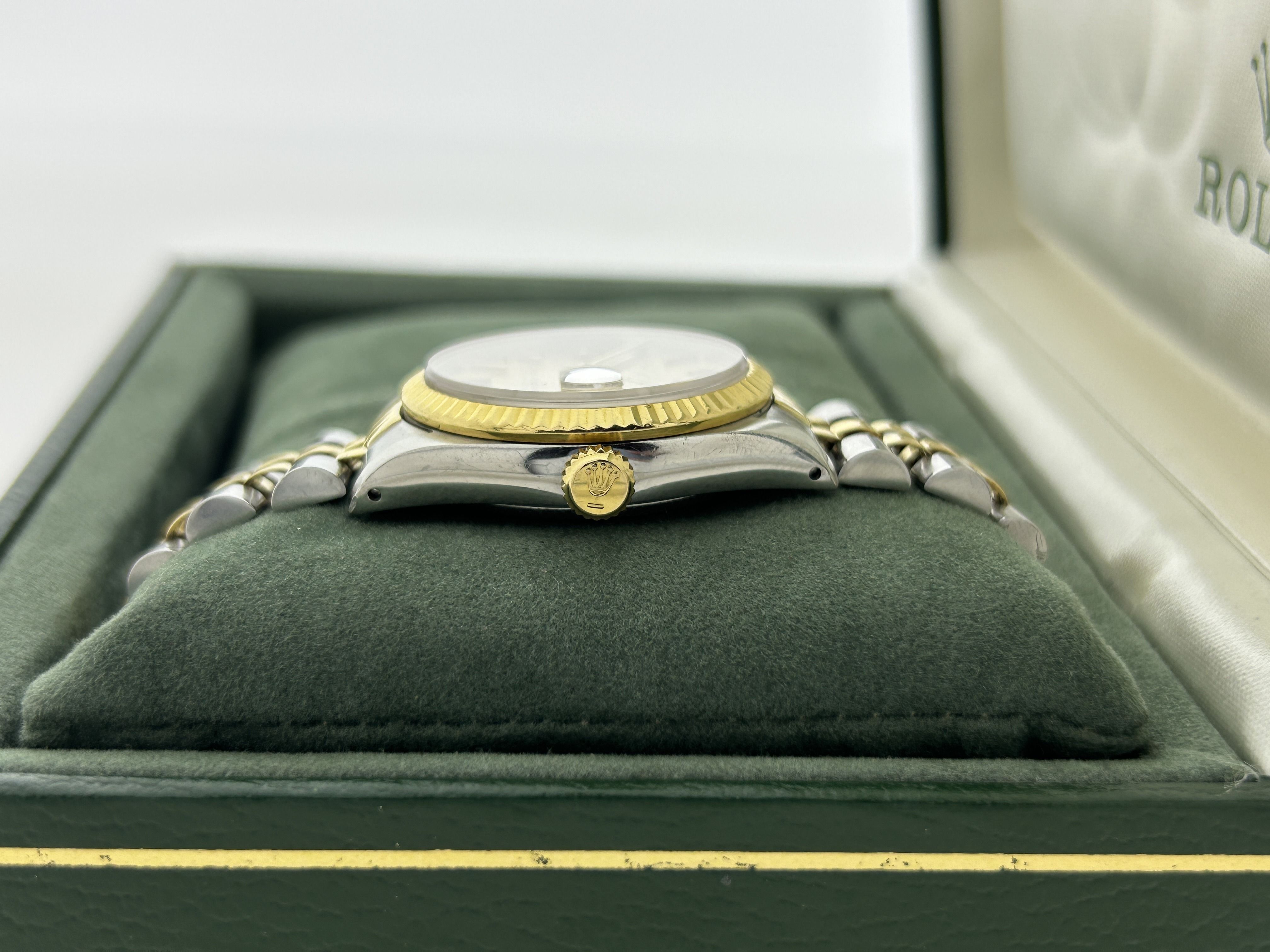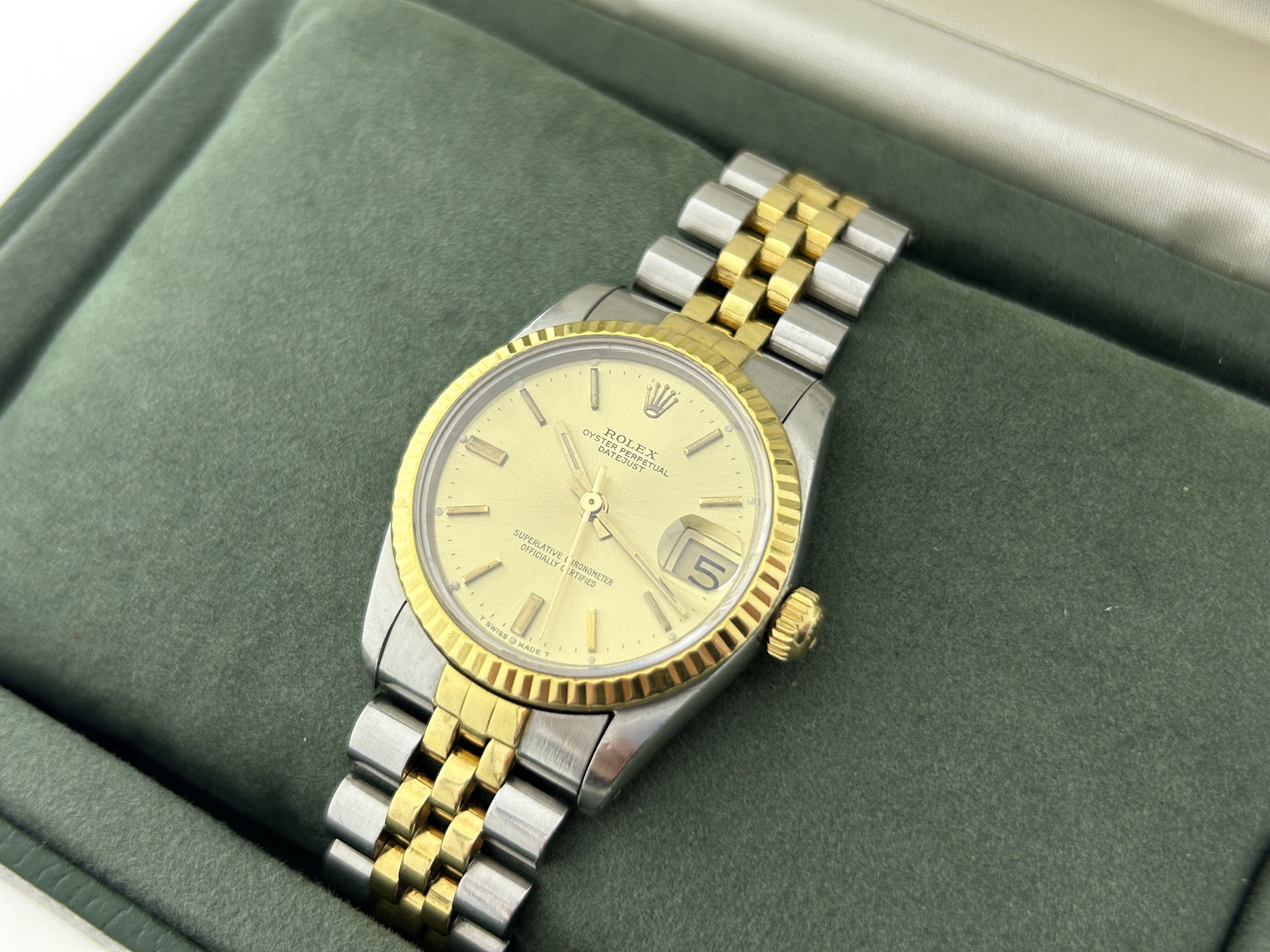 Un Rolex Datejust 31 in oro/acciaio, rif. 68273, del 1984. Il Rolex ha una cassa in acciaio da 31 mm, con un bracciale Jubilee in oro/acciaio e una lunetta scanalata in oro giallo. L'orologio ha un quadrante color champagne con una finestra della data alle 3. L'orologio è in buone condizioni ed è stato recentemente revisionato. L'orologio presenta alcuni graffi.
