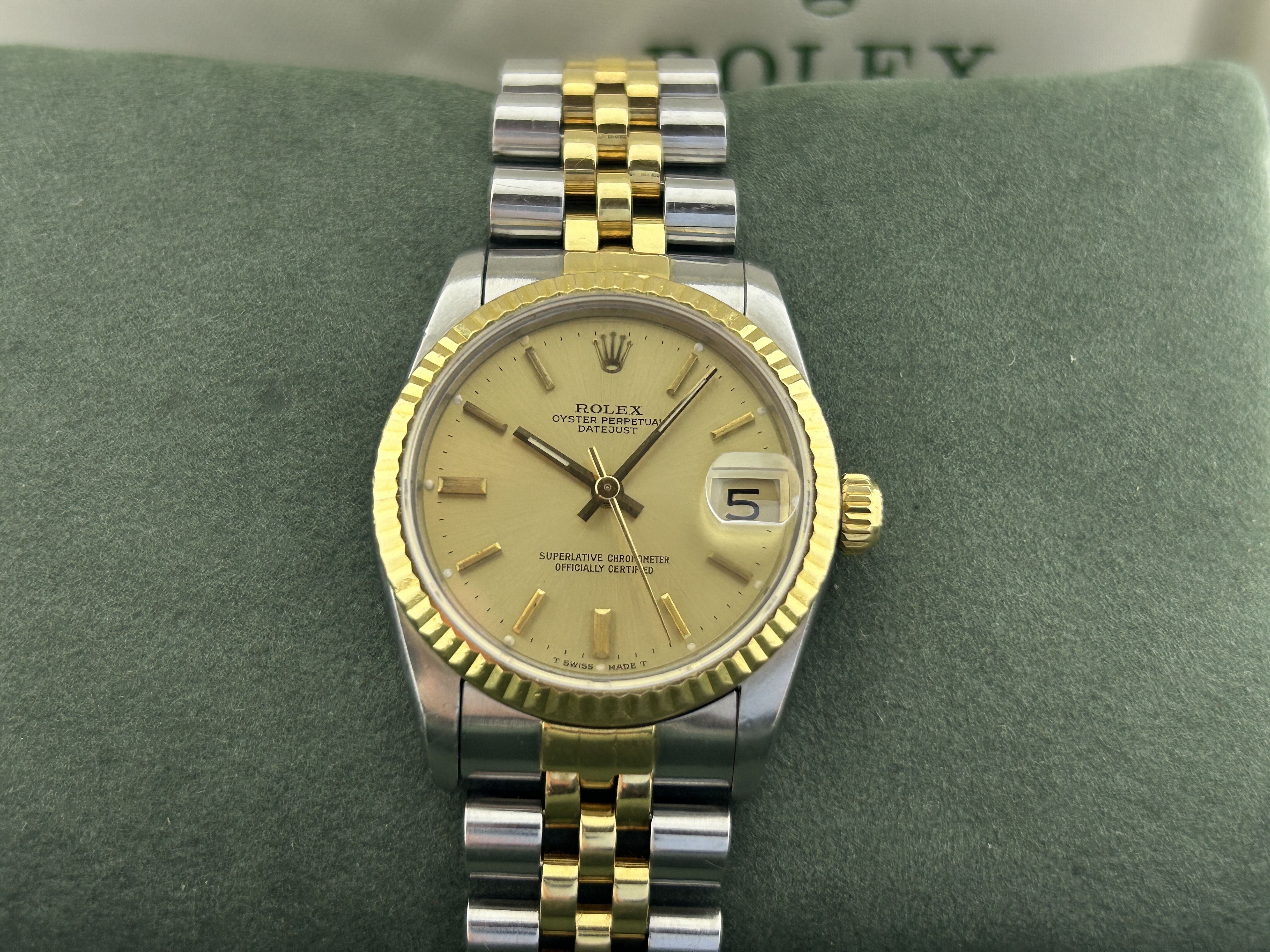 The Rolex comes with 24 months of warranty.A gold/steel Rolex Datejust 31, ref. 68273, from 1984. The Rolex has a steel 31mm case, with a gold/steel Jubilee-bracelet and a yellow gold fluted bezel. The watch has a champagne-colored dial with a date-window at 3 o'clock. The watch is in a good condition and has been serviced recently. The watch has some scratches.