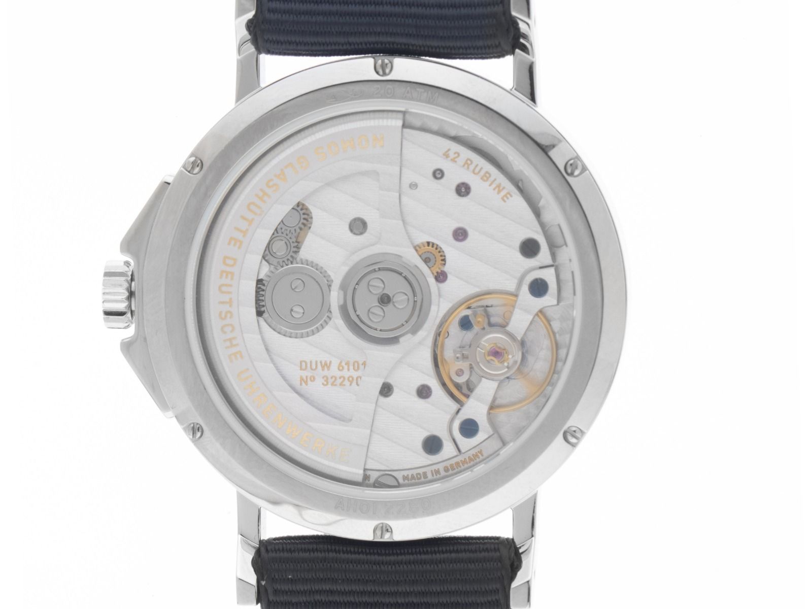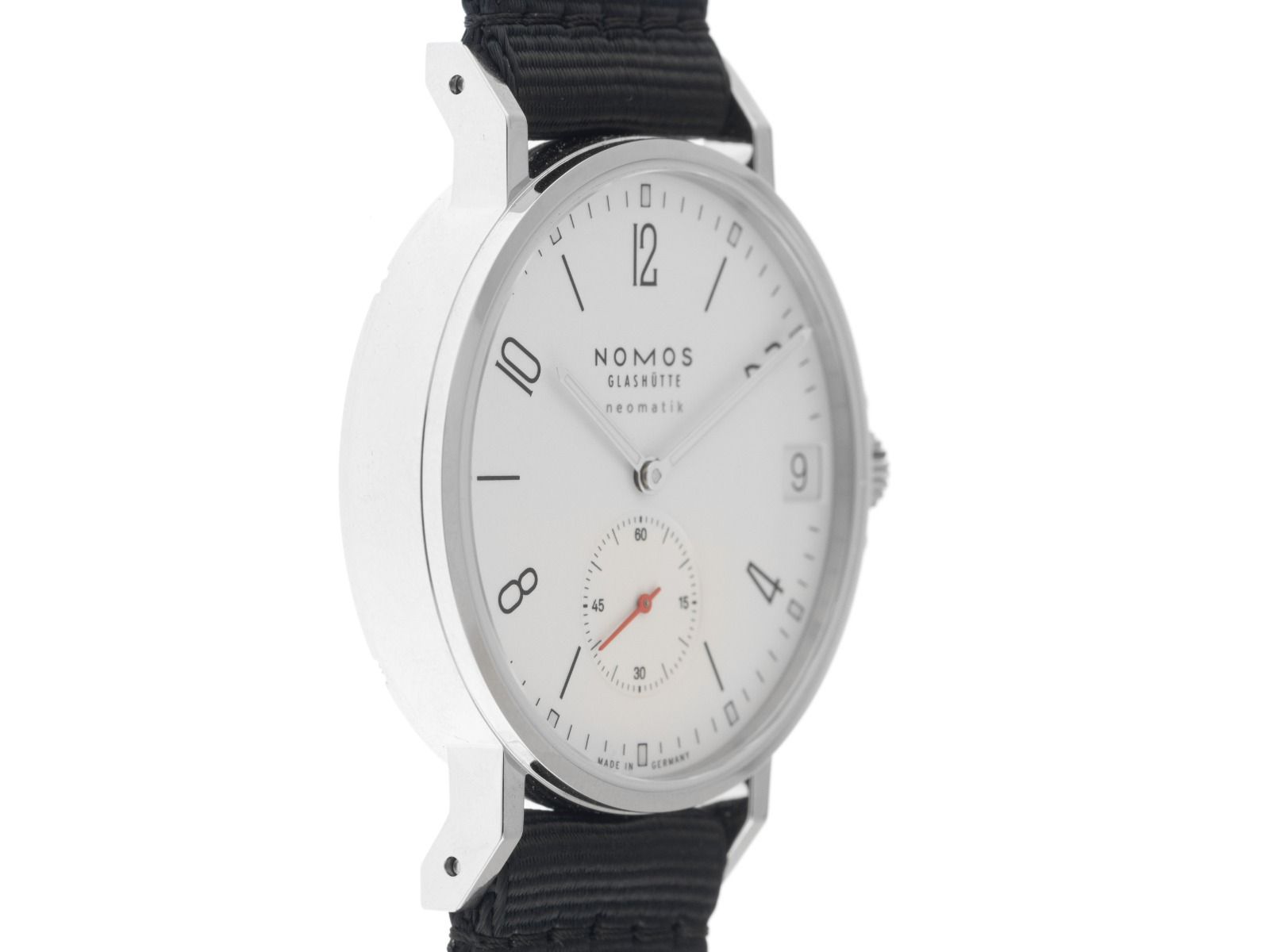 Cassa in acciaio inox a due pezzi, lucidata, diametro cassa senza corona 38,5mm, altezza cassa 9,9mm. Cinturino tessile blu-nero, larghezza dell'ansa 20mm, fibbia a perno in acciaio inox con logo del produttore. Quadrante, bianco argentato, galvanizzato con numeri arabi neri, indici e lancette luminose in acciaio inox, oltre a una lancetta dei secondi rossa. Movimento automatico, calibro di manifattura Nomos DUW 6101 con 42 rubini, riserva di carica di circa 42 ore. Indicazione di ore e minuti tramite lancette centrali, piccolo secondo con fermo dei secondi per la regolazione precisa dell'ora alle 6. Vetro zaffiro antigraffio. Corona a vite con protezione laterale e logo del produttore. Fondello in acciaio inox avvitato 6 volte e inciso con finestra in vetro zaffiro. Peso dell'orologio incluso il cinturino 58g. Impermeabile fino a 20 ATM. Numero di riferimento: 525. ID: ST116055500725H-4020, numero articolo: 10000081717. Scatola originale Nomos con imballaggio e documenti di garanzia del 2025, Full Set. Nuovo. Tempi di consegna immediati.