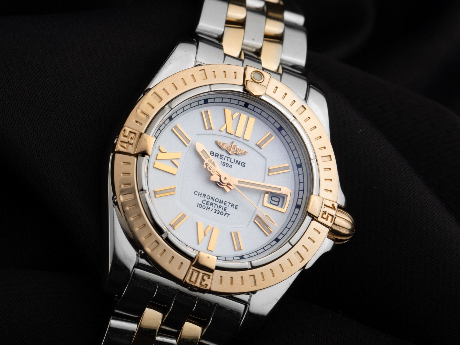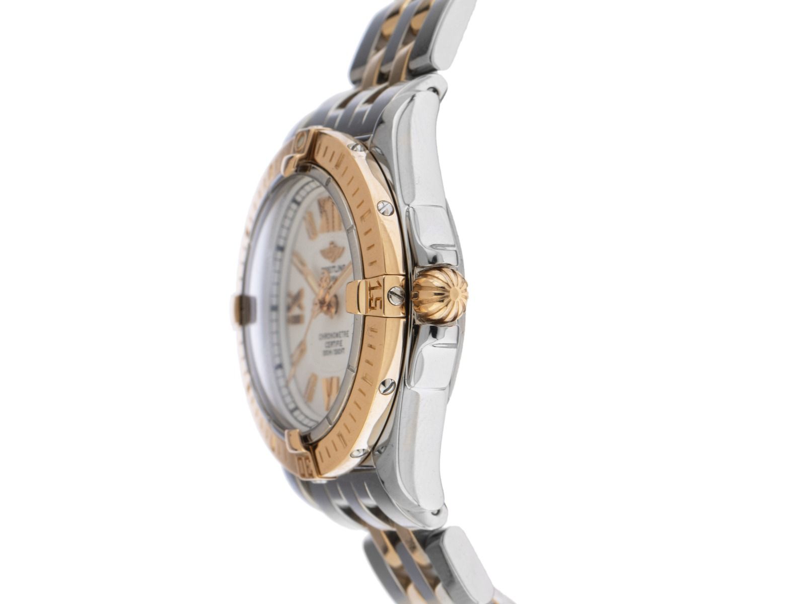 Cassa in acciaio lucido, diametro della cassa senza corona 32mm, altezza della cassa 12,4mm. Lunetta in oro rosa 18kt con indicatori e suddivisione a 60 minuti, unidirezionale. Bracciale in acciaio / oro rosa 18kt lucido, chiusura pieghevole di sicurezza in acciaio con logo del produttore. Quadrante bianco con numeri romani in oro rosa applicati, indici in oro rosa e lancette in oro rosa. Movimento al quarzo, cronometro con certificato, calibro Breitling B71 con 7 pietre preziose. Indicazione di ore, minuti e secondi tramite lancette centrali con fermo secondi per la regolazione precisa dell'ora, indicazione della data con regolazione rapida a 3 ore. Vetro zaffiro antigraffio. Corona zigrinata con protezione laterale. Fondello in acciaio avvitato e inciso con rilievo Breitling. Peso dell'orologio incluso il bracciale 91g, lunghezza del bracciale incluso la cassa 160mm. Numero di riferimento: C71356, numero della cassa: 1118XXX, ID: KS165944001025H-6200, numero articolo: 10000082866. Con controllo del movimento, batteria nuova e completa ristrutturazione esterna di novembre 2025. Scatola originale Breitling con confezione esterna e descrizione, oltre a estratto del Watch Register di novembre 2025, certificato The Watch Register / senza registrazione (database internazionale per orologi smarriti o rubati). Super affare, pezzo da collezione molto raro. Ottime condizioni. Tempi di consegna immediati.