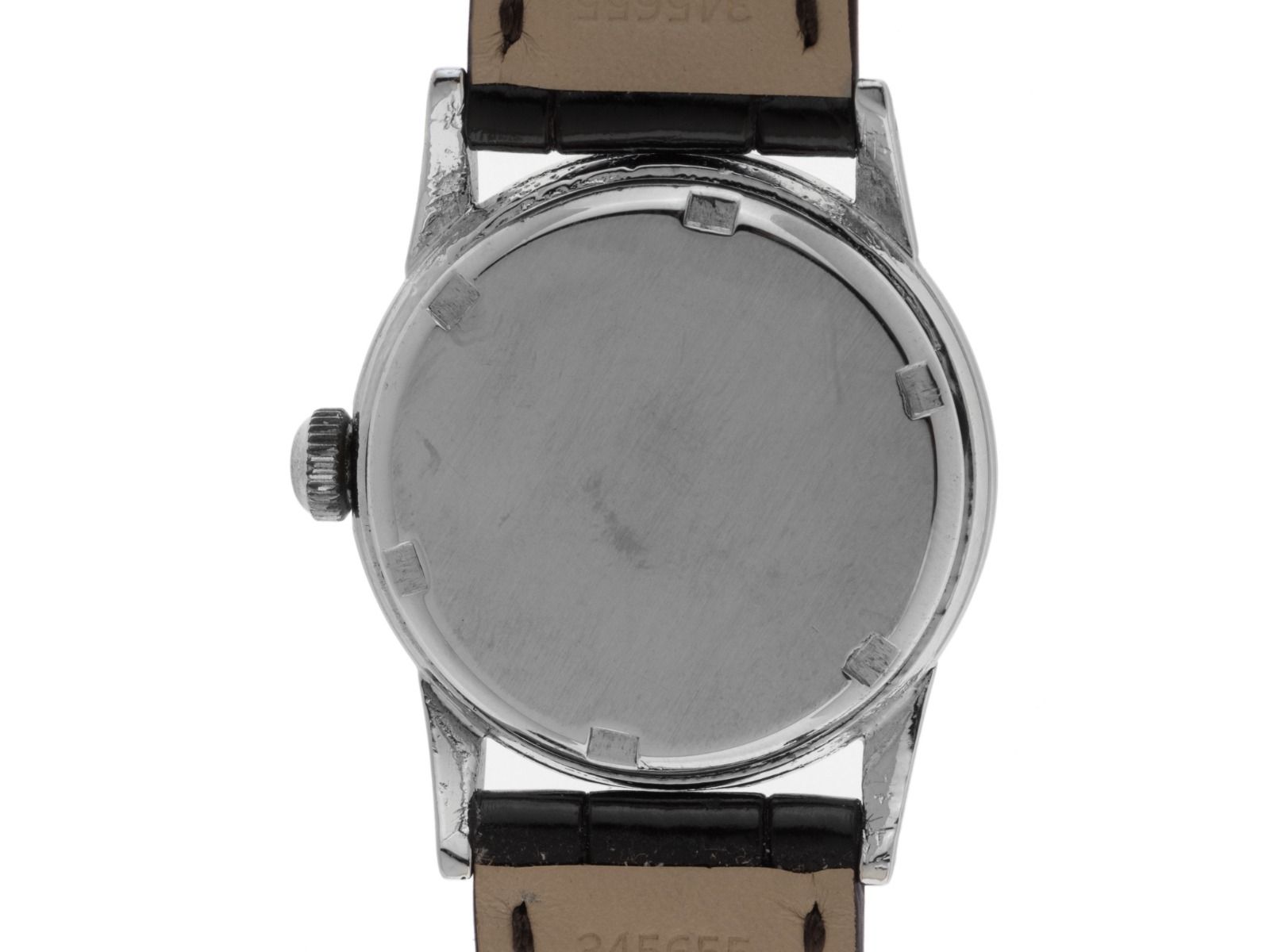 Cassa in acciaio lucido e satinato, diametro cassa senza corona 34mm, altezza cassa 10,0mm. Lunetta in acciaio liscia e lucida. Cinturino Rolex in pelle di coccodrillo nera con cucitura decorativa, larghezza attacco 19mm, fibbia a perno Rolex con logo del produttore. Quadrante color crema con indici e lancette in oro giallo, e stampa "Shock Resisting" alle 6. Movimento manuale, calibro di manifattura Rolex 710 con 15 rubini. Indicazione di ore, minuti e secondi tramite lancette centrali. Plexiglass. Corona con logo del produttore. Fondello in acciaio avvitato. Peso dell'orologio incluso il cinturino 35g. Numero di riferimento: 4490, numero di cassa: 425XXX, anno di costruzione: 1958, ID: P181125581025H-4650, numero articolo: 10000082900. Con controllo del movimento e completa revisione esterna di novembre 2025. Scatola originale Rolex con cuscinetto e libretto di traduzione e estratto del Watch Register di novembre 2025, certificato The Watch Register / senza registrazione (database internazionale per orologi smarriti o rubati). Pezzo da collezione molto raro. Ottime condizioni. Tempo di consegna immediato.