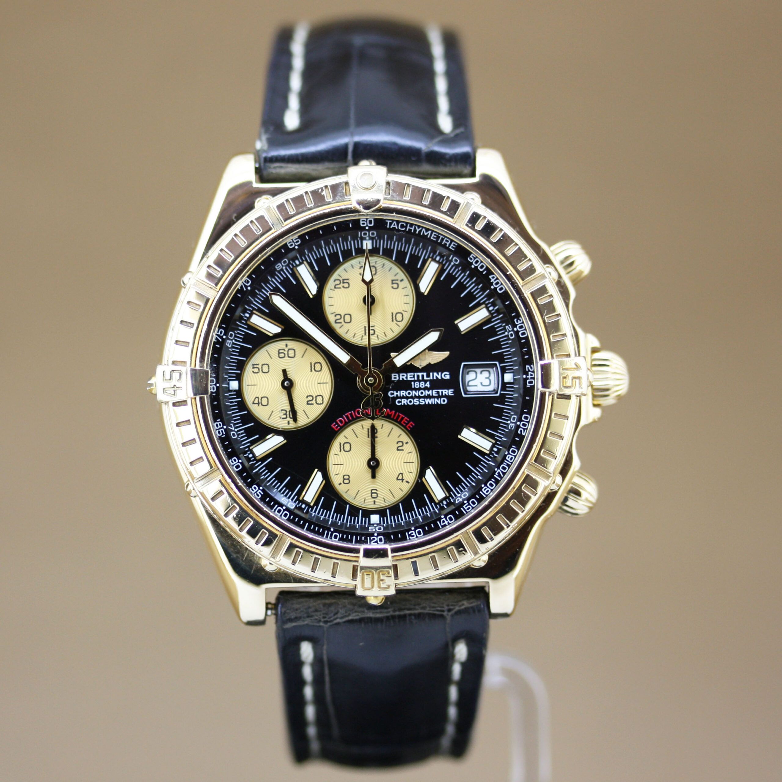 In very good condition Breitling Crosswind k13355 limited edition, equipped with an 18K gold case. This model has a black dial with gold subdials. Watch has a leather strap with 18K folding clasp. Comes complete with box and papers.