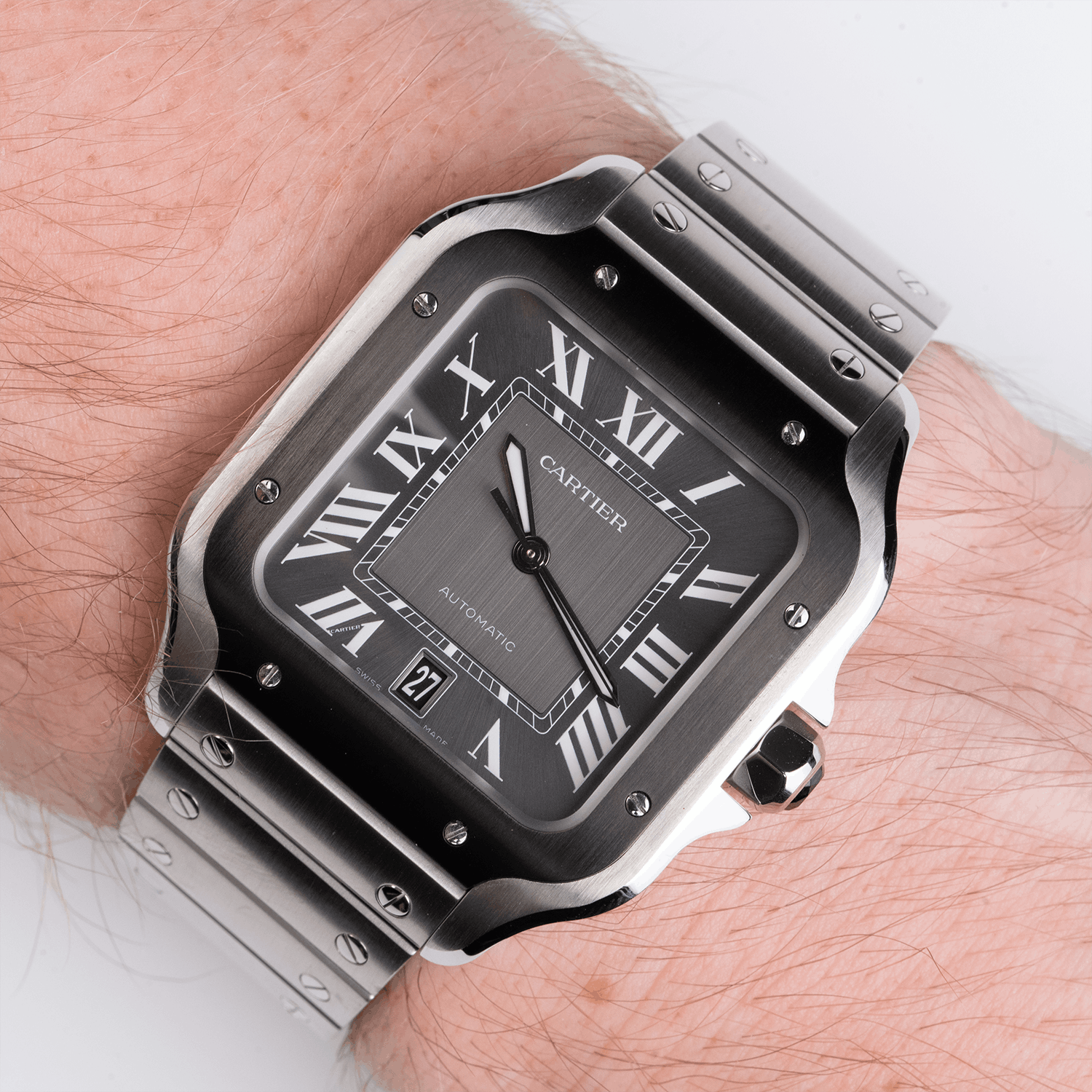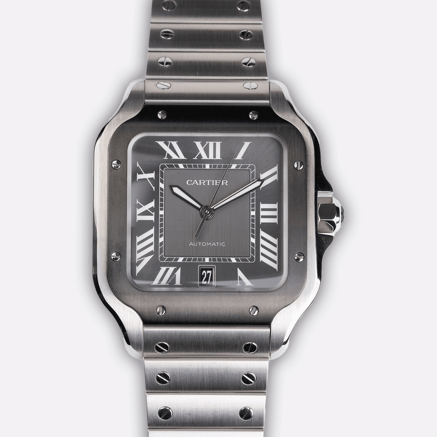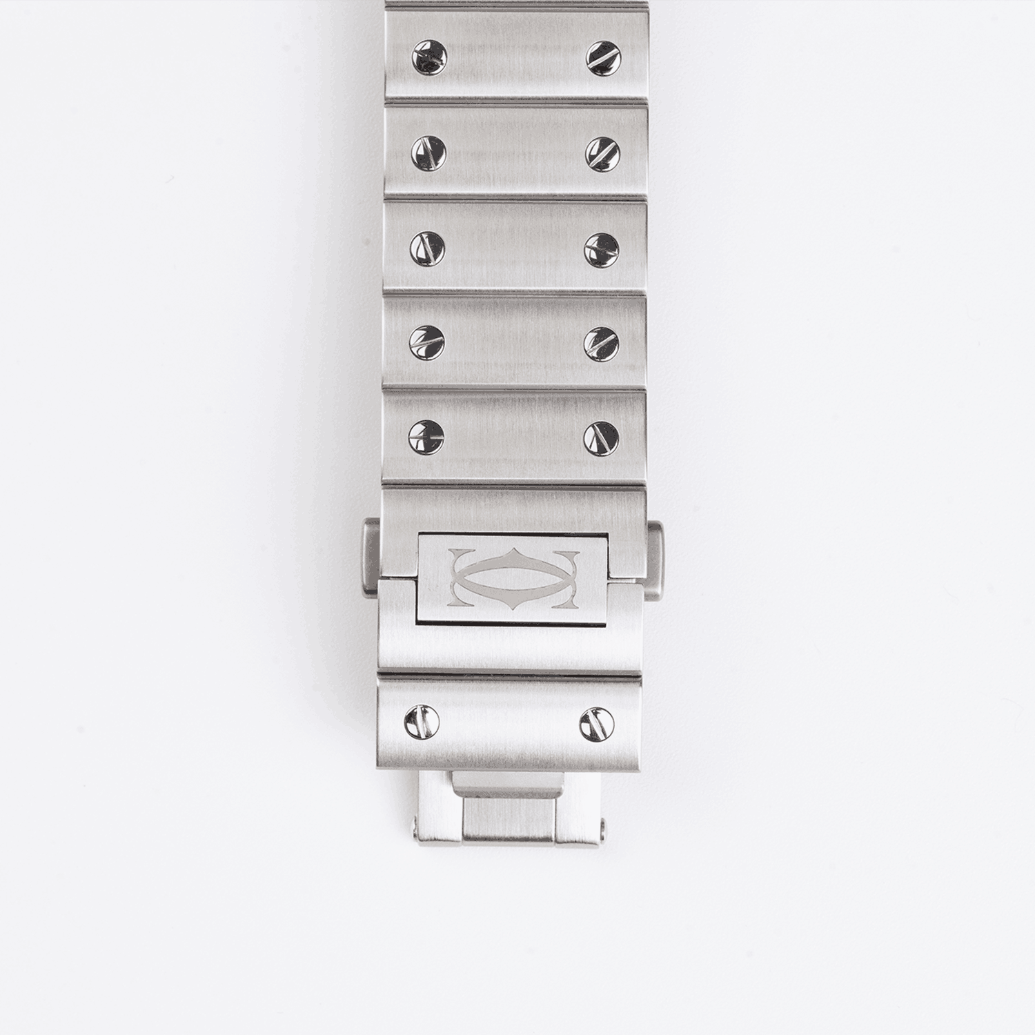 Il più sportivo della sua categoria: Ti presentiamo il nostro modello Cartier Santos sicuramente più sportivo, con quadrante grigio scuro e lunetta dello stesso colore. Un grande vantaggio di questa serie? I link del bracciale possono essere rimossi facilmente con un semplice pulsante, senza bisogno di attrezzi. Così non è necessario un orologiaio per regolare il bracciale e tramite il sistema Quick Release puoi ordinare ulteriori bracciali in pelle. Purtroppo, il pulsante della scatola originale Cartier è difettoso, ma puoi comunque goderti una Santos a un prezzo assolutamente imbattibile. Inoltre, è inclusa la fibbia originale per un bracciale in pelle Cartier.