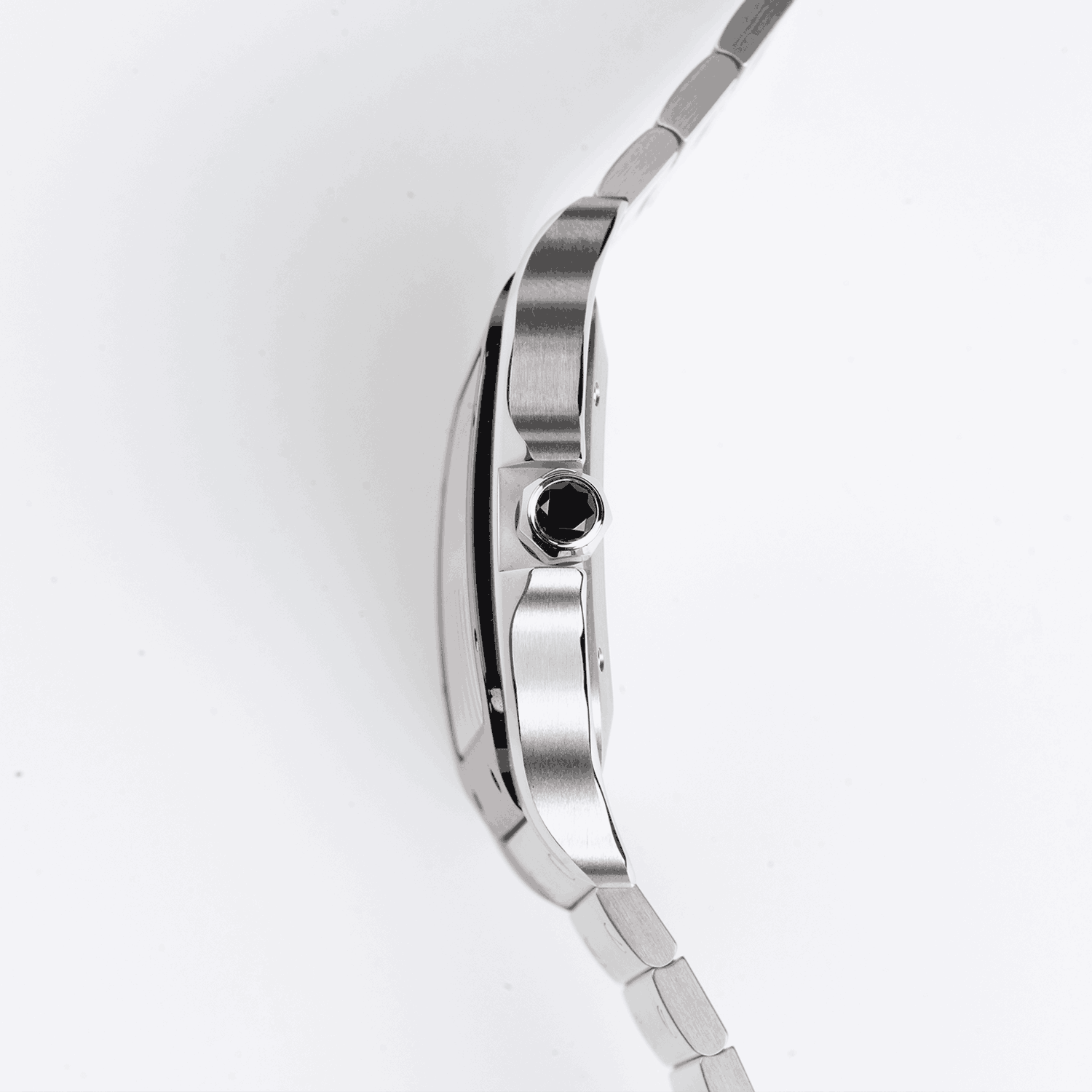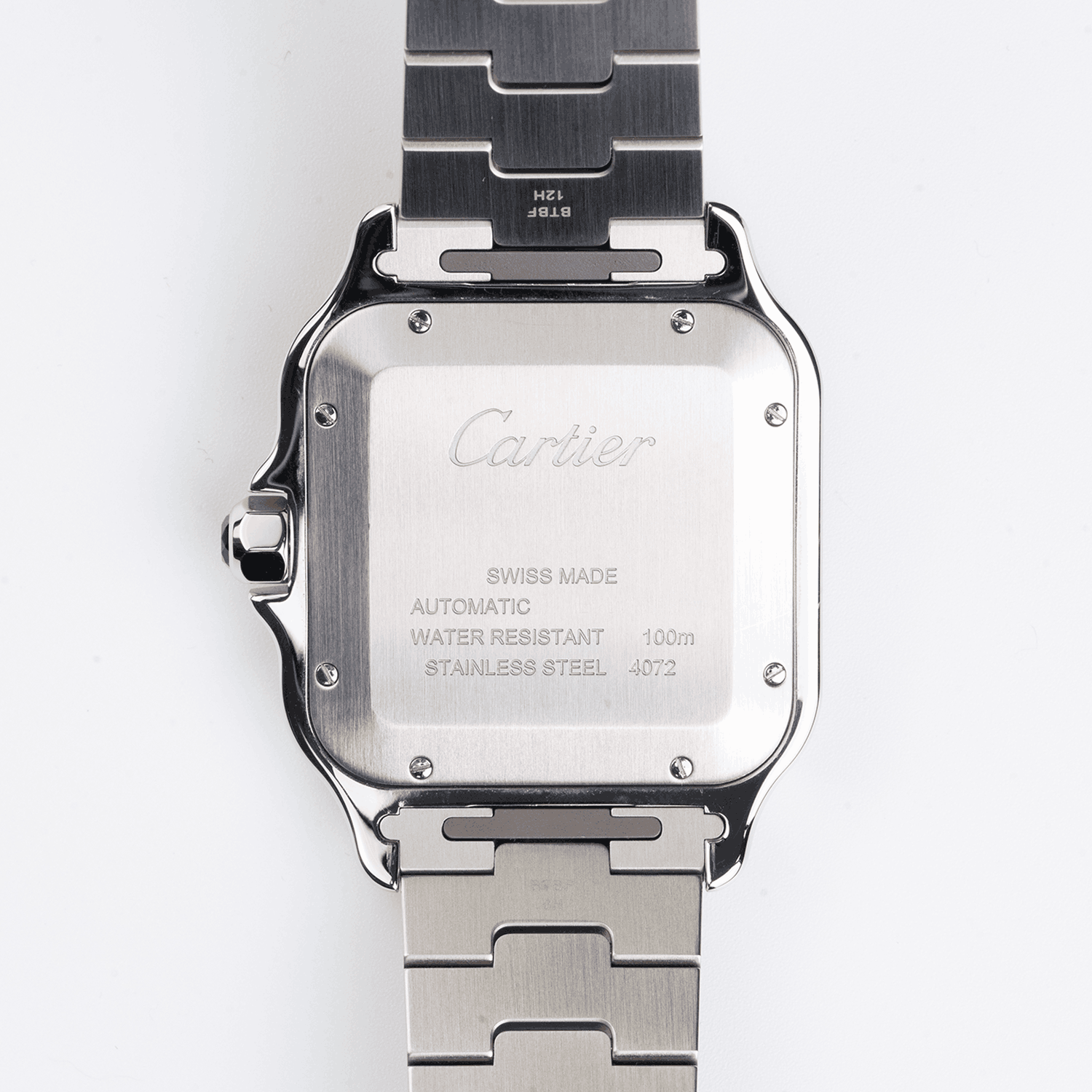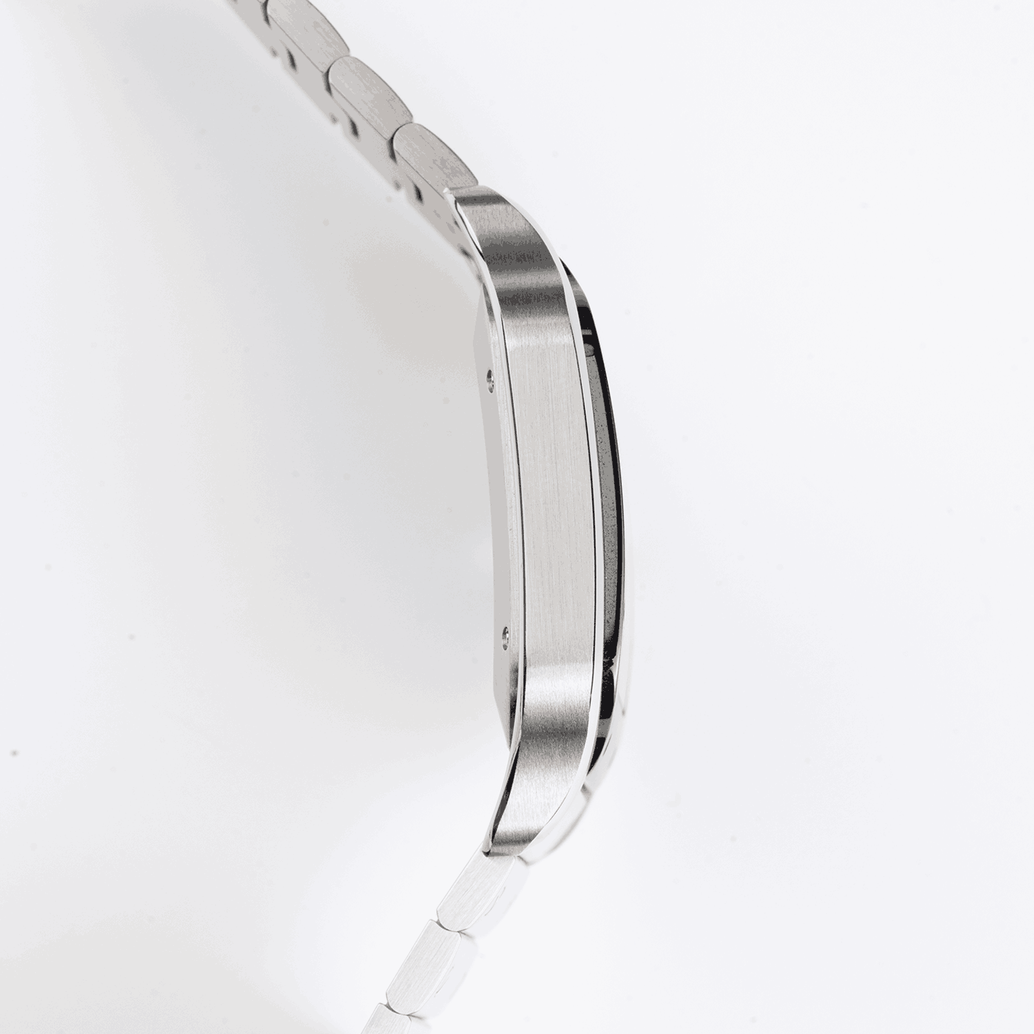 Il più sportivo della sua categoria: Ti presentiamo il nostro modello Cartier Santos sicuramente più sportivo, con quadrante grigio scuro e lunetta dello stesso colore. Un grande vantaggio di questa serie? I link del bracciale possono essere rimossi facilmente con un semplice pulsante, senza bisogno di attrezzi. Così non è necessario un orologiaio per regolare il bracciale e tramite il sistema Quick Release puoi ordinare ulteriori bracciali in pelle. Purtroppo, il pulsante della scatola originale Cartier è difettoso, ma puoi comunque goderti una Santos a un prezzo assolutamente imbattibile. Inoltre, è inclusa la fibbia originale per un bracciale in pelle Cartier.