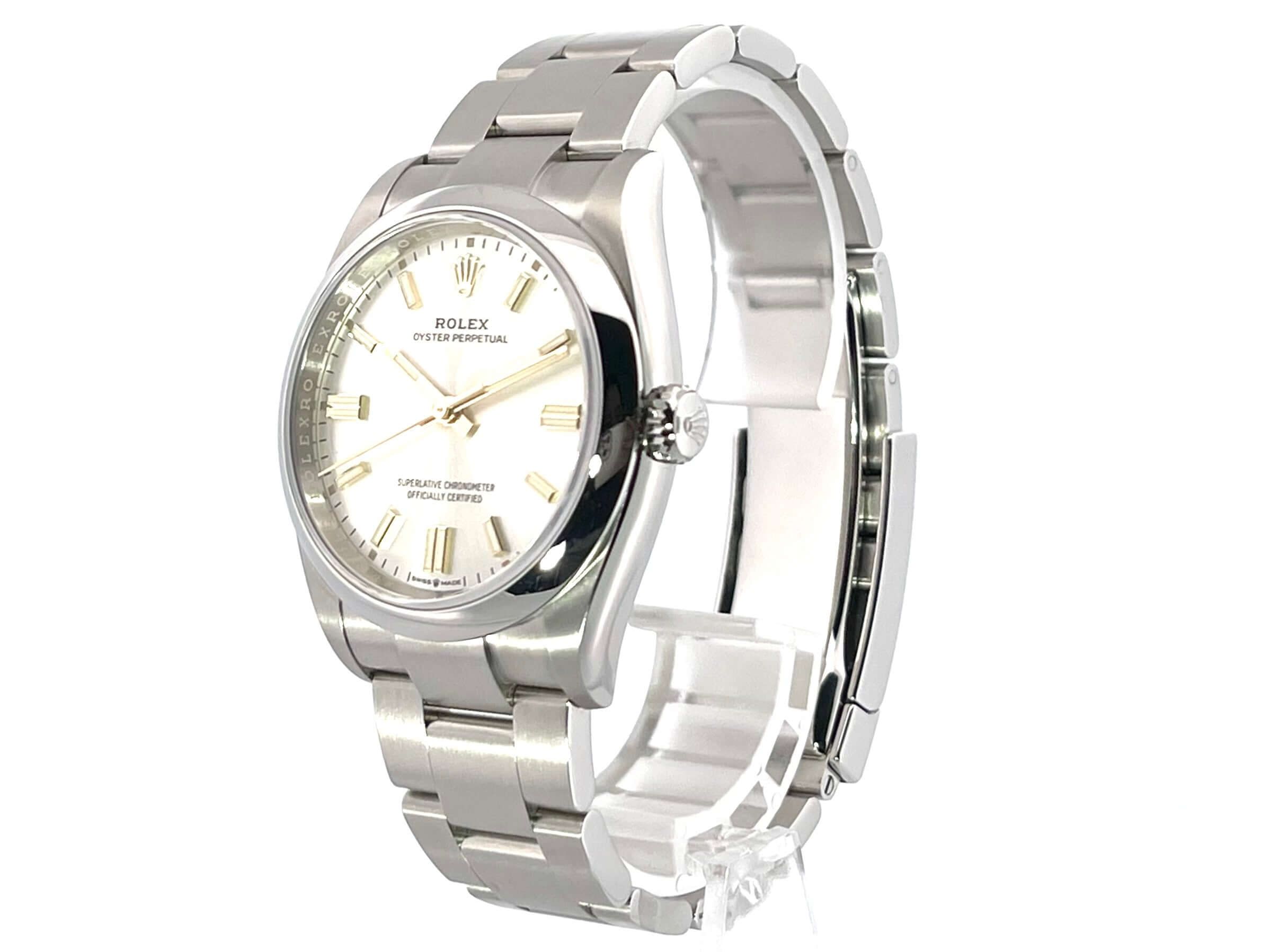Rolex Oyster Perpetual 36 Ref. 126000 Silver dialPolished and satin-finished stainless steel case, case diameter 36 mm, satin-finished Oyster stainless steel bracelet with folding clasp, silver-colored dial with applied luminous indices, automatic movement, Rolex manufacture caliber 3230, 70-hour power reserve, chronometer, sapphire crystal, waterproof up to 10 bar.