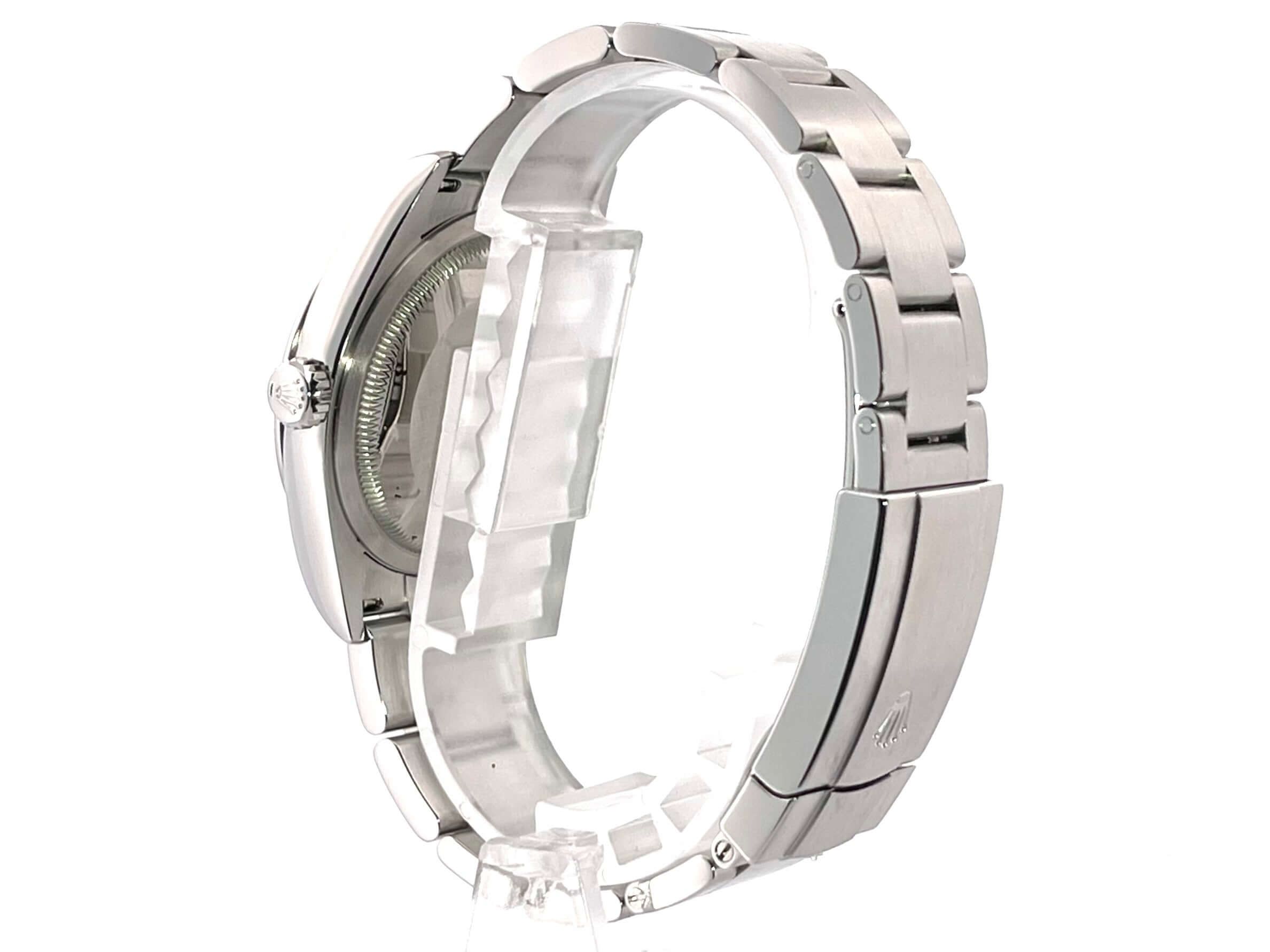 Cassa in acciaio inossidabile lucido e satinato, diametro della cassa 36 mm, bracciale Oyster in acciaio inossidabile satinato con chiusura pieghevole, quadrante argentato con indici luminosi applicati, movimento automatico, calibro 3230 di manifattura Rolex, riserva di carica di 70 ore, cronometro, vetro zaffiro, impermeabile fino a 10 bar.