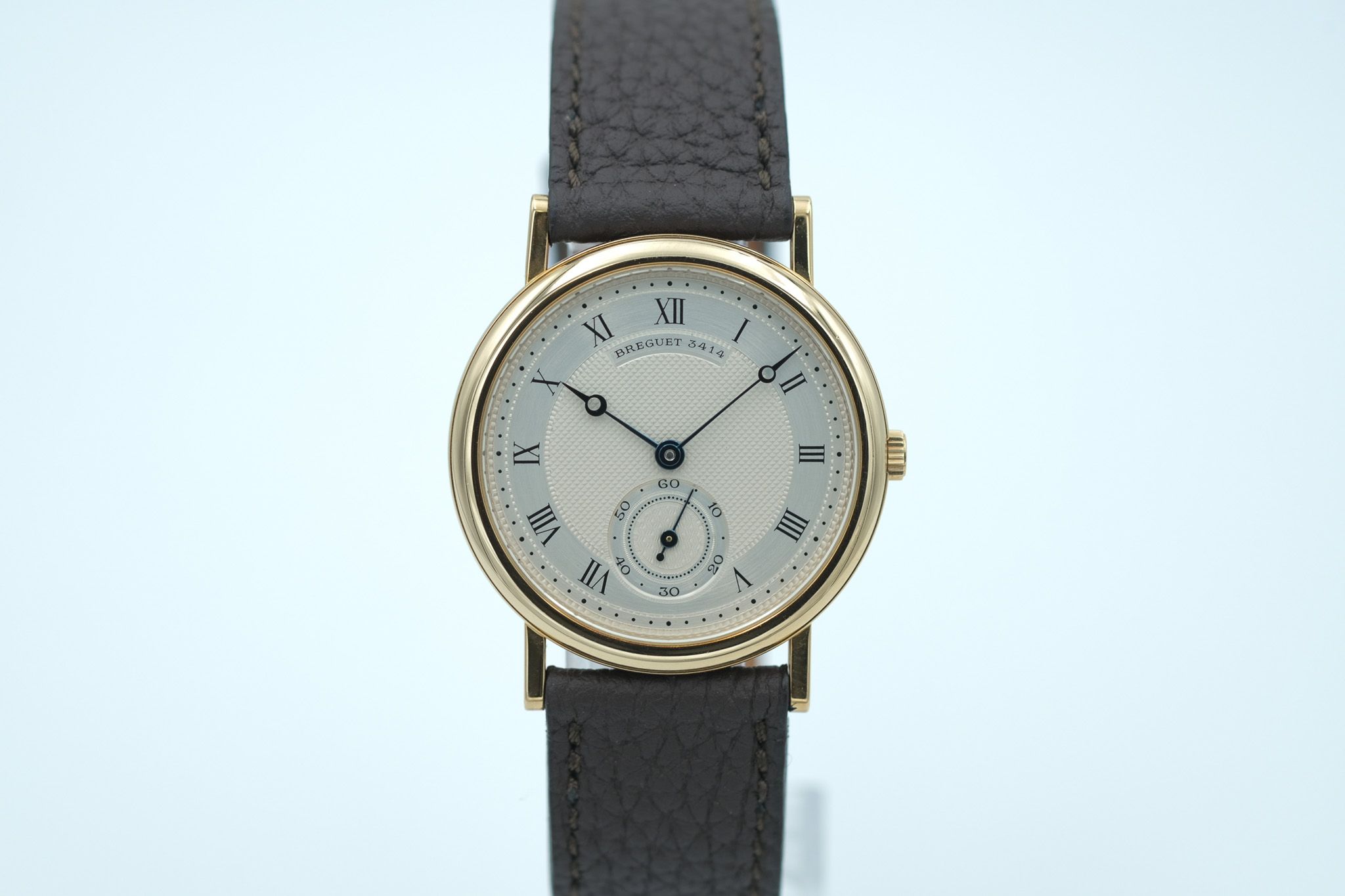 An elegant representative of traditional watchmaking, the Breguet Classique Ref. 3290 embodies all the aesthetic and technical characteristics that have defined the Maison for centuries: artisanal perfection, timeless proportions, and distinctive design details.The 18-carat yellow gold case with a diameter of 32 mm is in very good overall condition. Only slight superficial signs of wear are visible, but there are no scratches, dents, or deeper marks. The gold screw bars for the lugs and the clasp are no longer present. The original clasp is present.