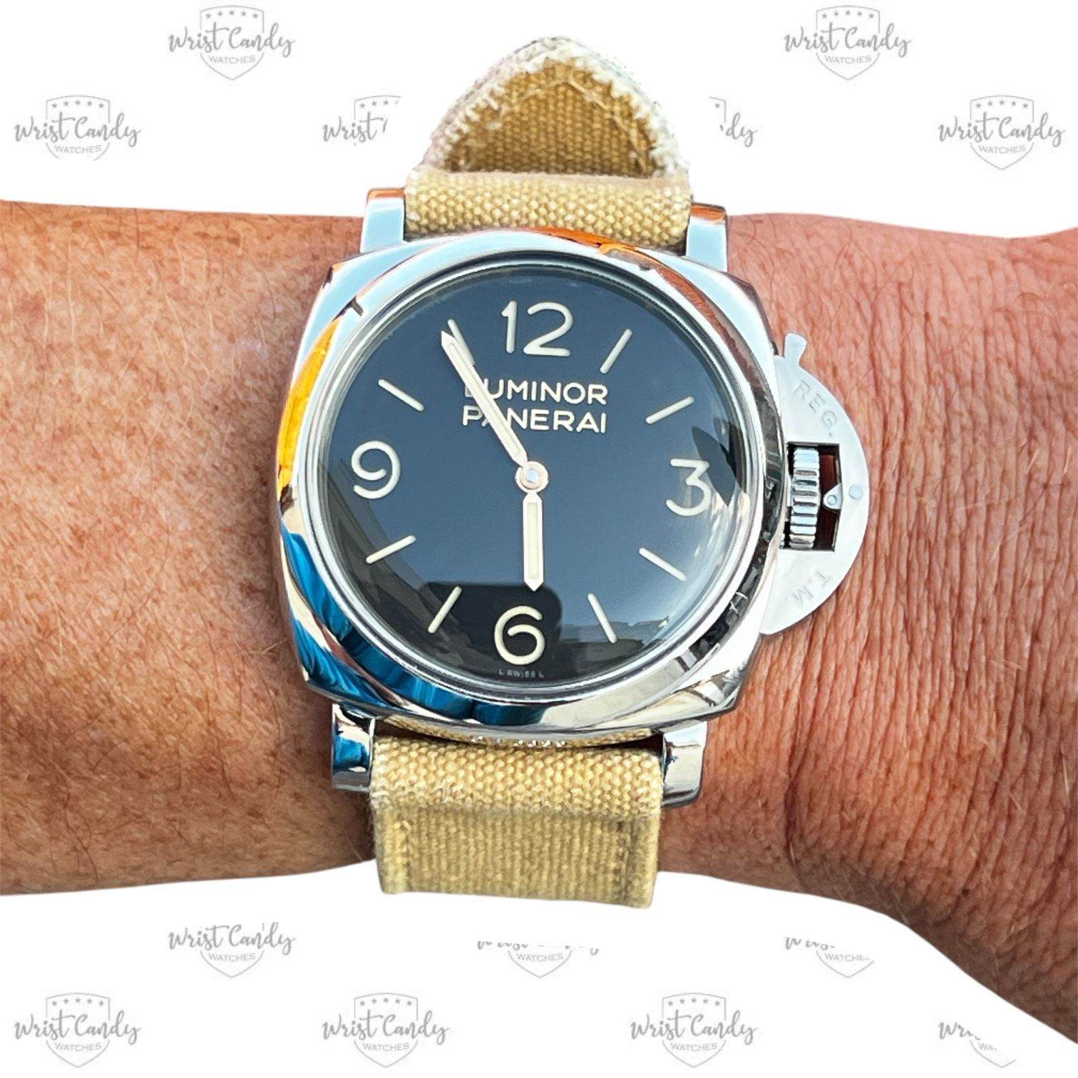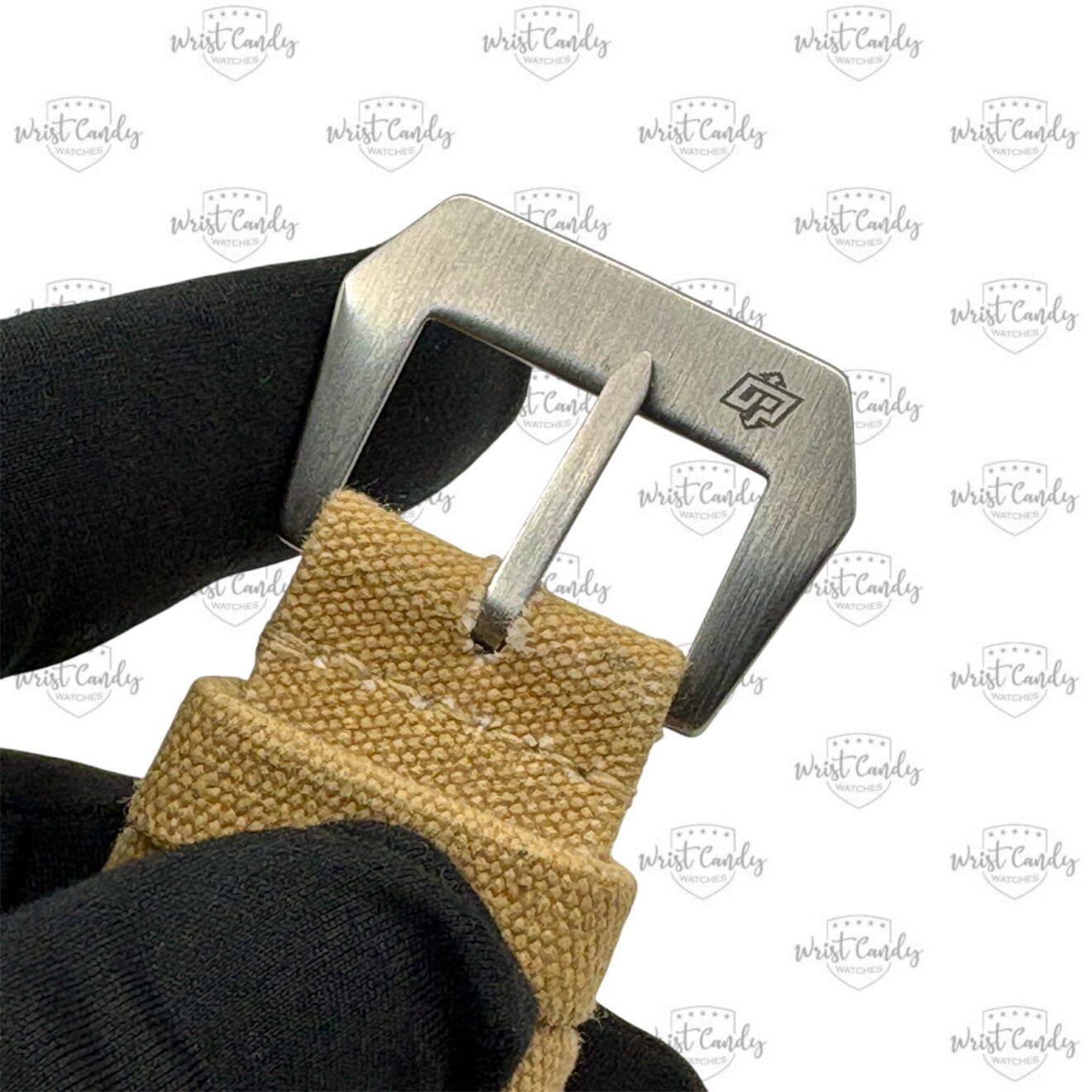 Secondo molti Paneristi, il più puro di tutti i Luminor: il 372. Questa è una set ultra completa: triplo imballaggio, con fattura d'acquisto originale, protezione per la lunetta, 2 cinturini Panerai originali e Olaf Lugten di D-Strap ha creato un cinturino in canvas personalizzato (€ 159,-). È stato servito nel 2024 da Wempe Germania per un valore di quasi € 700,-. Una cassa di 47 mm sembra enorme ed è anche robusta, ma su un polso di 19 cm sta davvero perfettamente.