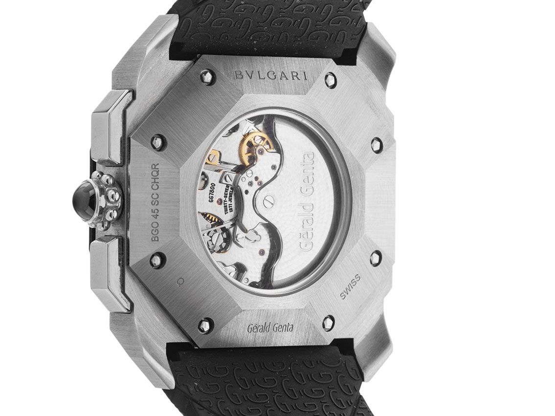 Cassa in acciaio lucido e satinato, ottagonale, diametro cassa senza corona 45mm, altezza cassa 15,0mm. Lunetta in acciaio rivestita di nero, lucida e satinata. Cinturino Bulgari in caucciù nero, larghezza ansa 30mm, chiusura deployante in acciaio con logo del produttore. Quadrante nero con numeri arabi e lancette in acciaio lucido. Movimento automatico, cronografo, cronometro con certificato, calibro 7800 con 37 pietre preziose. Indicazione dell'ora saltante e del minuto retrogrado tramite lancette centrali a ore 12, indicazione della data con regolazione rapida tramite lancetta a ore 6. Vetro zaffiro antigraffio. Corona con pietra preziosa nera. Fondello in acciaio avvitato 8 volte e inciso con finestra in vetro zaffiro. Peso dell'orologio incluso il cinturino 171g, lunghezza del cinturino incluso la cassa 185mm. Numero di riferimento: BGO45SCCHQR, numero di cassa: Q0XXX, ID: KS1737320001125H-24500, numero articolo: 10000083311. Con controllo del movimento e completa rifinitura esterna di novembre 2025. Scatola originale Bulgari con imballaggio e documenti di garanzia di novembre 2012, oltre a descrizione, due cinturini di ricambio, strumento di regolazione e panno per lucidare, oltre a estratto del Watch Register di novembre 2025, certificato del Watch Register / senza registrazione (database internazionale per orologi smarriti o rubati), Full Set. Super affare, investimento con potenziale di apprezzamento, pezzo da collezione estremamente raro. Come nuovo. Tempi di consegna immediati.