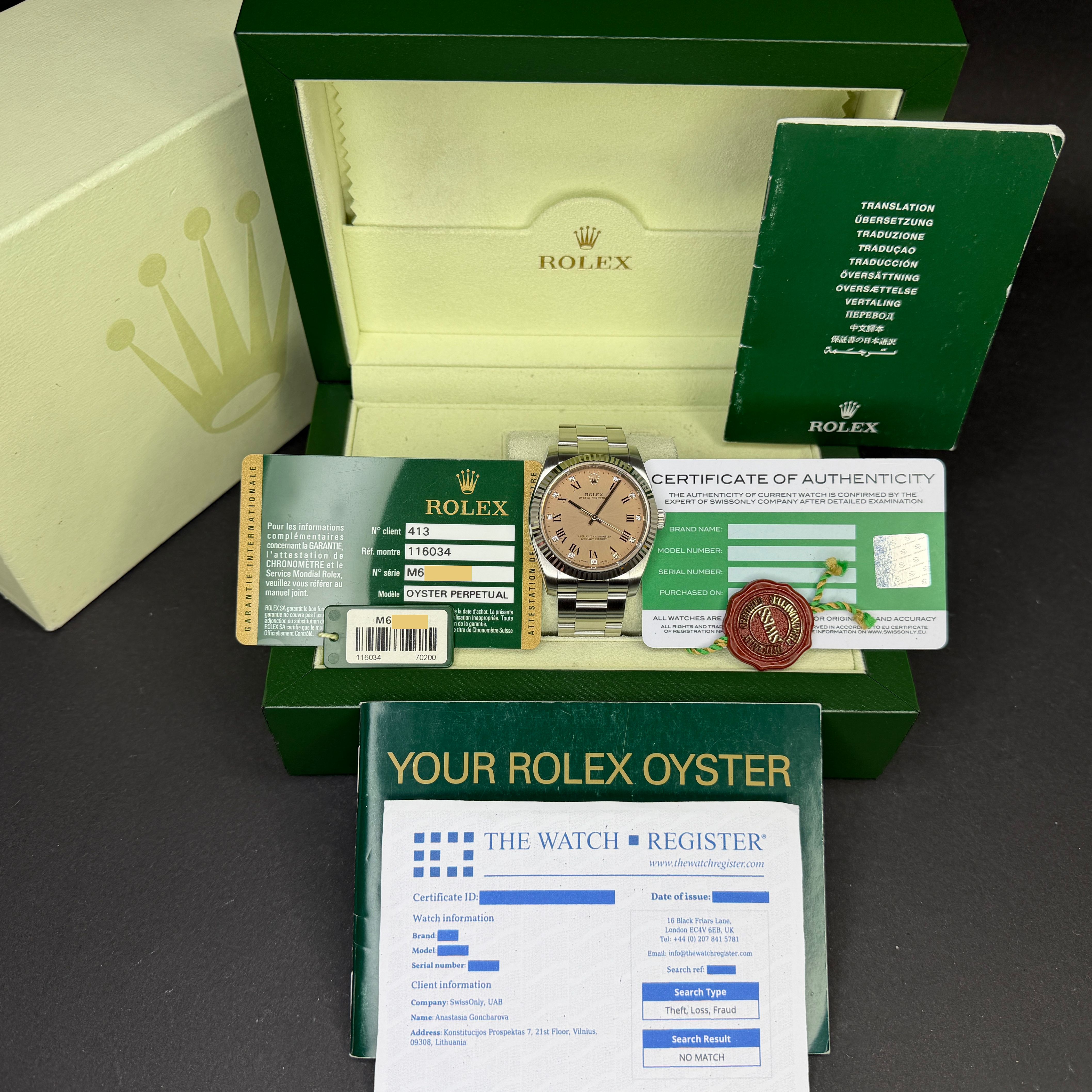 This Rolex Oyster Perpetual 116034 features a Pink diamond Roman dial and is crafted from stainless steel, with a production year of 2008.Case No: M61XXXX
