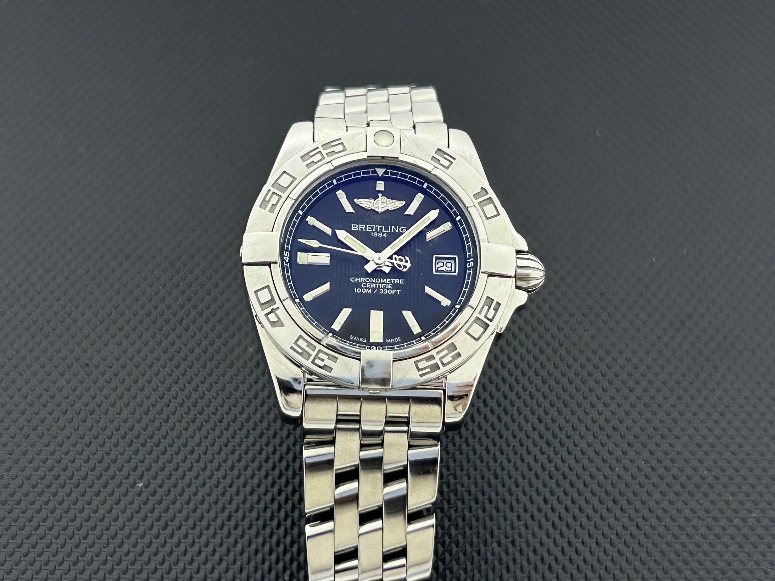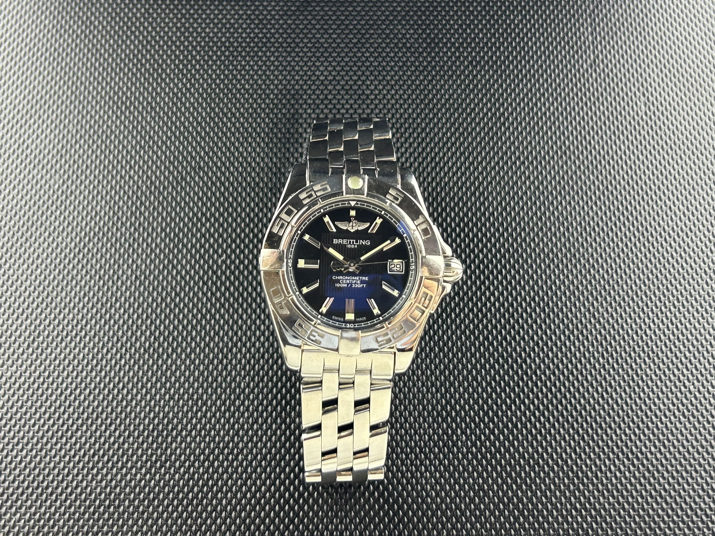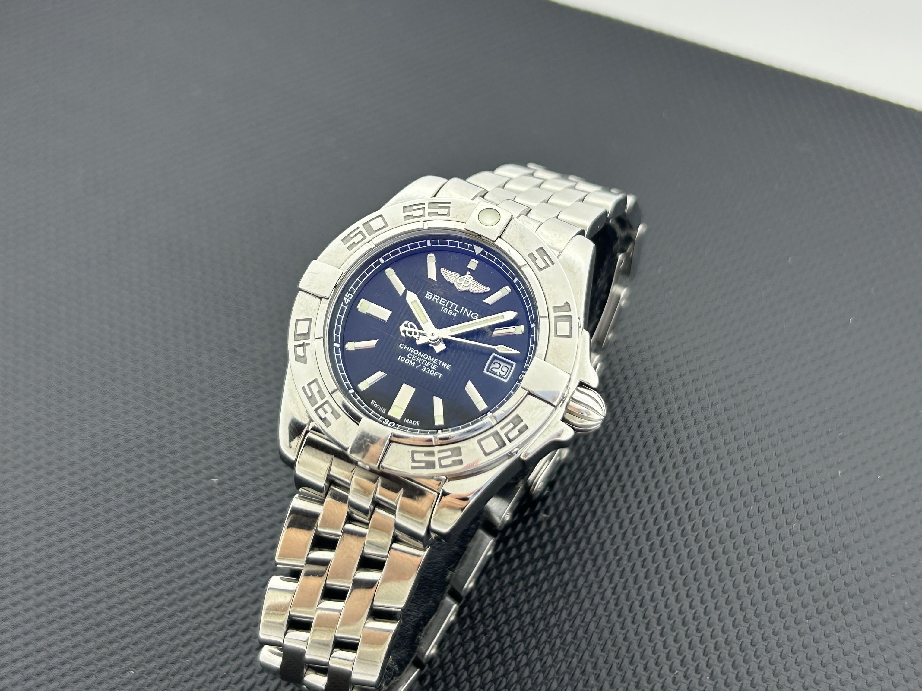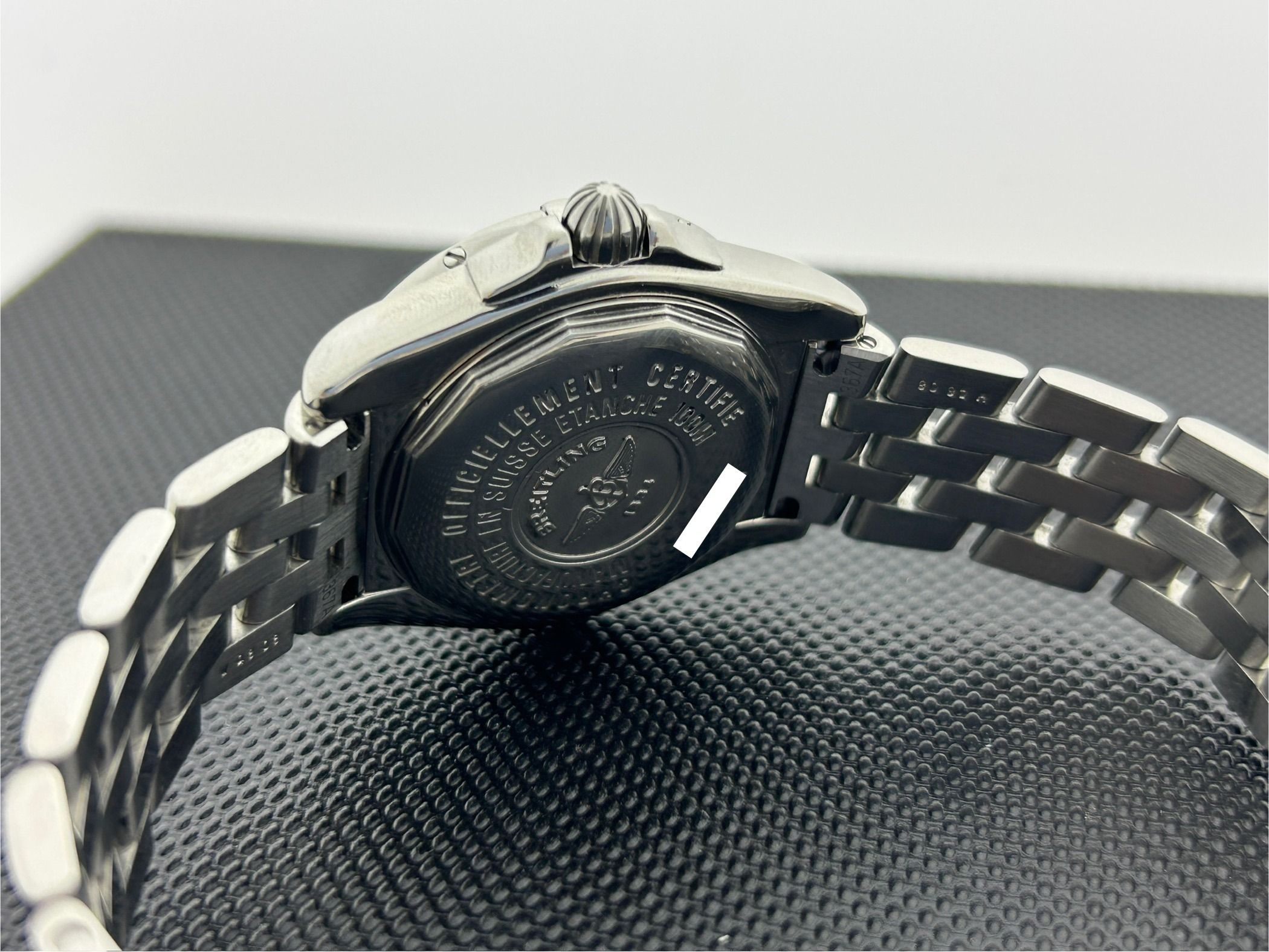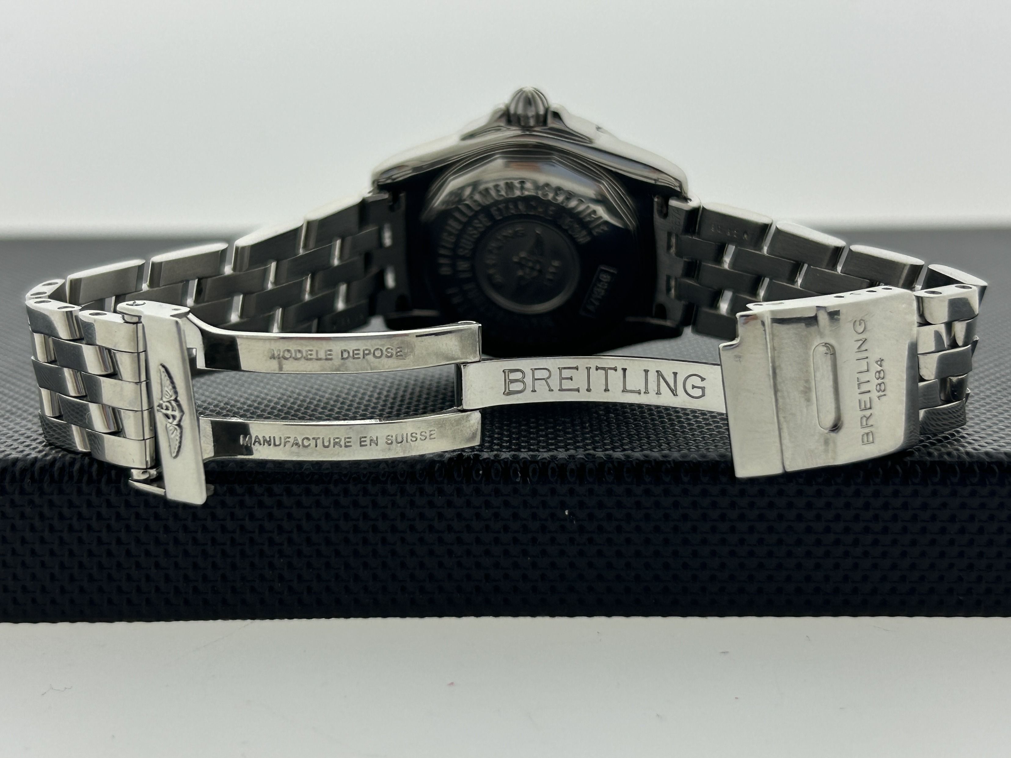 The Breitling comes with 24 months of warranty.A Breitling Cockpit Lady watch, ref. A71356. The watch has a steel 32mm case with a steel bracelet. The Breitling has a black dial with a date-window at 3 o'clock. The watch has been serviced recently and is in a great condition.