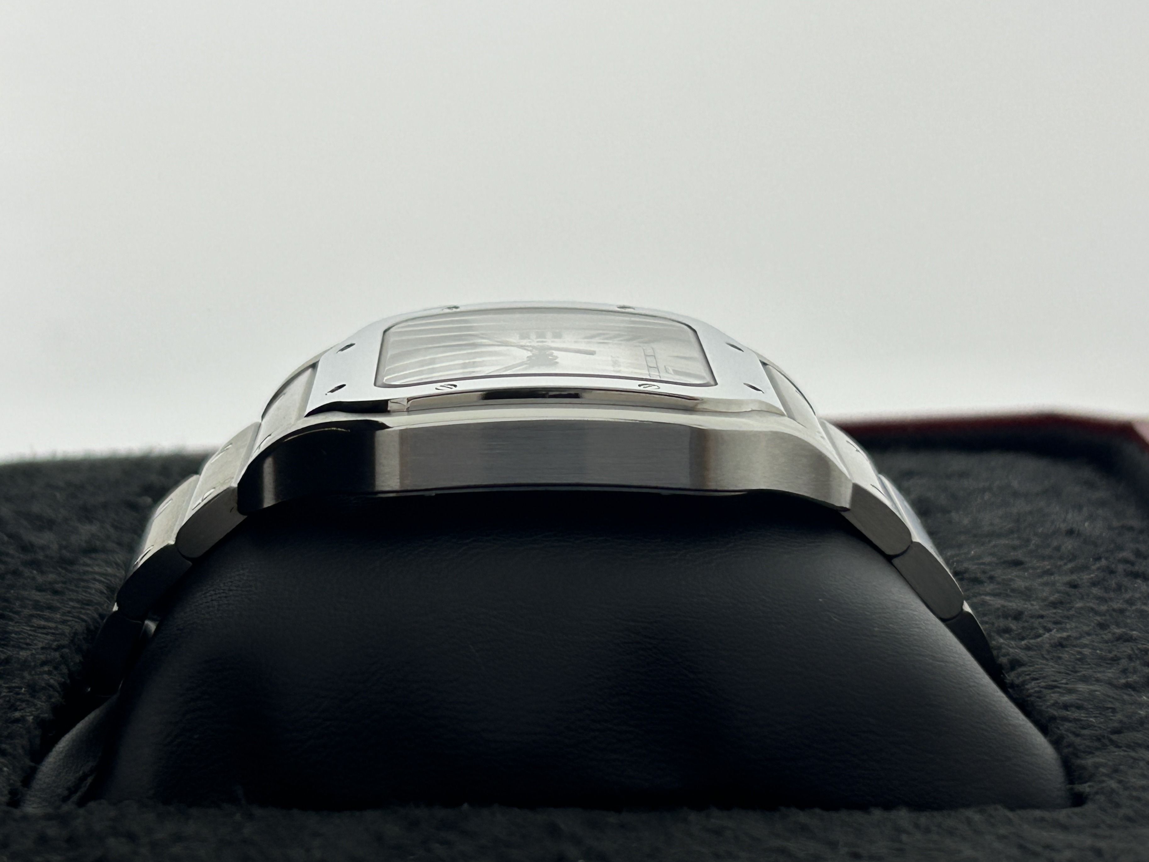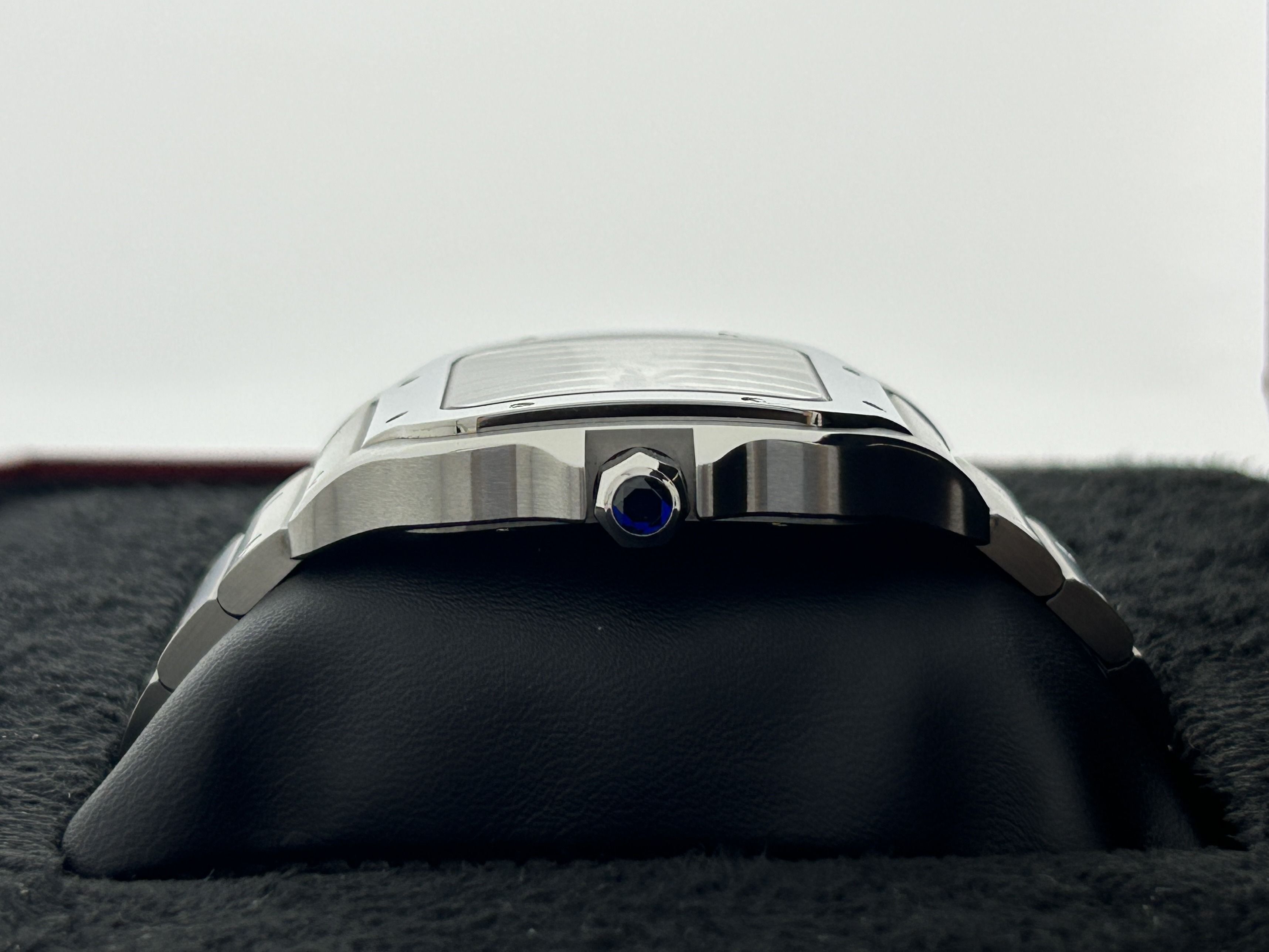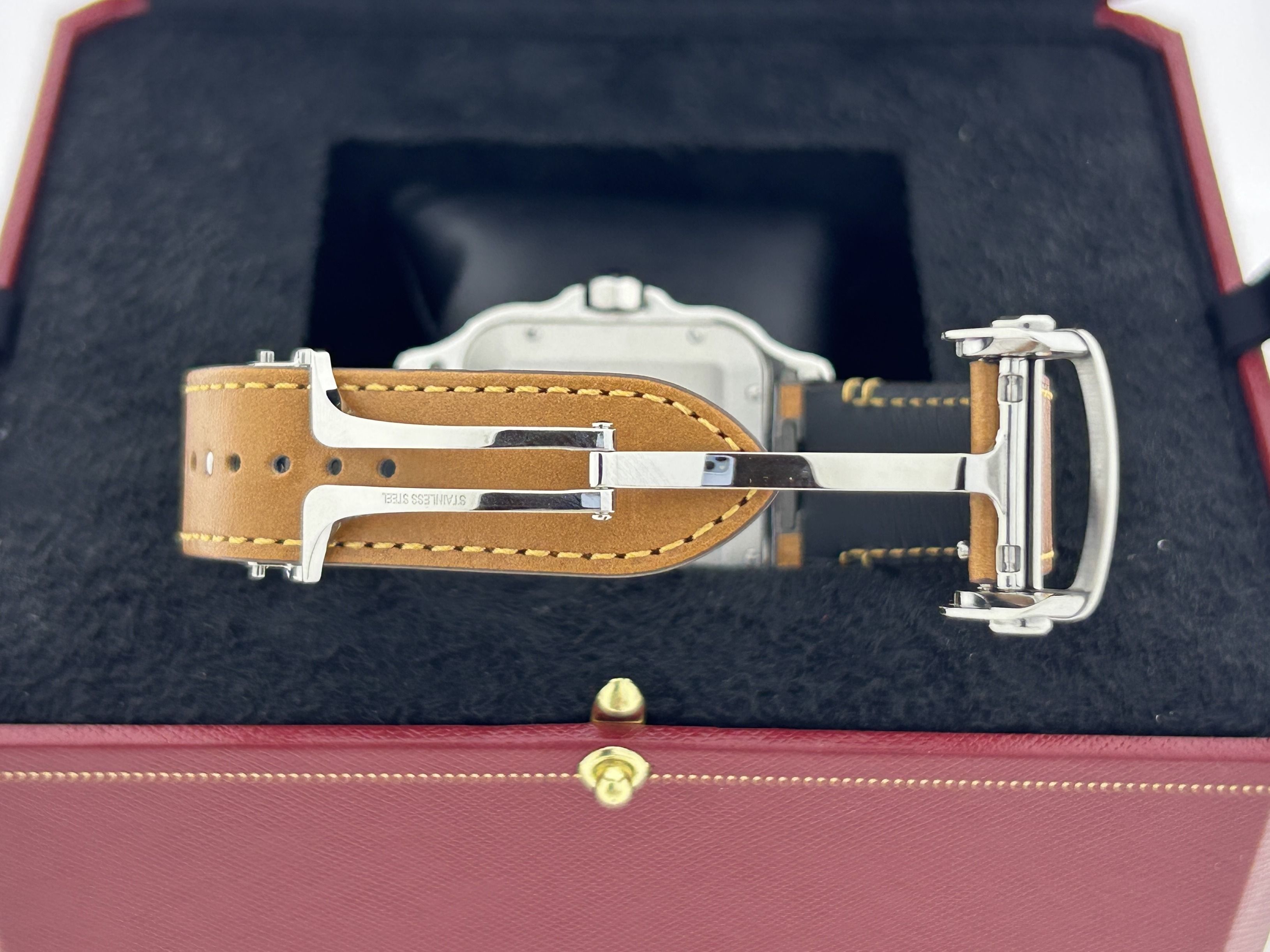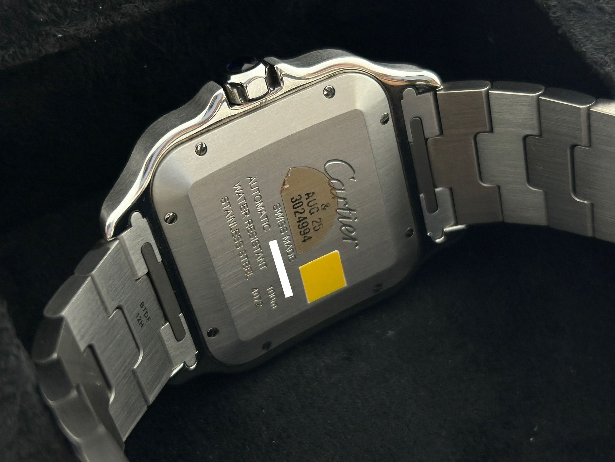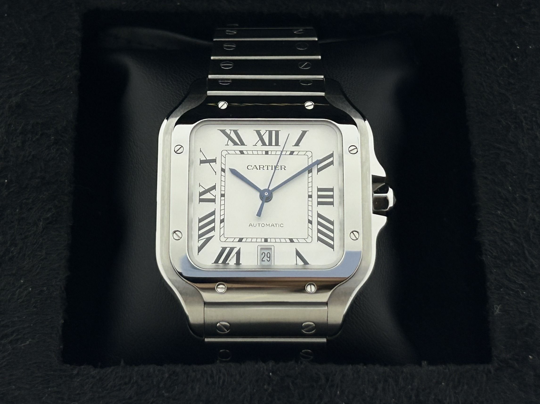 Un orologio Cartier Santos Large in acciaio, rif. 4072/WSSA0018, fullset, del 2024. L'orologio ha una cassa in acciaio di 47,4 x 39,8 mm con bracciale in acciaio. Il Cartier Santos ha un quadrante bianco con numeri romani. L'orologio ha un movimento automatico. La Cartier è mai indossata e proviene dal 2024, l'orologio ha alcune etichette sul retro della cassa. Il Santos è fullset, viene fornito con la sua scatola originale, certificato e un cinturino in pelle marrone Cartier.