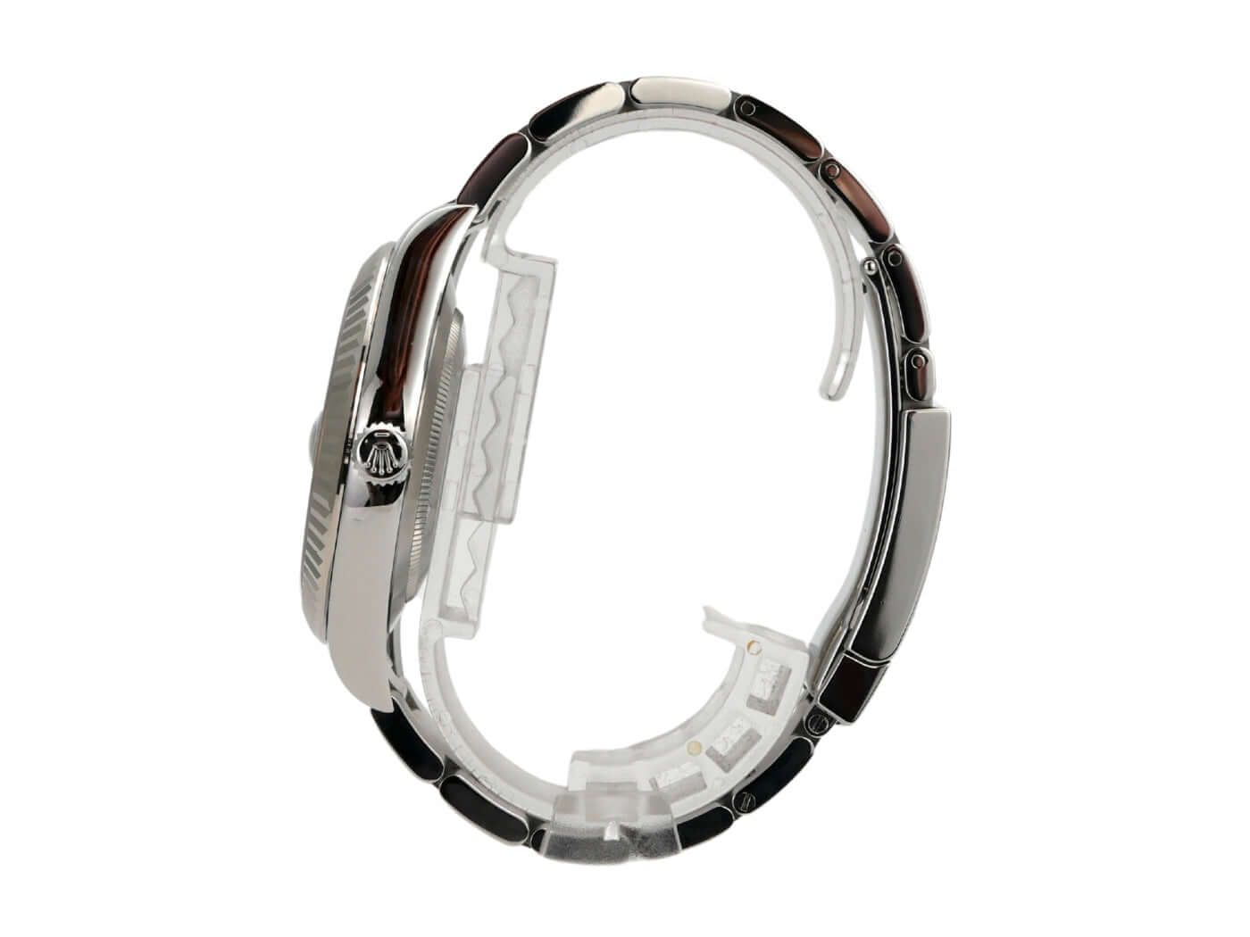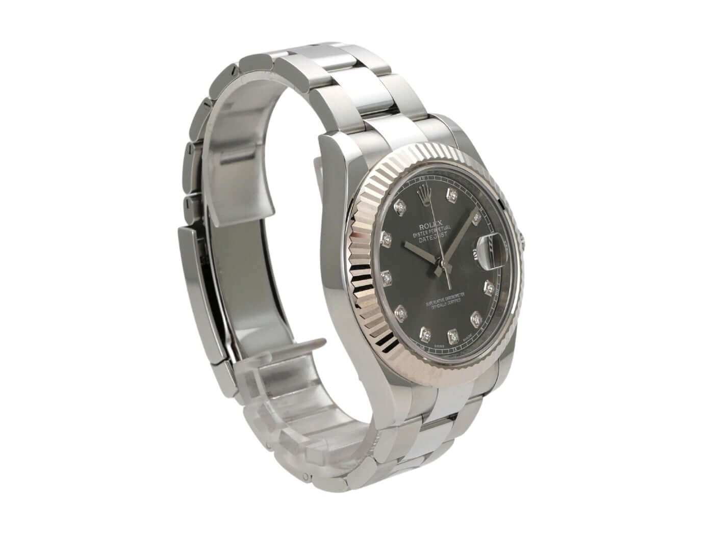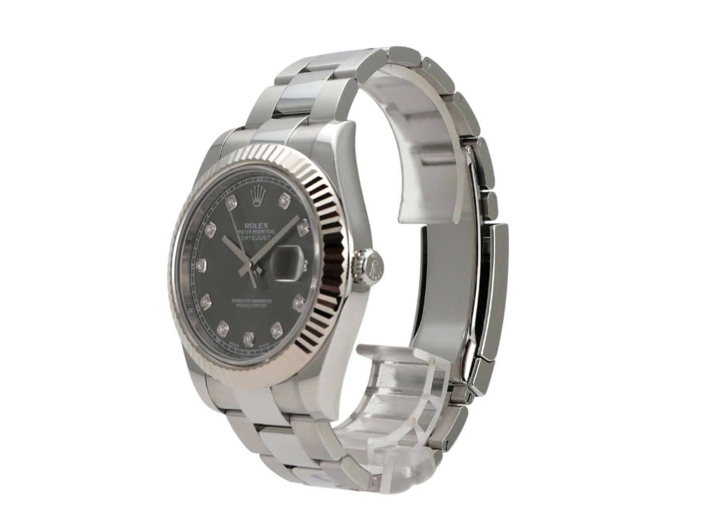Cassa in acciaio inossidabile lucidato e satinato, diametro della cassa 41 mm, altezza della cassa 12 mm, lunetta in oro bianco 18 kt scanalata, bracciale Oyster in acciaio inossidabile lucidato e satinato con chiusura pieghevole, quadrante in rodio con diamanti applicati, movimento automatico, calibro di manifattura Rolex 3136 con 31 rubini, indicazione della data con lente d'ingrandimento alle 3, cronometro, vetro zaffiro antigraffio, corona a vite, fondello della cassa in acciaio inossidabile a vite, impermeabile fino a 10 bar.