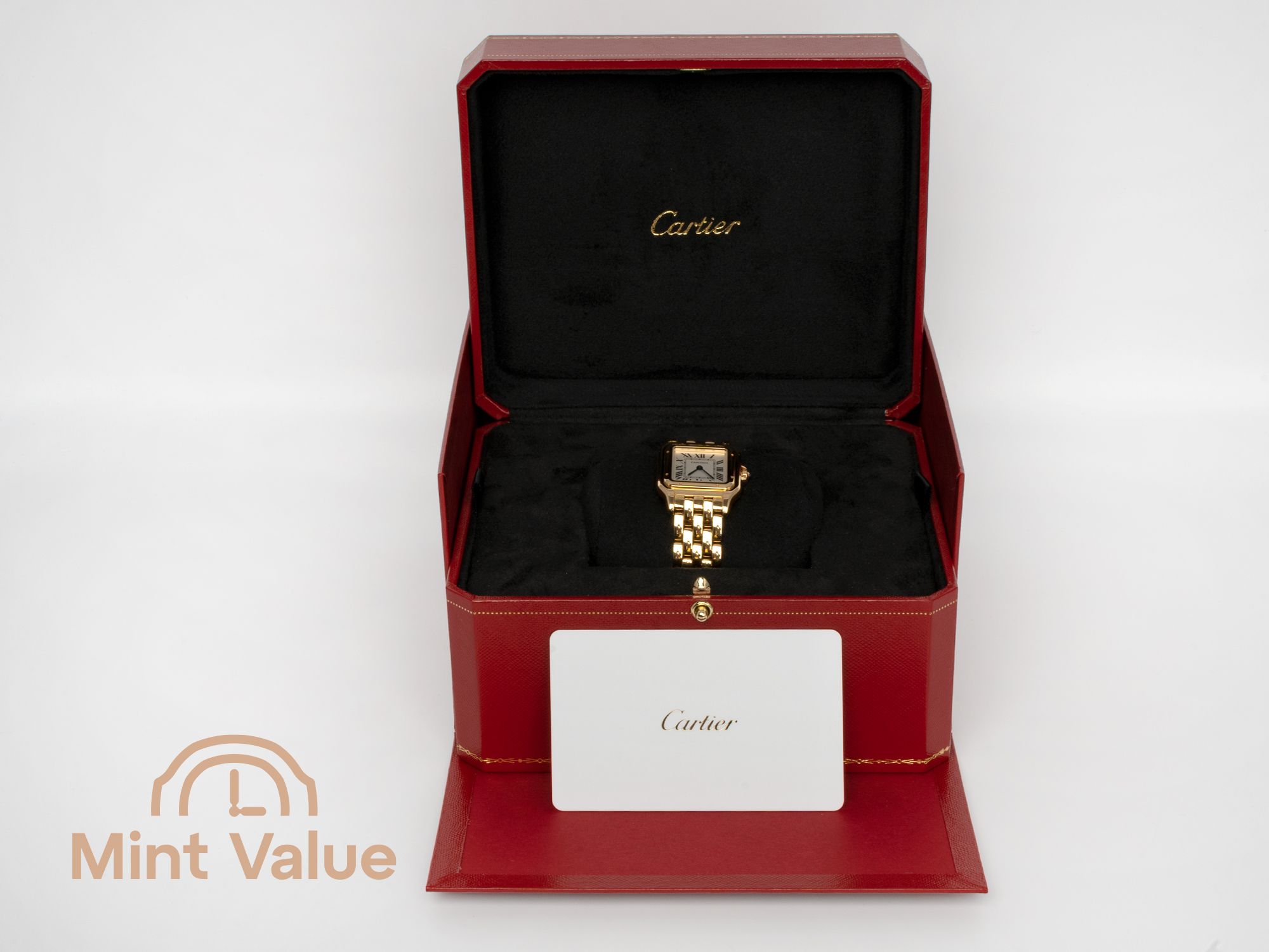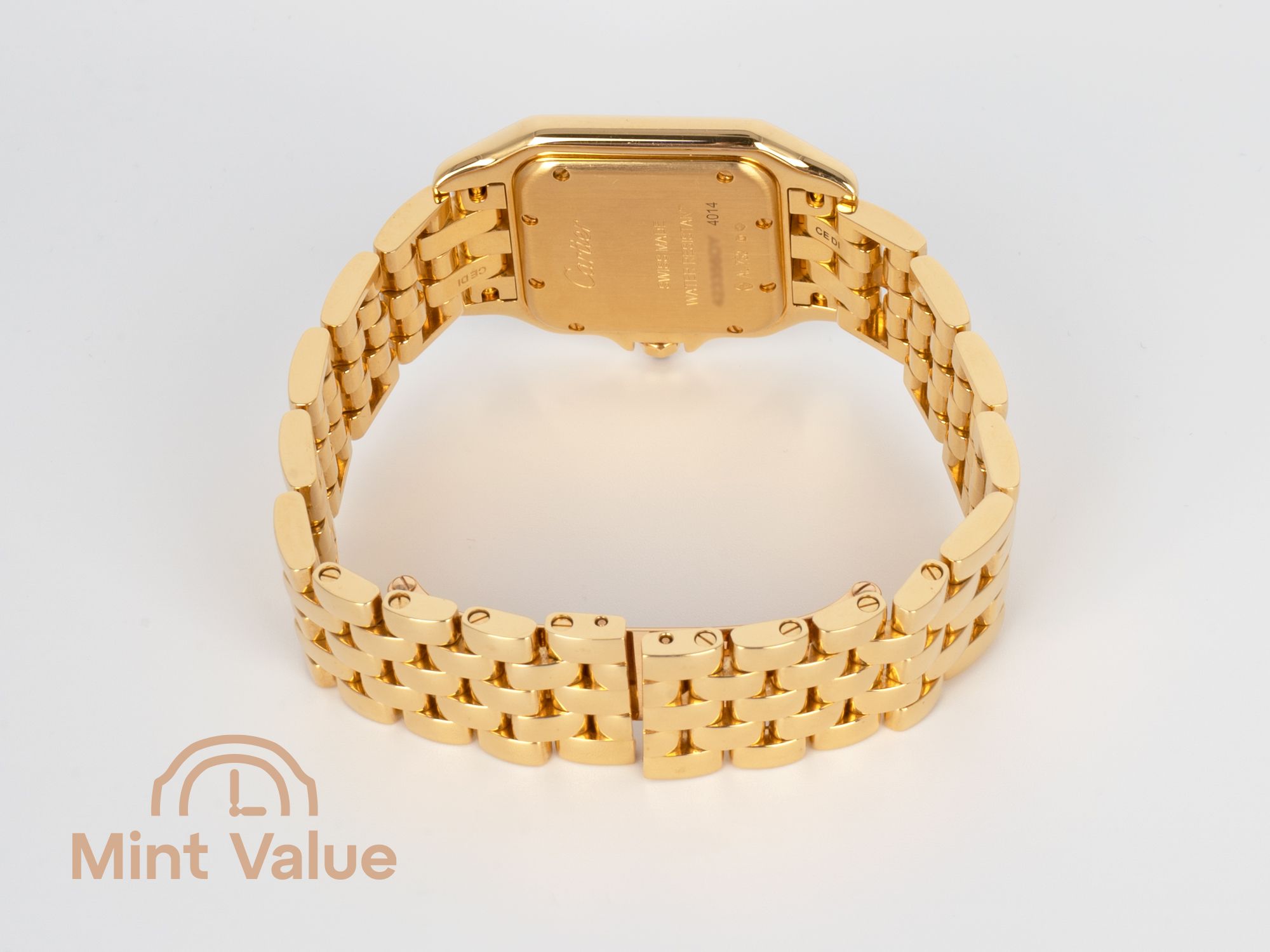 Cartier Panthère De Cartier Yellow Gold WGPN0009The Cartier Panthère de Cartier WGPN0009 is a luxurious, jewellery-inspired timepiece in fully 18K yellow gold. It's combining Cartier’s signature elegance with haute joaillerie craftsmanship. With its medium-sized squared case (27 × 37 mm), silvered dial, Roman numerals, and sleek gold bracelet, this model captures the fluid grace of the panther — a long-standing Cartier emblem.