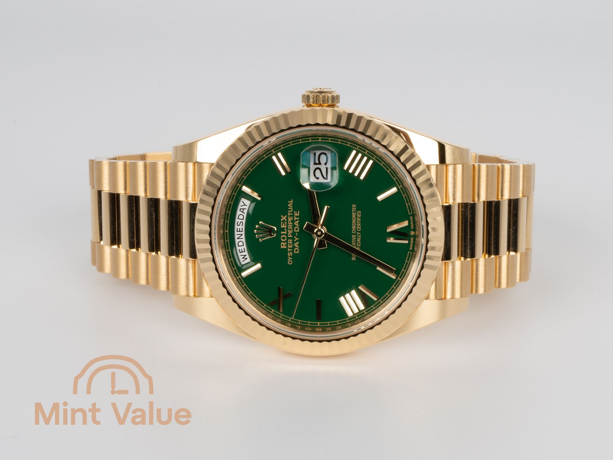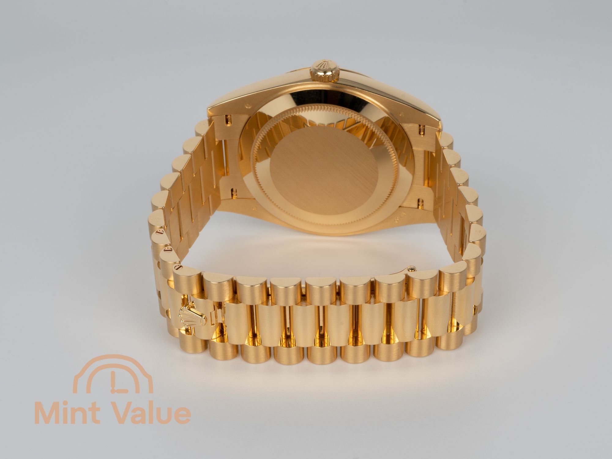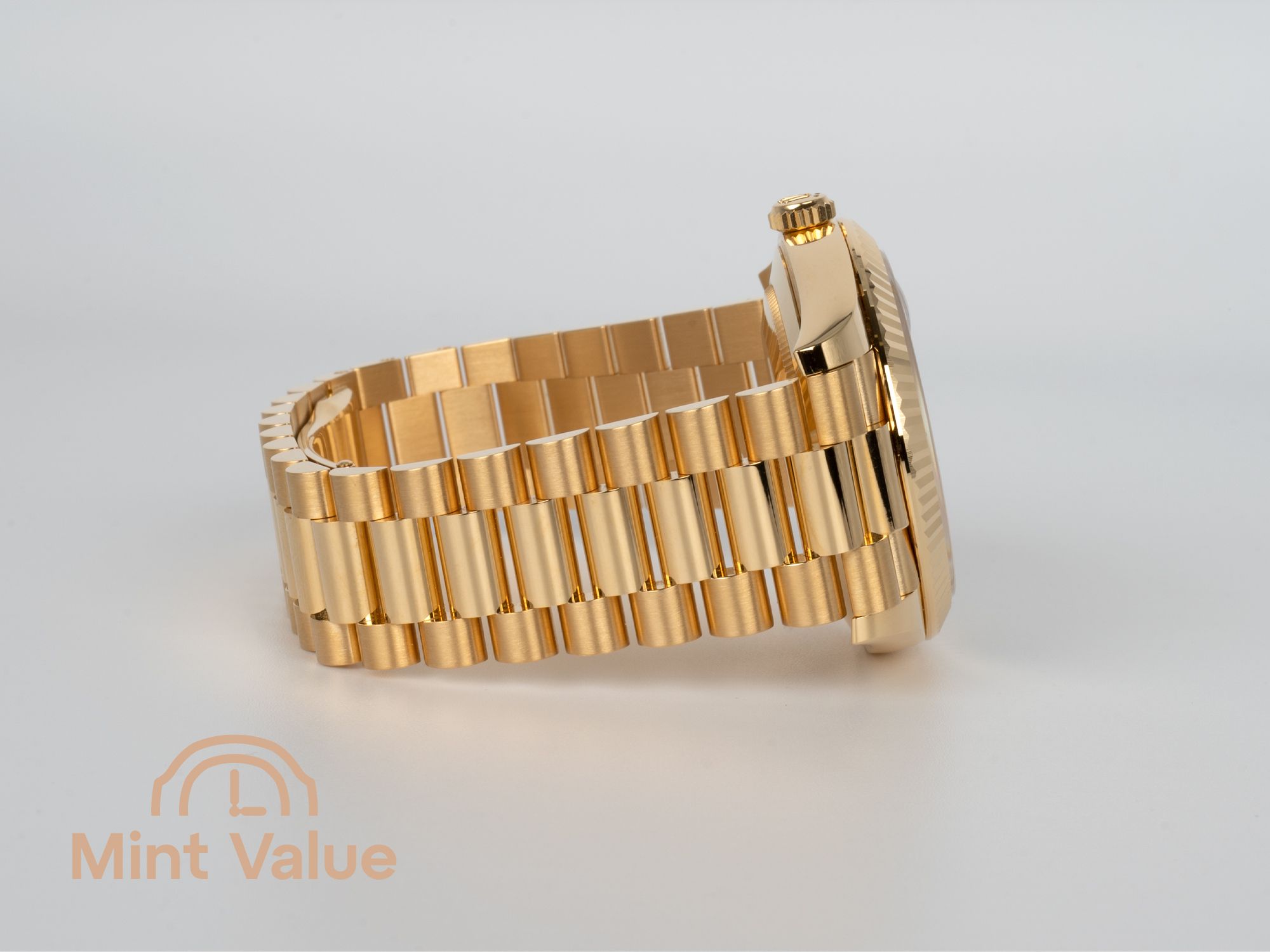 The fluted bezel, polished yellow-gold case, and President bracelet form an unmistakable silhouette — one that speaks of craftsmanship perfected over decades. Each dial variation, whether champagne, green, or white, reflects light with refined depth, emphasizing the sophistication that has made this reference timeless.