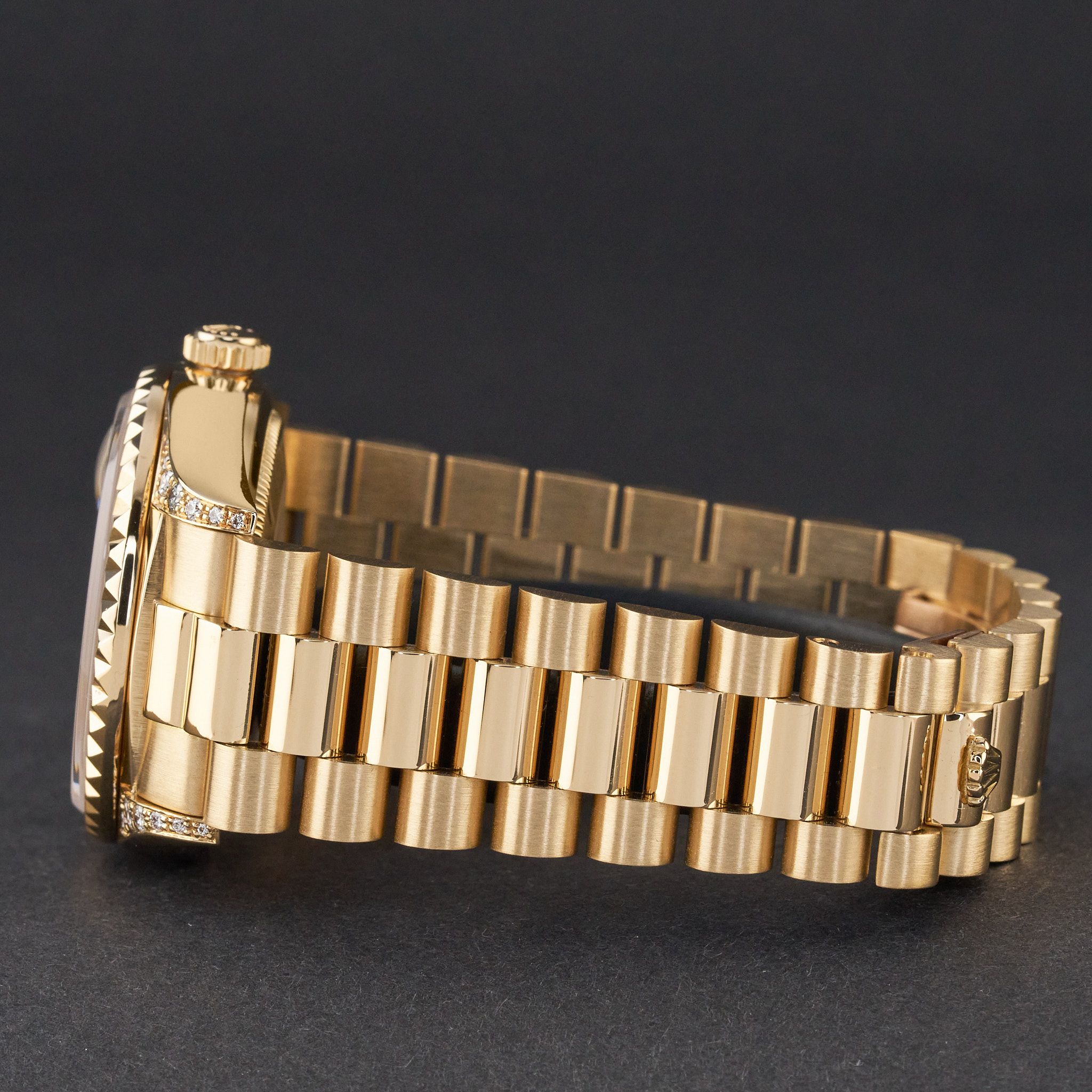 This Rolex Day-Date 18018 features a Champagne string small diamond dial and is crafted from 18K yellow gold, with a production year of 1987.Case No: 986XXXX