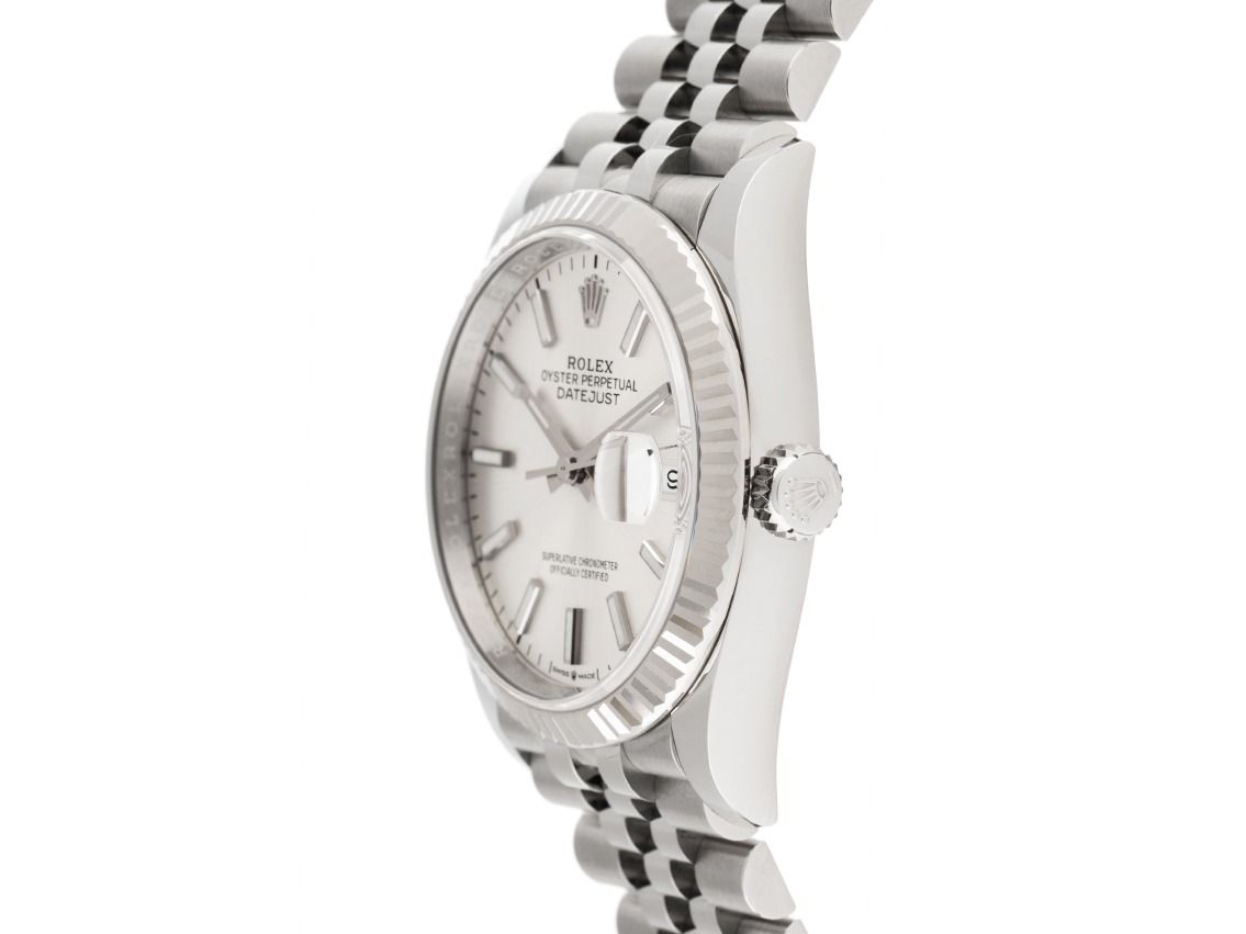Rolex Datejust Stahl 18kt Weißgold Automatik Armband JubiléGehäuse Edelstahl poliert und satiniert, Gehäusedurchmesser ohne Krone 36mm, Gehäusehöhe 11,7mm. Lünette 18kt Weißgold geriffelt und poliert. Armband Jubilé Edelstahl poliert und satiniert, Faltschließe Edelstahl mit Hersteller-Logo. Zifferblatt silberfarben mit aufgesetzten weißgoldenen Indexen und weißgoldenen Zeigern. Uhrwerk Automatik, Chronometer mit Zeugnis, Rolex Manufakturkaliber 3235 mit 31 Edelsteinen. Anzeige von Stunde, Minute und Sekunde über Zeiger aus der Mitte mit Sekundenstopp zur sekundengenauen Einstellung der Uhrzeit, Datumsanzeige mit Schnellverstellung unter Glaslupe bei 3 Uhr. Saphirglas kratzfest. Krone verschraubbar mit Hersteller-Logo. Boden Edelstahl verschraubt. Gewicht der Uhr inklusive Armband 120g, Länge des Armbandes inklusive Gehäuse 180mm. Referenznummer: 126234, Gehäusenummer: 4776CXXX, ID: P2042190001225H-13800/9450, Artikelnummer: 10000083608. Mit Gangkontrolle und kompletter äußerlicher Aufarbeitung von Dezember 2025. Original Rolex Box mit Umkarton und Garantie Papiere von September 2021, neue Rolex Garantie Karte ohne Ländercode sowie Beschreibung, Ledermäppchen, Rolex Chronometer-Siegel und Watchregister Auszug von Dezember 2025, The Watch Register Zertifikat / ohne Eintrag (Internationale Datenbank für verlorene oder gestohlene Uhren), Full Set. Superschnäppchen, Kapitalanlage mit Wertsteigerungspotential. Wie Neu. Lieferzeit sofort.