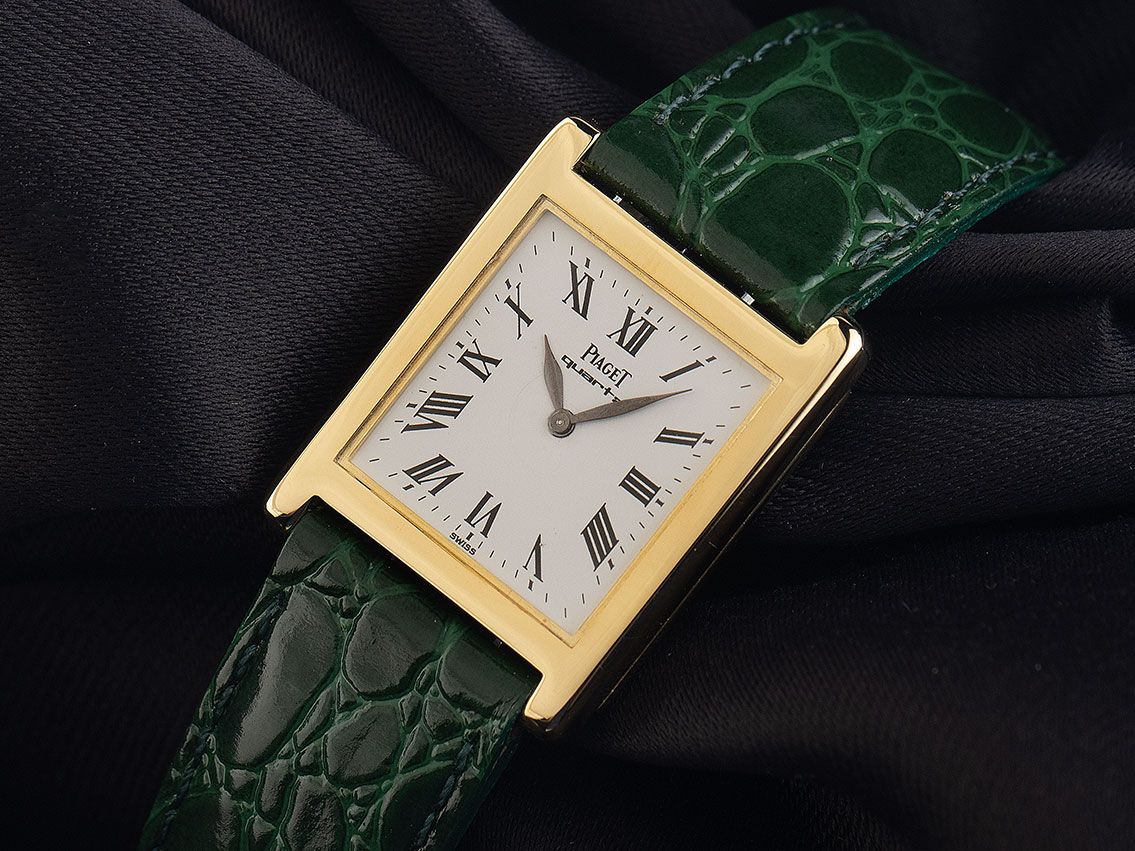 Cassa in oro giallo 18kt lucido, dimensioni della cassa senza corona (L x P x A) 29 x 23 x 5,2mm. Cinturino in pelle verde con cucitura decorativa, larghezza dell'ansa 17mm, fibbia a perno in oro giallo placcato. Quadrante bianco con numeri romani neri e lancette nere. Movimento al quarzo, calibro Piaget 7P3. Indicazione di ore e minuti tramite lancette centrali. Vetro zaffiro antigraffio. Corona zigrinata sul fondello. Fondello in oro giallo 18kt avvitato quattro volte e inciso. Peso dell'orologio incluso il cinturino 28g. Numero di riferimento: 70800, numero di cassa: 324XXX, anno di produzione: 1988, ID: P111738000725H-5100, numero articolo: 10000081063. Con controllo del movimento e completa revisione estetica di luglio 2025. Scatola originale Piaget e estratto del Watch Register di luglio 2025, certificato The Watch Register / senza registrazione (database internazionale per orologi smarriti o rubati). Investimento con potenziale di apprezzamento, pezzo da collezione estremamente raro, quasi mai indossato. Ottime condizioni. Tempi di consegna immediati.