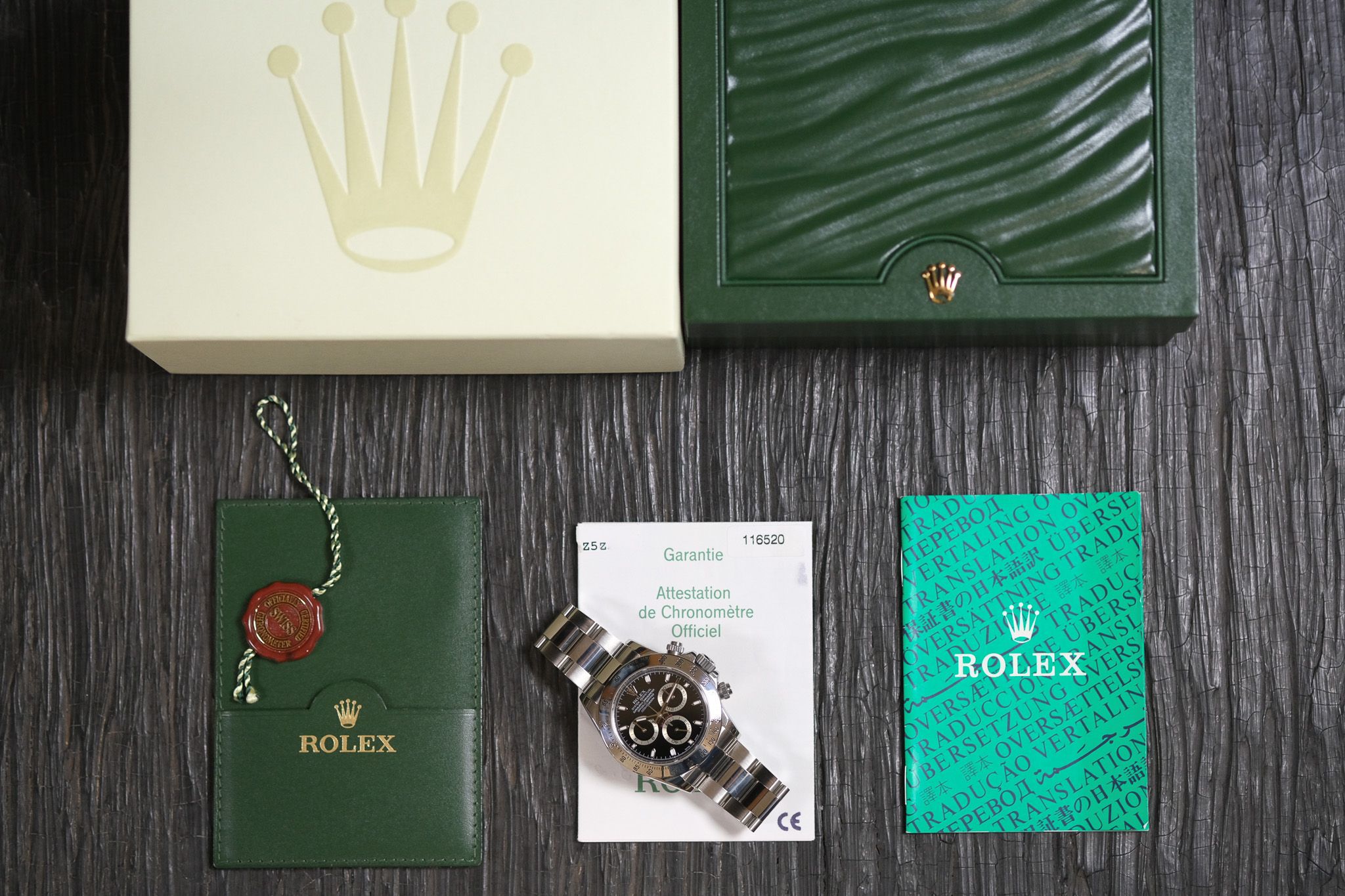A beautifully preserved Rolex Daytona 116520 – complete with LC100 papers and box, in the desirable black-dial configuration, and in a condition that makes it ideal both for everyday wear and as a strong addition to any collection.