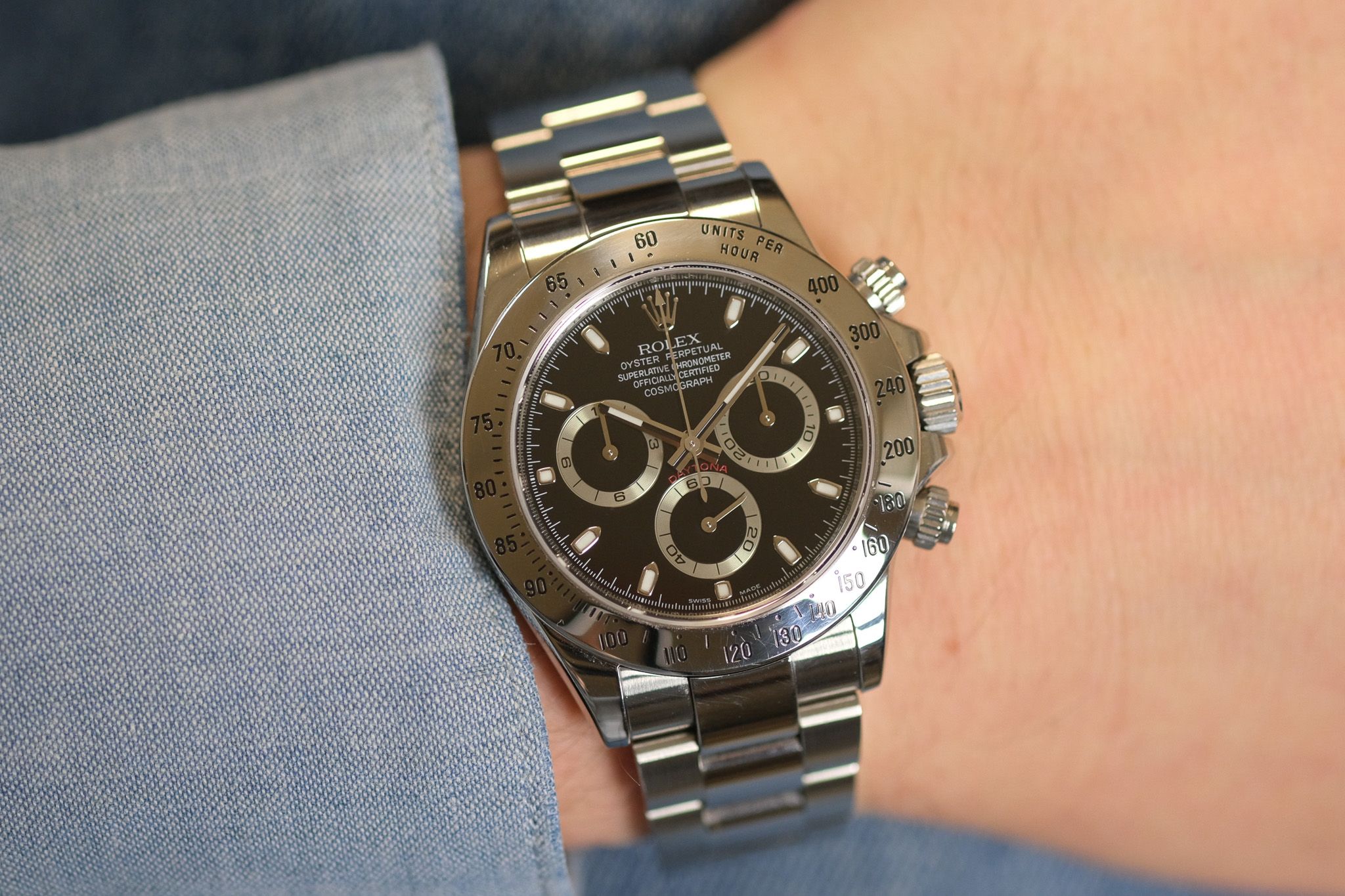 Il quadrante nero e le lancette sono in condizioni impeccabili, conferendo al Daytona la sua profondità distintiva e presenza sportiva.