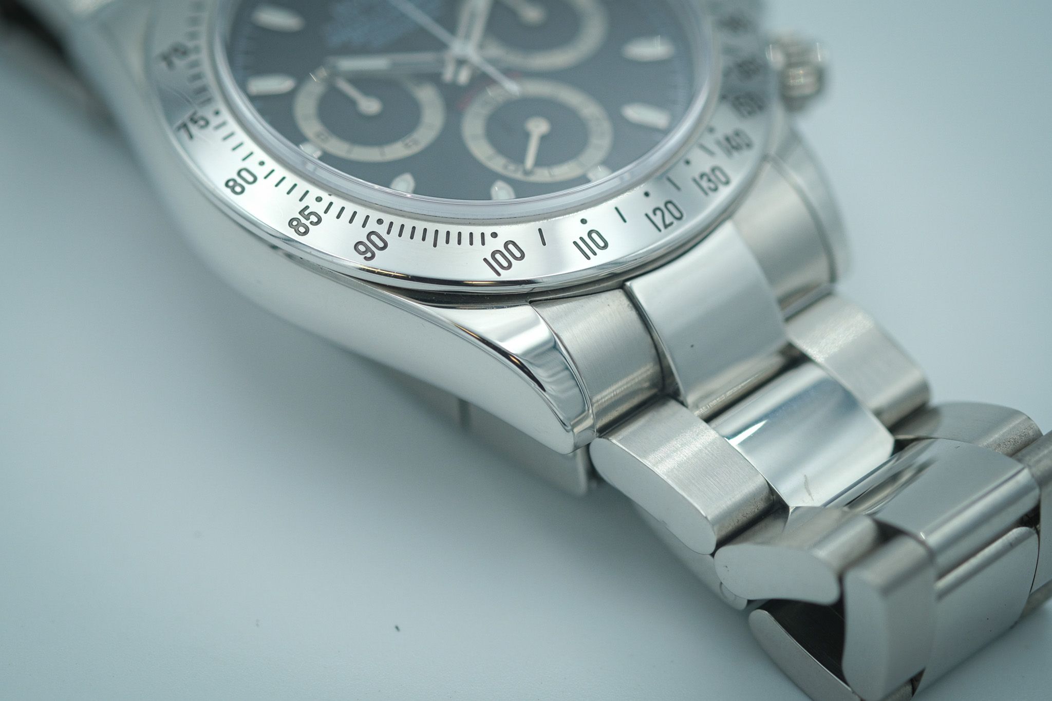 The black dial and hands are in flawless condition, giving the Daytona its signature depth and sporty presence.