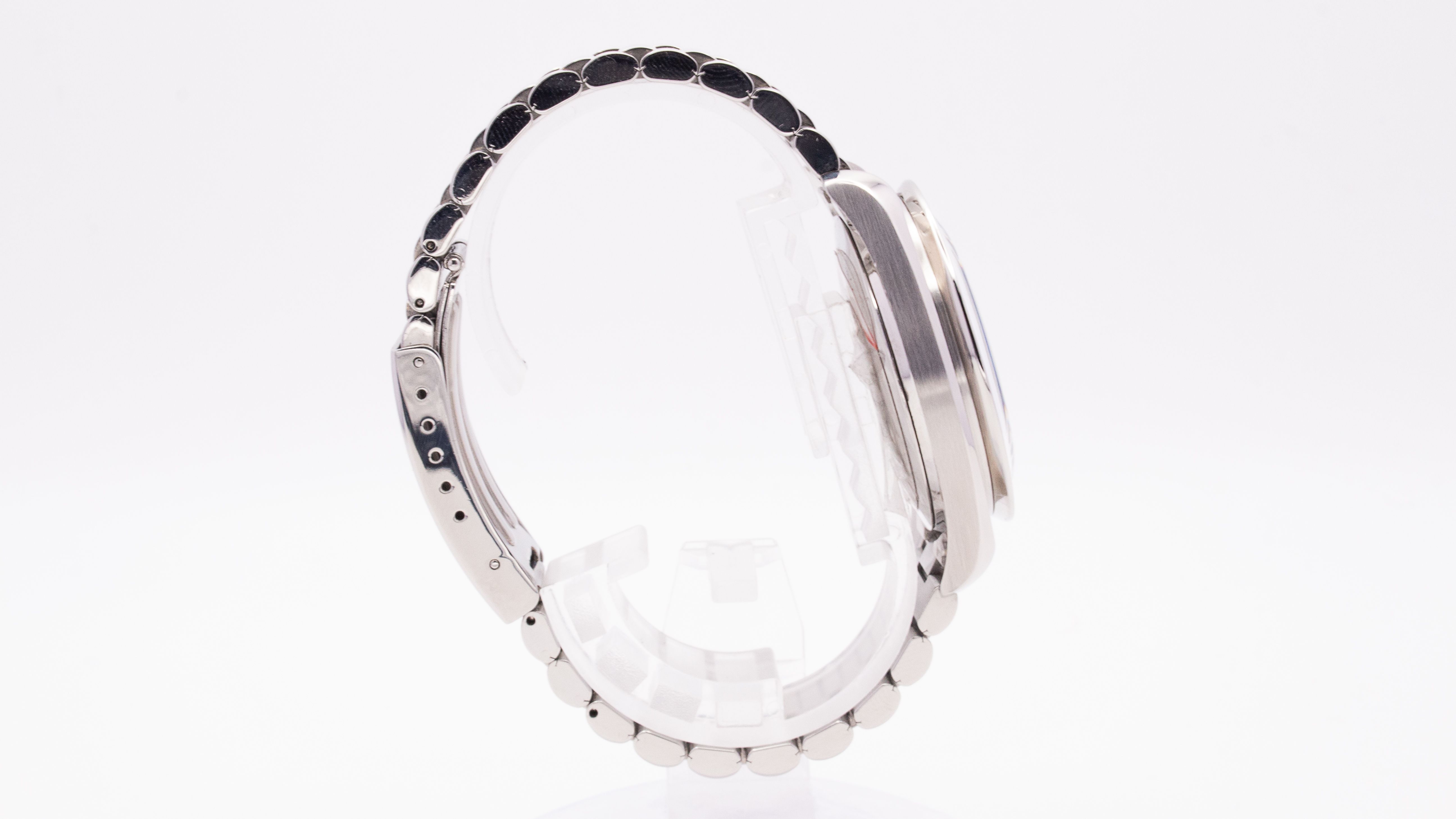 Das originale Stahlband passt derzeit für einen Handgelenksumfang von ca. 18 cm. Zusätzliche Bandglieder sind vorhanden und können auf Wunsch direkt ergänzt werden. Das Band zeigt ebenfalls nur sehr leichte, altersgerechte Tragespuren.