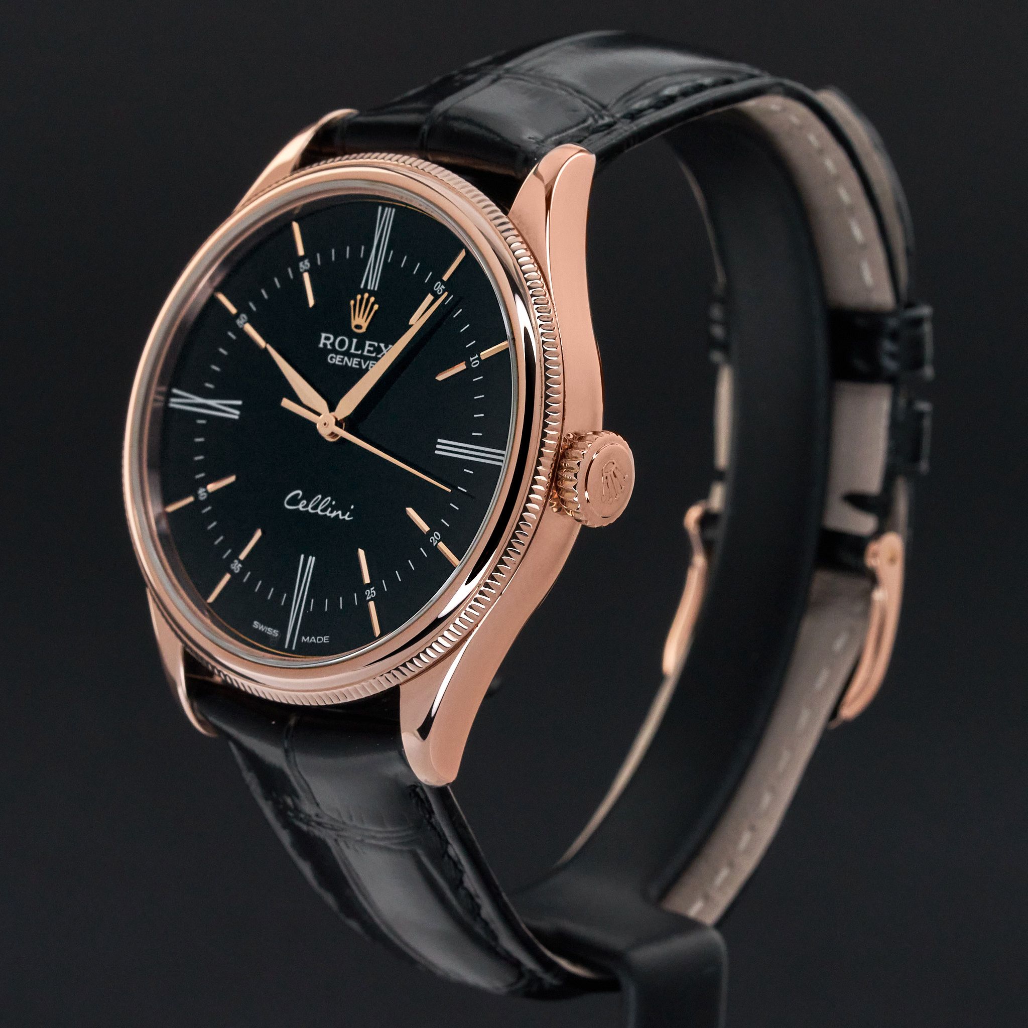 This Rolex Cellini Time 50505 features a Black Roman dial and is crafted from 18K rose gold, with a production year of 2018.Case No: 330PXXXX