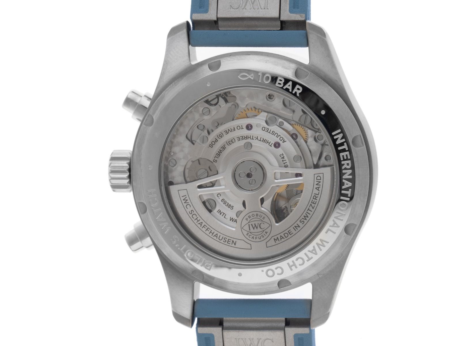 Cassa in acciaio, lucidata e satinata, diametro della cassa senza corona 41mm, altezza della cassa 14,5mm. Cinturino in caucciù blu chiaro con sistema EasX-CHANGE®, larghezza dell'ansa 20mm, fibbia IWC in acciaio con logo del produttore, quadrante blu chiaro con numeri arabi luminescenti e indici, oltre a lancette luminescenti. Movimento automatico, cronografo, calibro di manifattura IWC 69385 con 33 rubini, riserva di carica di circa 46 ore. Indicazione di ore e minuti tramite lancette centrali, piccolo secondo con fermo secondo per la regolazione precisa dell'ora a 6 ore, indicazione del giorno della settimana in inglese e data con regolazione rapida a 3 ore. Vetro zaffiro antigraffio. Corona a vite con logo del produttore. Fondello in acciaio avvitato e inciso con finestra in vetro zaffiro. Peso dell'orologio incluso il cinturino 122g. Impermeabile fino a 10 ATM. Numero di riferimento: IW388117, ID: P210580001225H-7700, numero articolo: 10000083843. Scatola originale IWC e documenti di garanzia di settembre 2025, oltre a descrizione e estratto dal Watch Register di dicembre 2025, certificato The Watch Register / senza registrazione (database internazionale per orologi smarriti o rubati), inclusa la ricevuta d'acquisto originale, Full Set. Mai indossato. Tempi di consegna immediati.