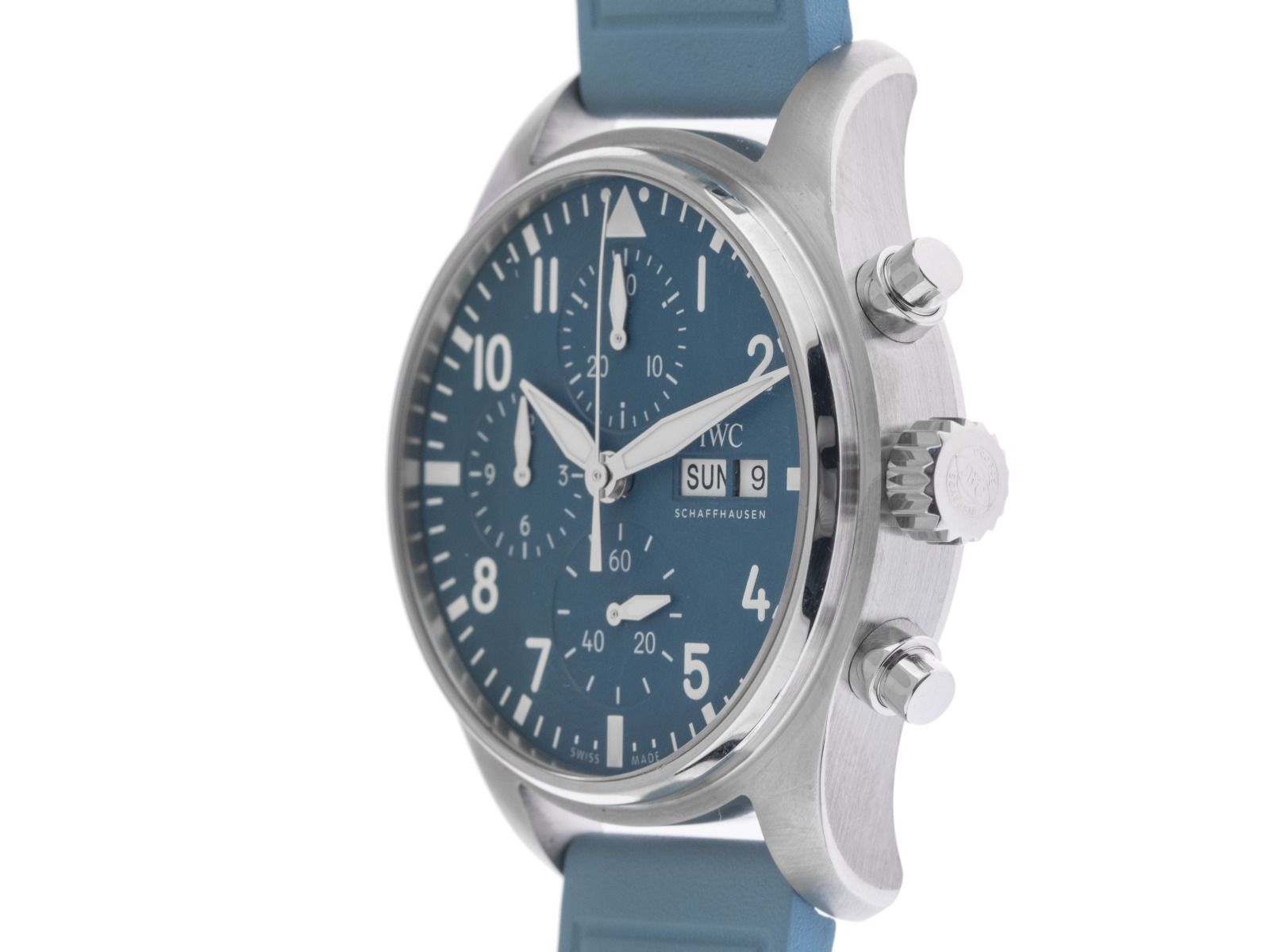IWC Pilot's Watch Day-Date Stahl Automatik Chronograph Armband KautschukGehäuse Edelstahl, poliert und satiniert, Gehäusedurchmesser ohne Krone 41mm, Gehäusehöhe 14,5mm. Armband Kautschuk hellblau mit EasX-CHANGE®-System, Anstoßbreite 20mm, IWC Stiftschließe Edelstahl mit Hersteller-Logo, Zifferblatt hellblau mit arabischen Leuchtziffern und Indexen sowie Leuchtzeigern. Uhrwerk Automatik, Chronograph, Manufakturkaliber IWC 69385mit 33 Edelsteinen, Gangreserve ca. 46 Stunden. Anzeige von Stunde und Minute über Zeiger aus der Mitte, kleine Sekunde mit Sekundenstopp zur sekundengenauen Einstellung der Uhrzeit bei 6 Uhr, Wochentaganzeige in Englisch und Datumsanzeige mit Schnellverstellung bei 3 Uhr. Saphirglas kratzfest. Krone verschraubbar mit Hersteller-Logo. Boden Edelstahl verschraubt und graviert mit Saphirglas Sichtfenster. Gewicht der Uhr inklusive Armband 122g. Wasserdicht bis 10 ATM. Referenznummer: IW388117, ID: P210580001225H-7700, Artikelnummer: 10000083843. Original IWC Box und Garantie Papiere von September 2025 sowie Beschreibung und Watchregister Auszug von Dezember 2025, The Watch Register Zertifikat / ohne Eintrag (Internationale Datenbank für verlorene oder gestohlene Uhren), inkl. original Kaufrechnung, Full Set. Ungetragen. Lieferzeit sofort.
