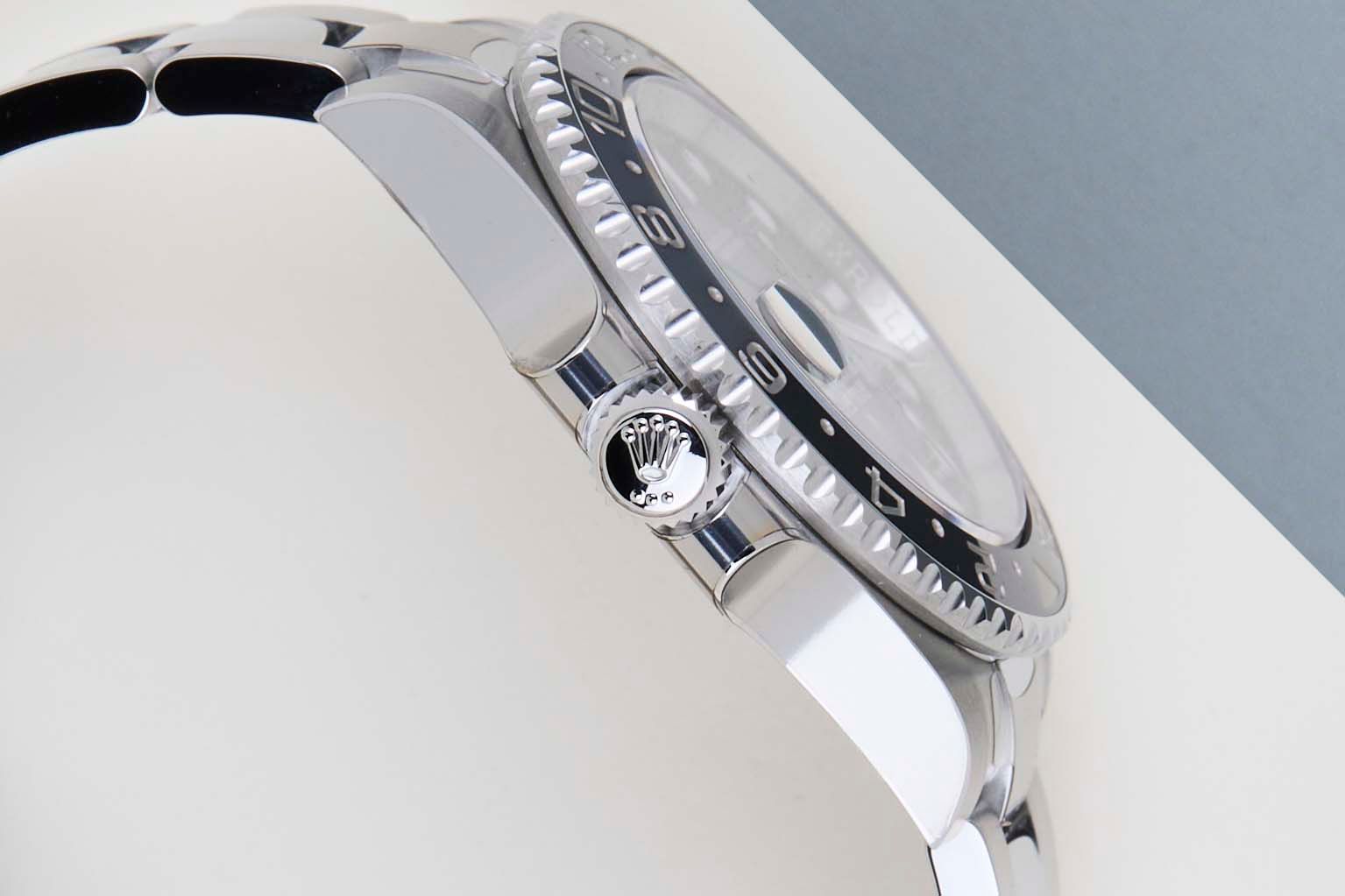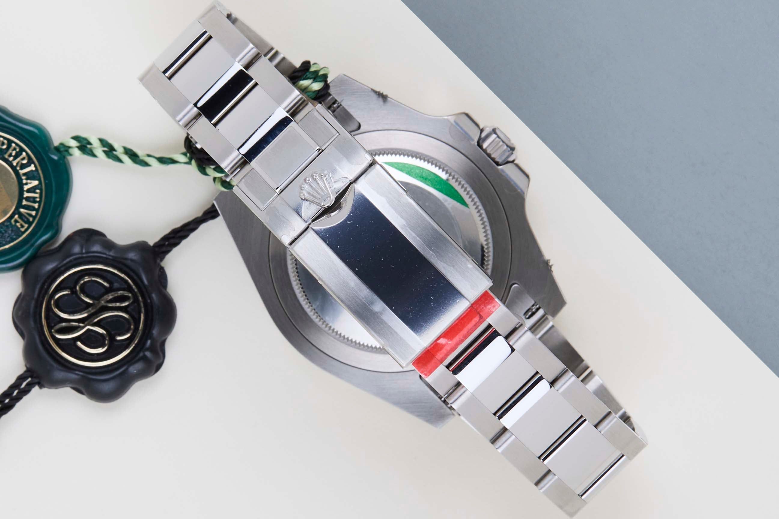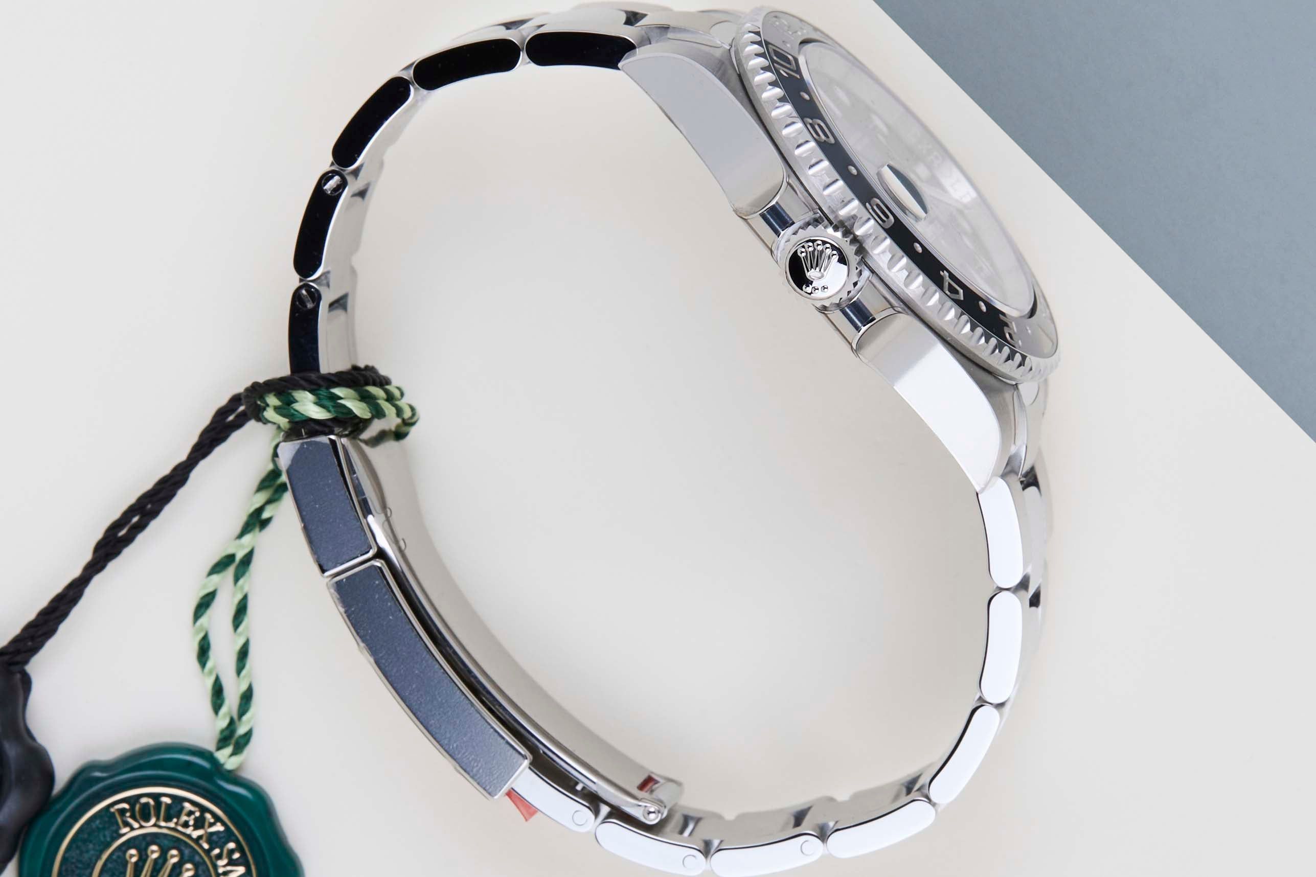 Questo GMT-Master è realizzato in acciaio inossidabile ed è dotato di un bracciale Oyster, equipaggiato con l'Easylink. Questa estensione consente all'indossatore di allungare o accorciare il bracciale di 5 millimetri, migliorando la vestibilità e l'usabilità dell'orologio.