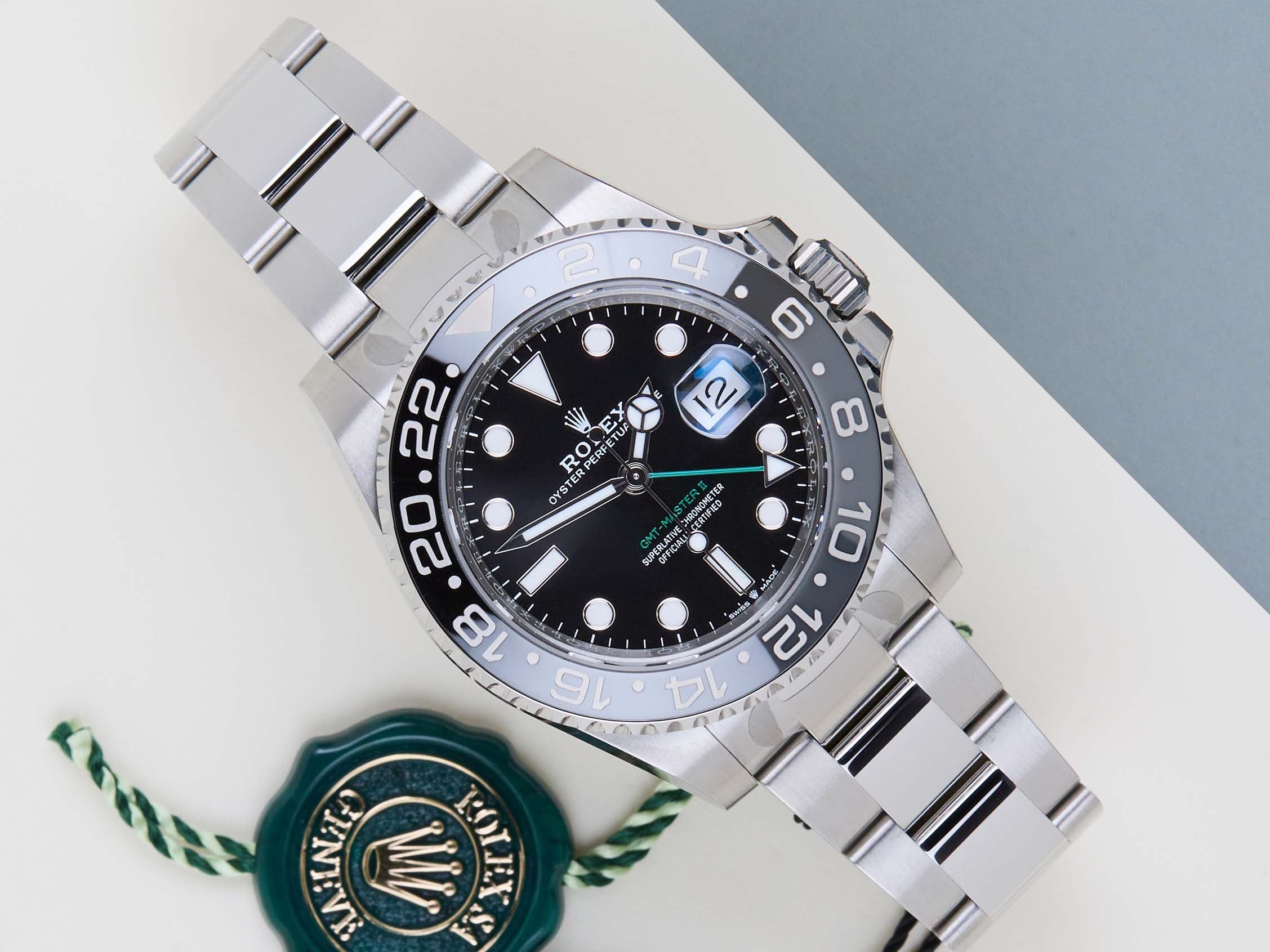 New & Unworn | Full Set | International Rolex Warranty Until October 2030 The Rolex GMT was originally designed in collaboration with Pan American Airways and issued to their crews on long-haul flights. The dual time zone can track local and home time, which is a useful tool for pilots and those who are traveling a lot across different time zones.The reference 126710 is the second generation of the GMT-Master II with a Ceramic Bezel. The material to make this bezel is called 'Cerachrom', which was developed completely in-house by Rolex to be highly scratch-resistant.This GMT is equipped with the Black and Grey Bezel, which can be derived from the reference 126710GRNR, Lunette Gris Noir.This GMT-Master is made of stainless steel and is fitted with an Oyster bracelet, which is equipped with the Easylink. This extension, allows the wearer to either extend or shorten the bracelet by 5 millimeters, improving the wearability and usability of the watch.This Rolex GMT-Master II is New & Unworn and comes with the original Rolex Warranty Card and Box. Furthermore, the watch still has International Rolex Warranty until October 2030.