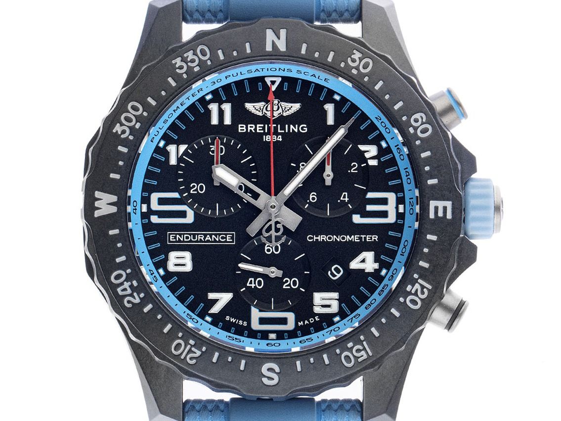 Breitling Endurance Pro Breitlight® Superquarz Chronograph Armband KautschukGehäuse Breitlight® satiniert, Gehäusedurchmesser ohne Krone 38mm, Gehäusehöhe 12,1mm. Lünette Breitlight® mit Windrose, beidseitig drehbar. Armband Kautschuk blau, Anstoßbreite 18mm, Stiftschließe Breitlight® mit Hersteller-Logo. Zifferblatt schwarz mit aufgesetzten arabischen Ziffern und Edelstahl Leuchtzeigern. Uhrwerk Superquartz thermokompensiertes Werk, Chronometer mit Zeugnis, Kaliber Breitling 83 mit 6 Edelsteinen. Anzeige von Stunde und Minute über Zeiger aus der Mitte, kleine Sekunde mit Sekundenstopp zur sekundengenauen Einstellung der Uhrzeit bei 6 Uhr, Datumsanzeige mit Schnellverstellung zwischen 4 und 5 Uhr. Saphirglas kratzfest und doppelseitig entspiegelt. Krone mit Flankenschutz und Hersteller-Logo, 2 Dichtungen. Boden Breitlight® 4-fach verschraubt und graviert. Gewicht der Uhr inklusive Armband 46g. Wasserdicht bis 10 ATM. Referenznummer: X83310281B1S1, ID: ST610241401225H-3450, Artikelnummer: 10000083979. Original Breitling Box und Garantie Papiere von 2025 sowie Beschreibung, Full Set. Ungetragen. Lieferzeit sofort.